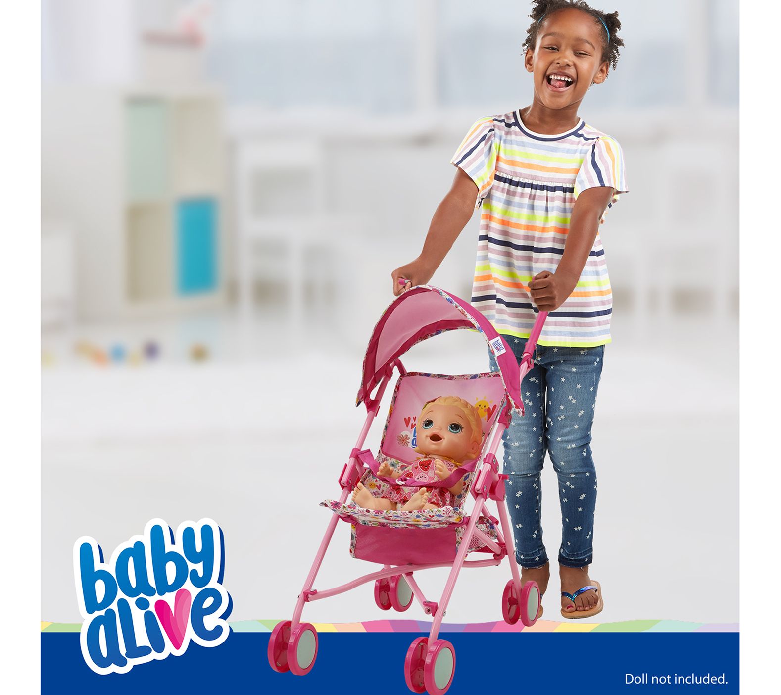 Your little one will adore taking their Baby Alive doll for a stroll with this colorful and fun stroller. Featuring a retractable canopy, adjustable safety harness, and a durable polyester seat, this stroller is perfect for imaginative play. The stroller also folds easily for convenient storage and travel. From Baby Alive.