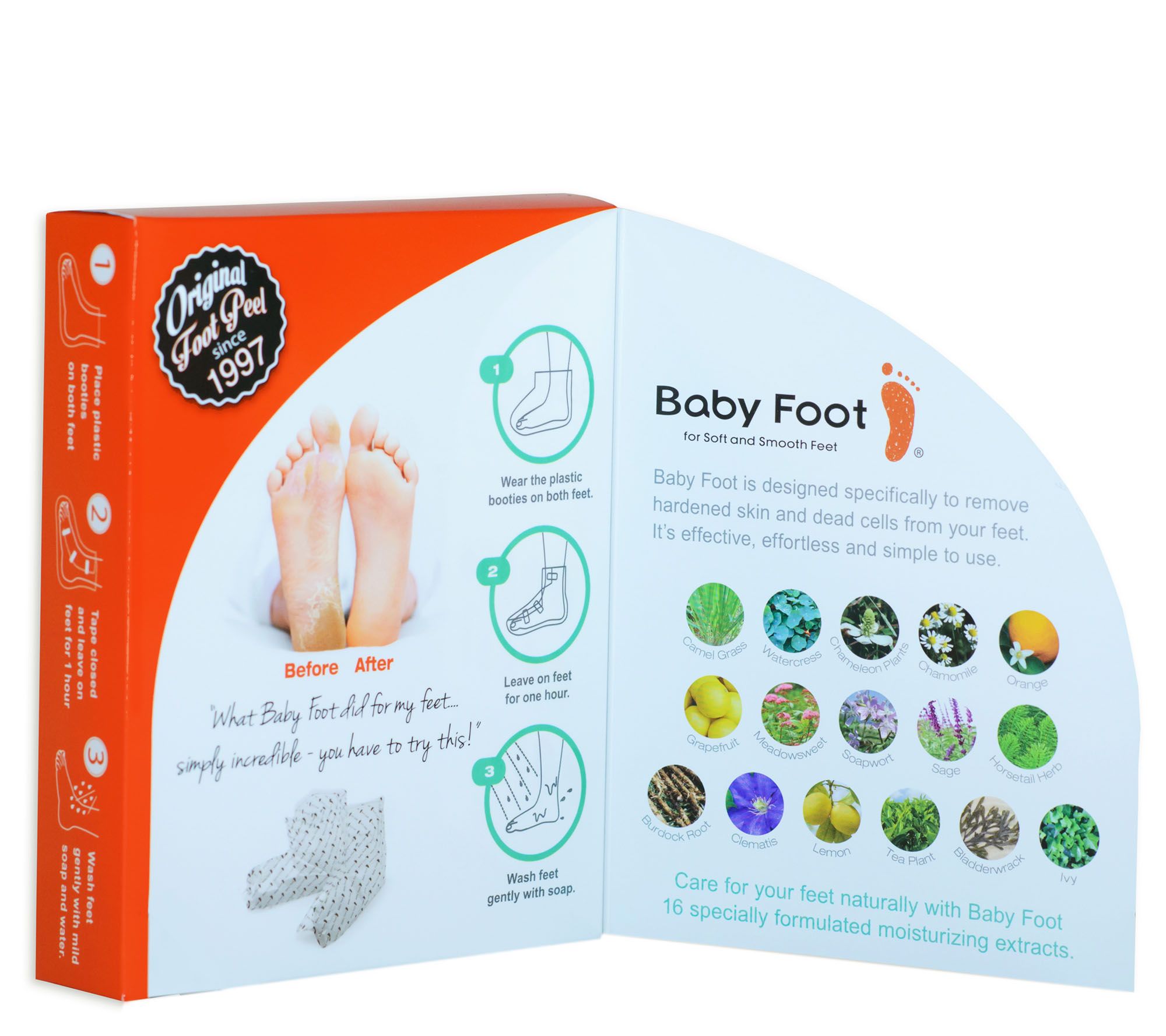 Wear the plastic booties for approximately one hour to allow product to absorb. After completed treatment, remove booties and wash your feet with soap and water. The dry dead skin will begin to peel from five to seven days after the initial application. It could continue to peel for up to two weeks, depending on the amount of dead skin on the feet, leaving your feet soft and smooth, just like a baby's foot.