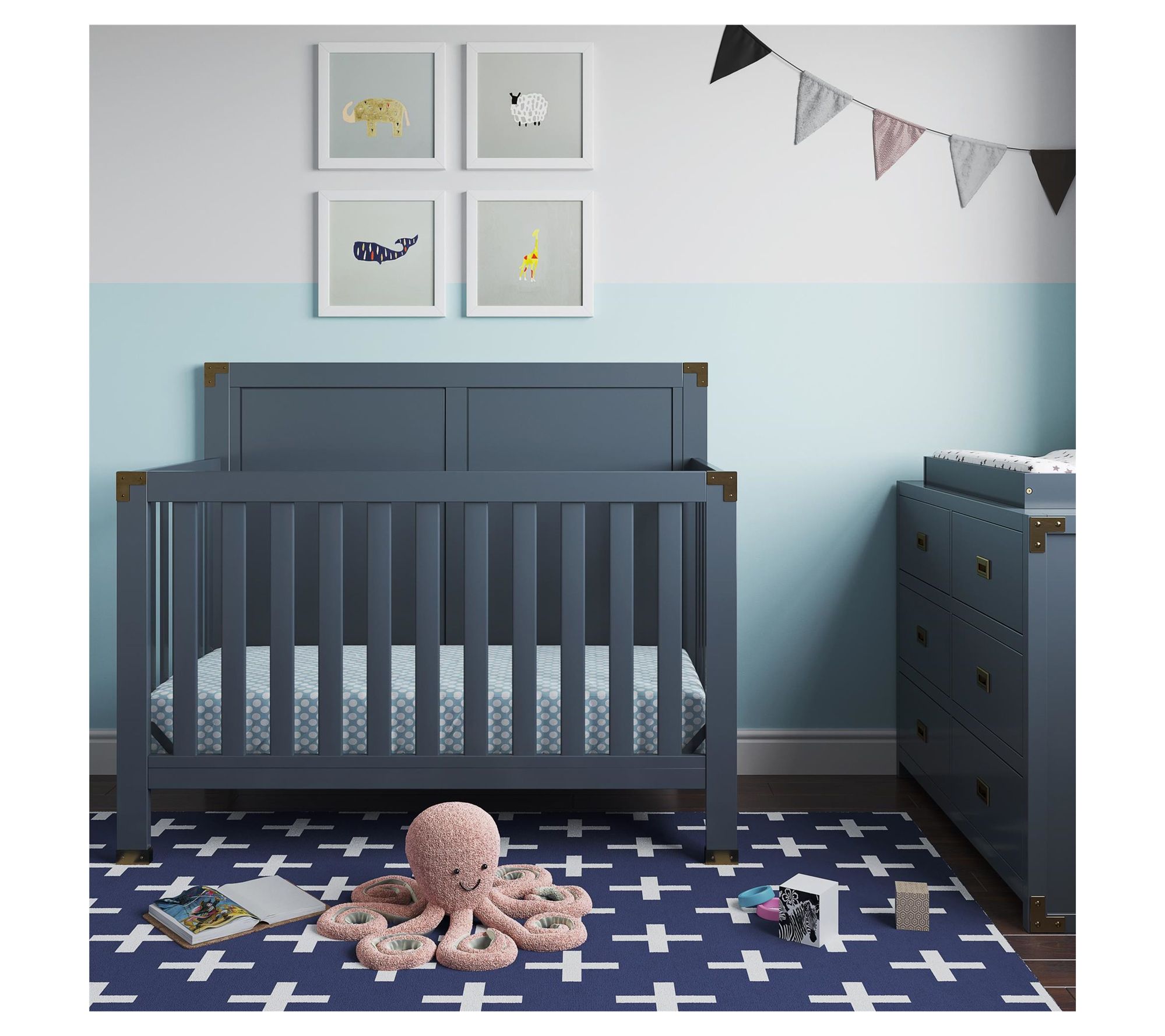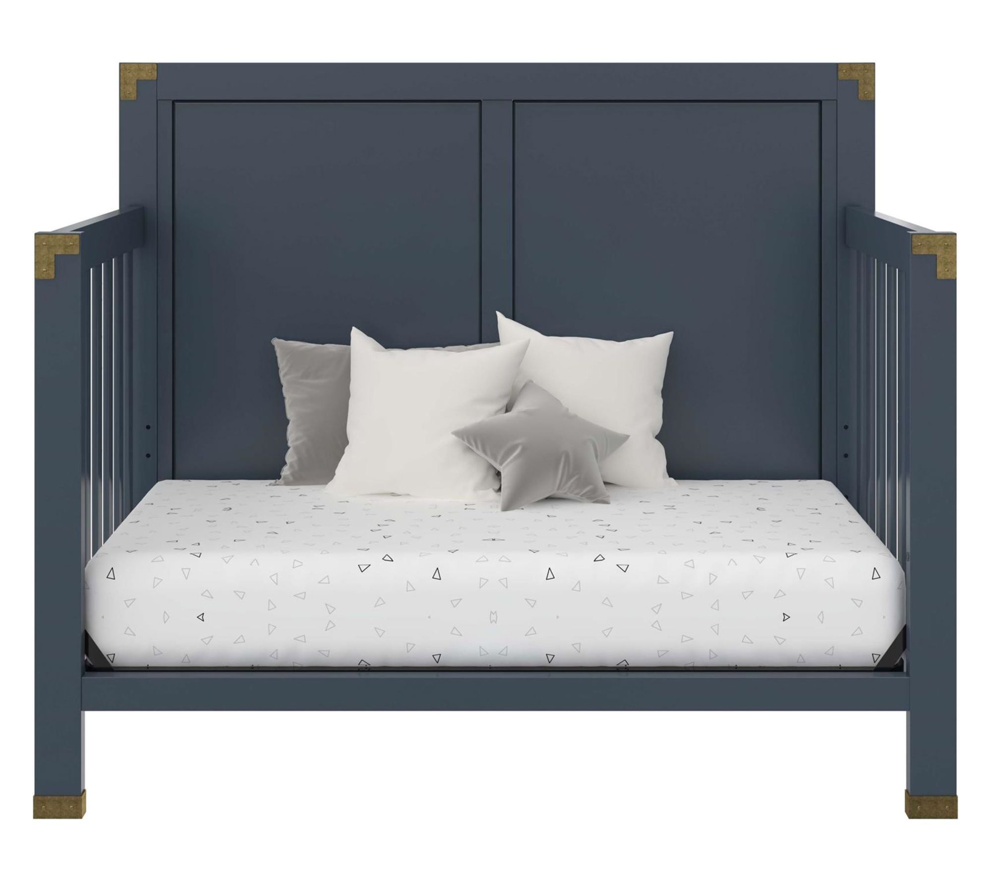 As your little one grows, this versatile crib transforms right along with them -- from cozy newborn sleep space to toddler bed, daybed, and even a full-size bed. Classic campaign styling combines with a rich blue painted finish and aged brass metal accents to add sophisticated charm to any nursery. From Baby Relax.