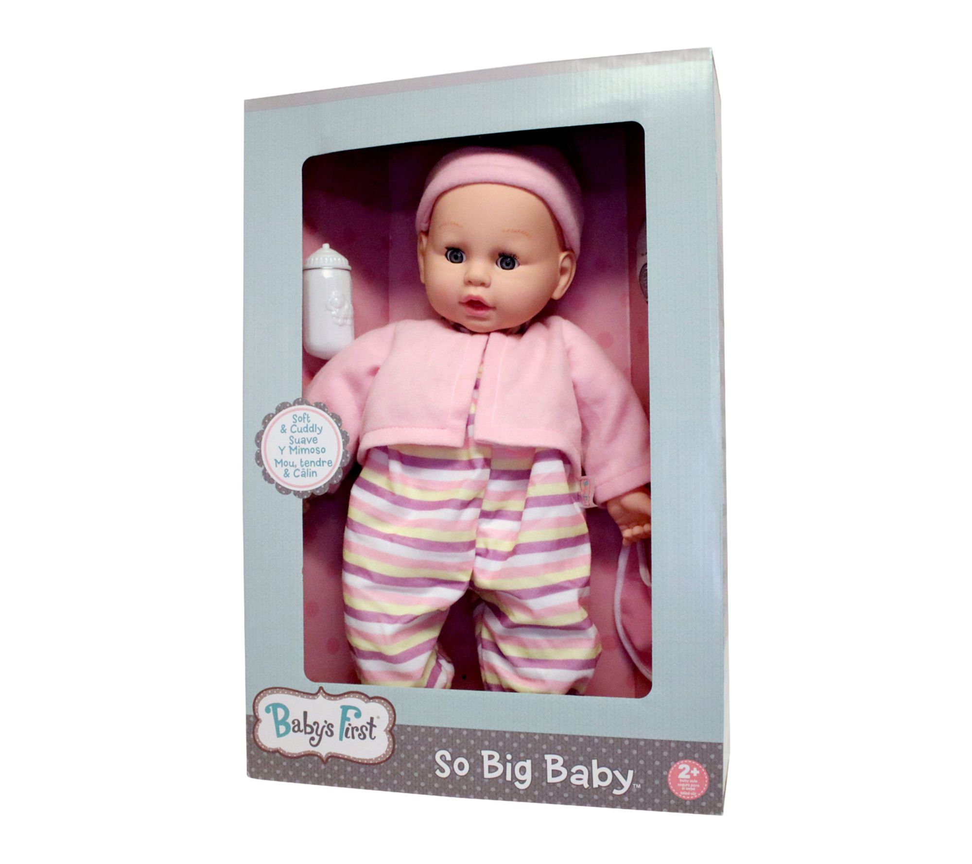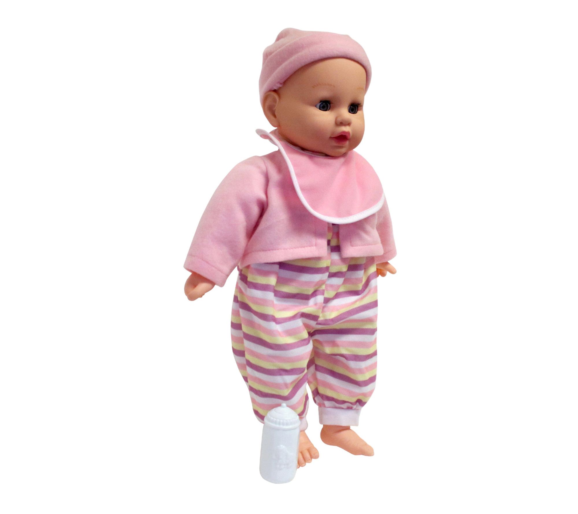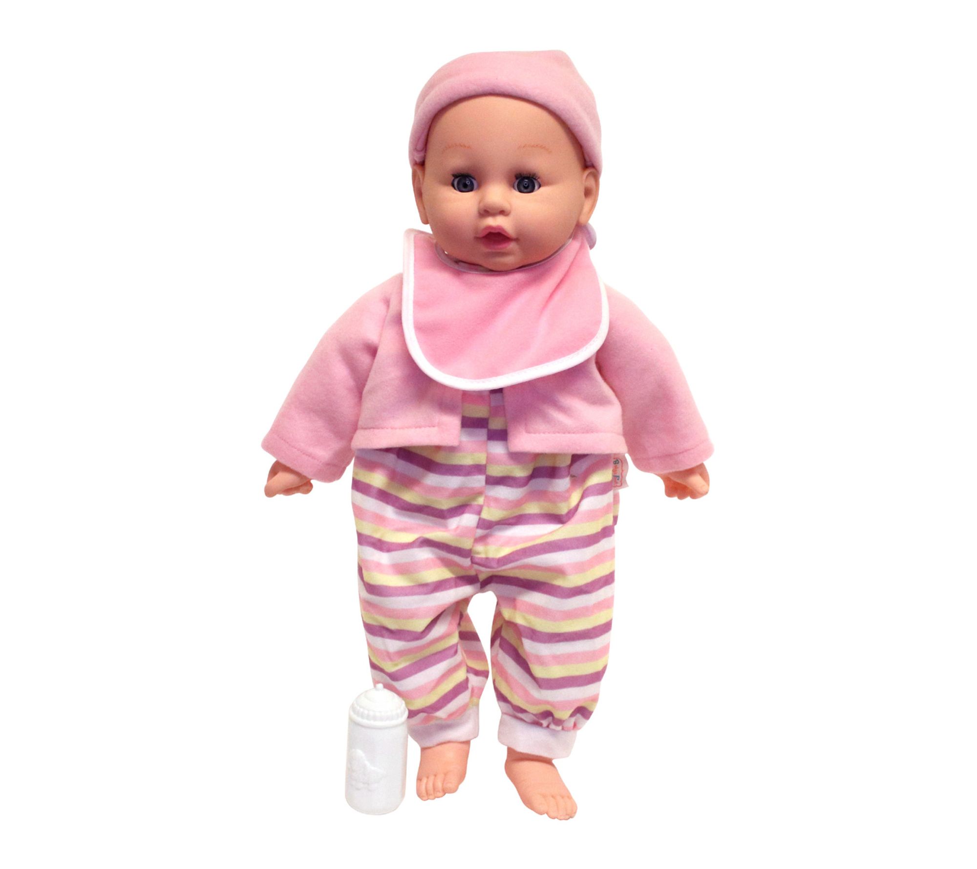 • Includes 19" soft body doll, baby bottle, baby bib, matching headband, and matching jacket