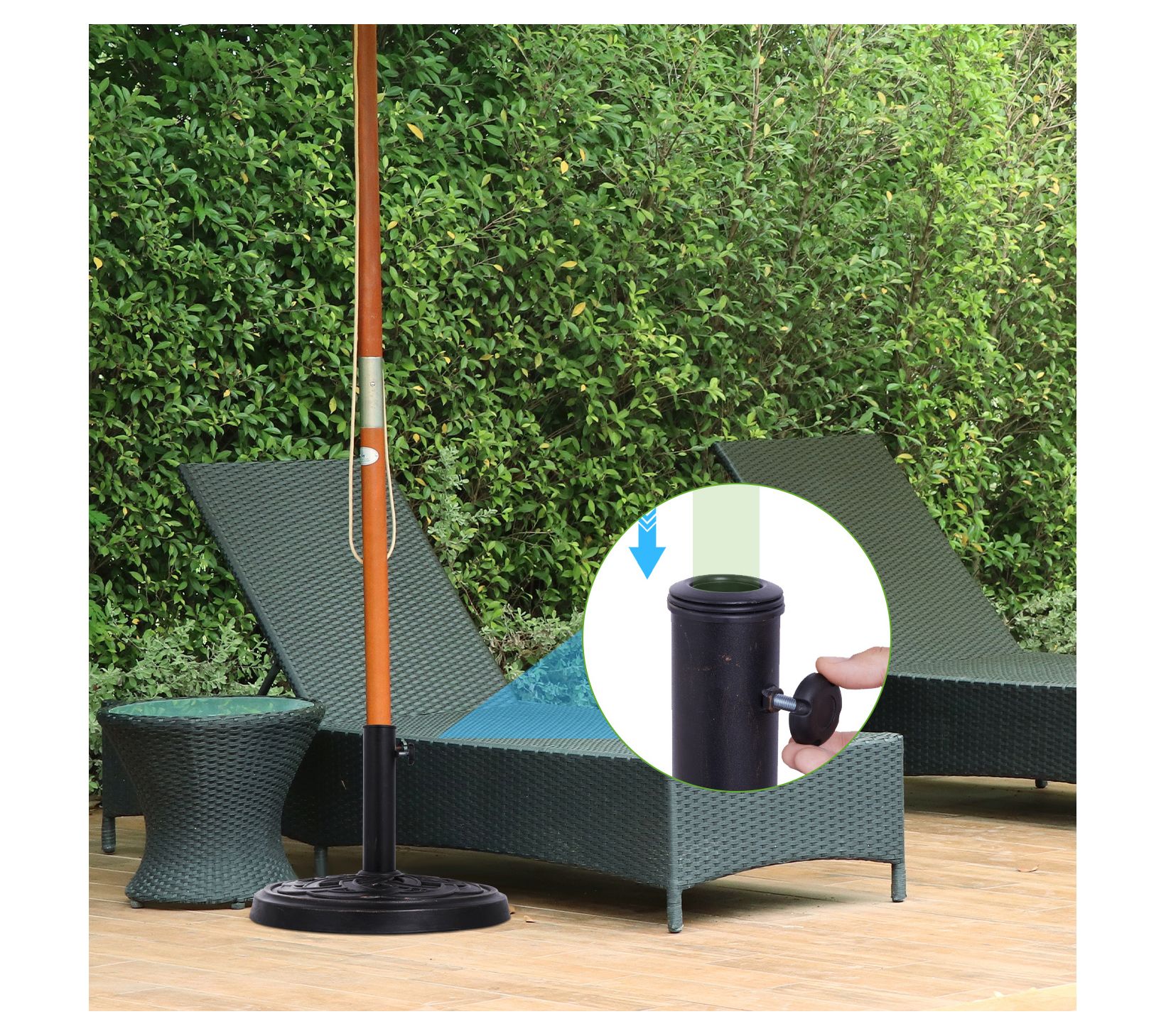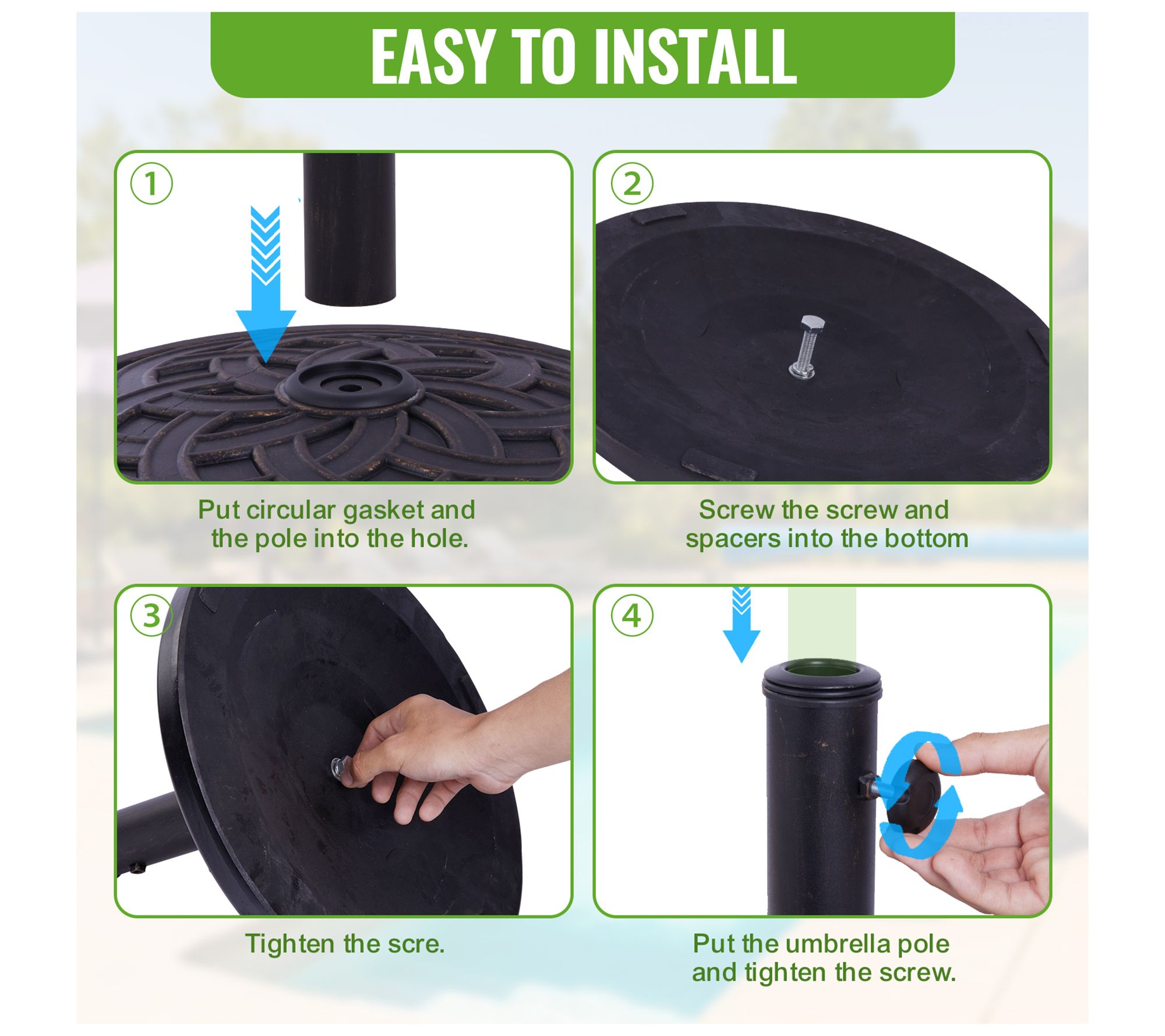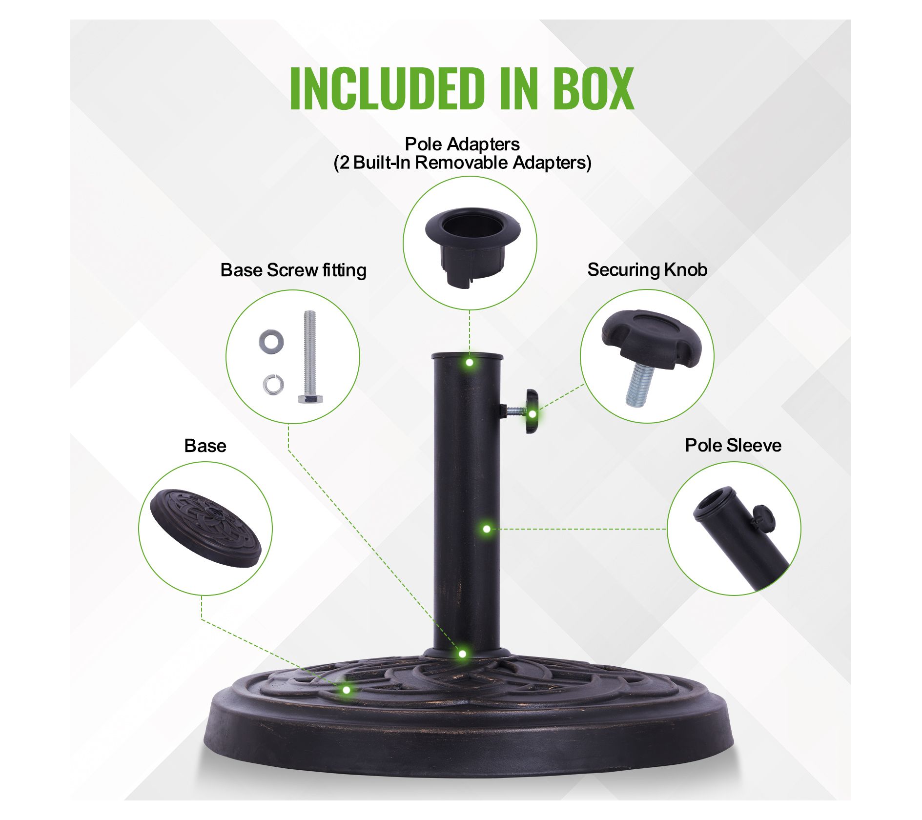 • Includes umbrella base and hardware kit