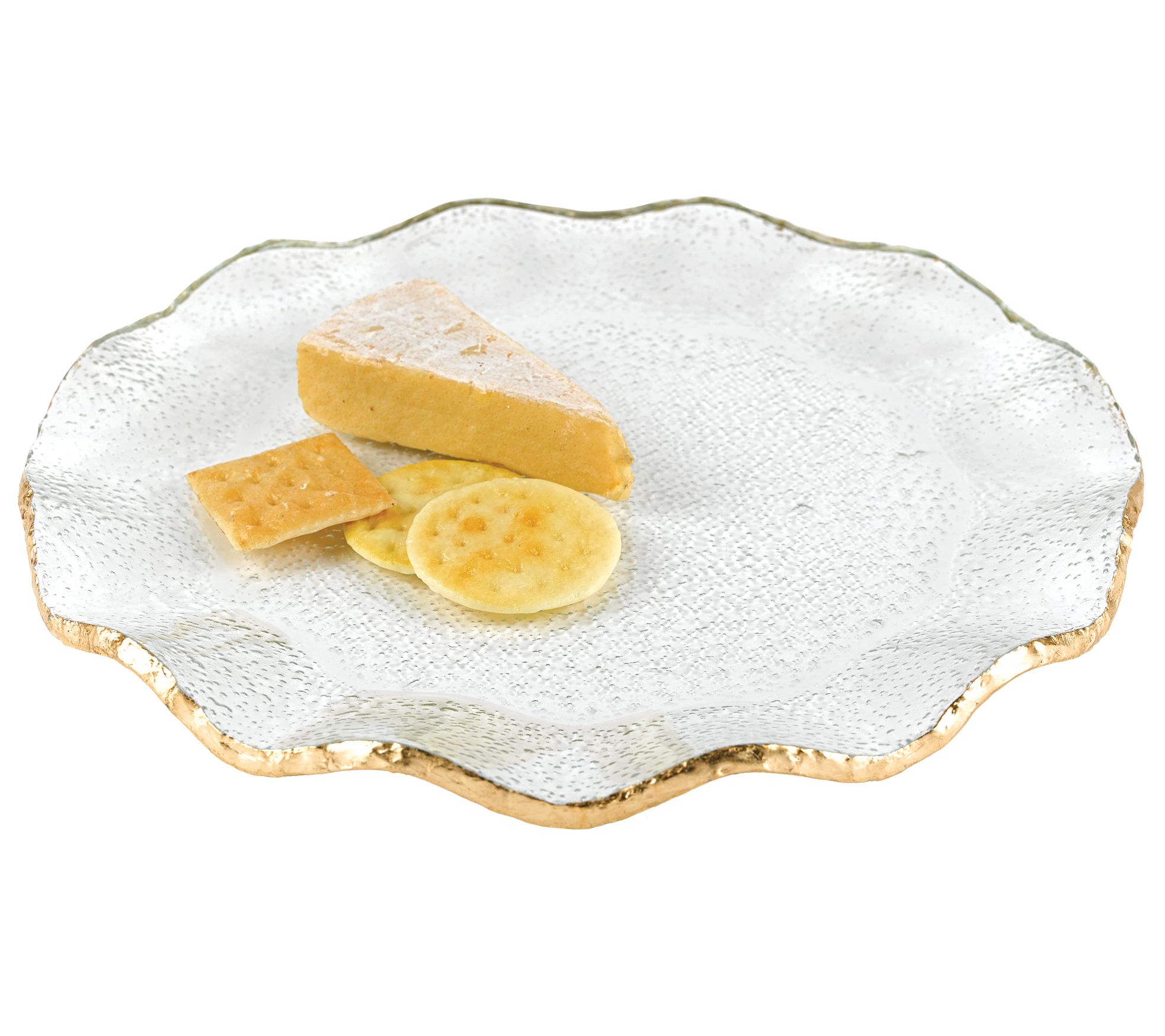 Charge up your next meal with this beautiful glass plate. It's large enough to be a serving platter, or charger, so its gorgeous handpainted gold edge can elevate any table setting. From Badash Crystal.