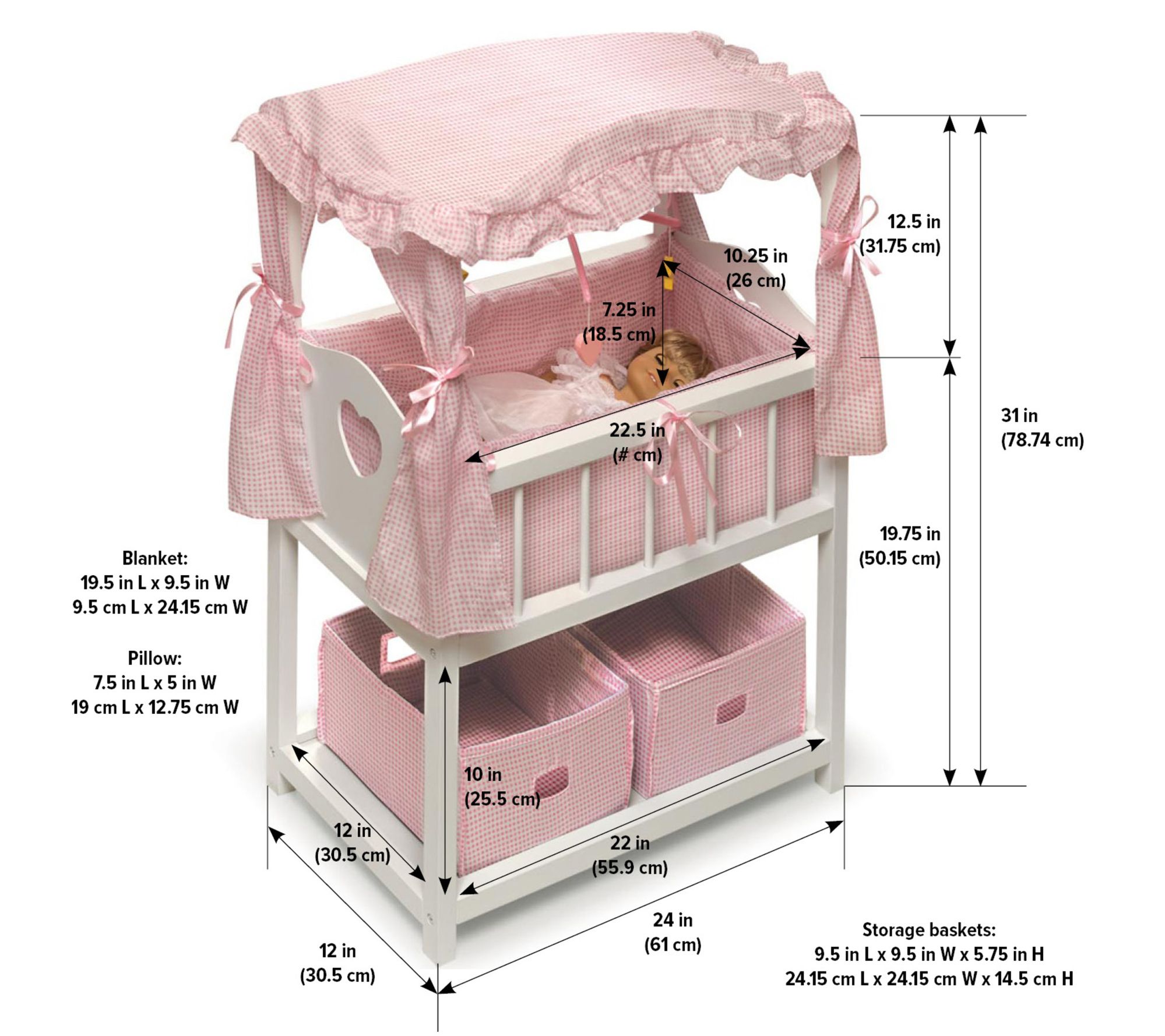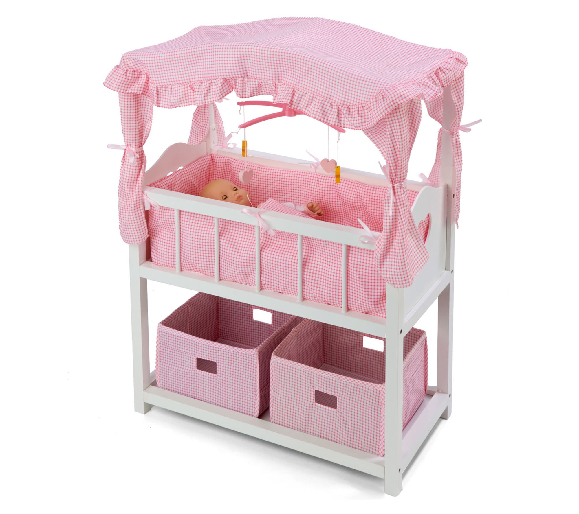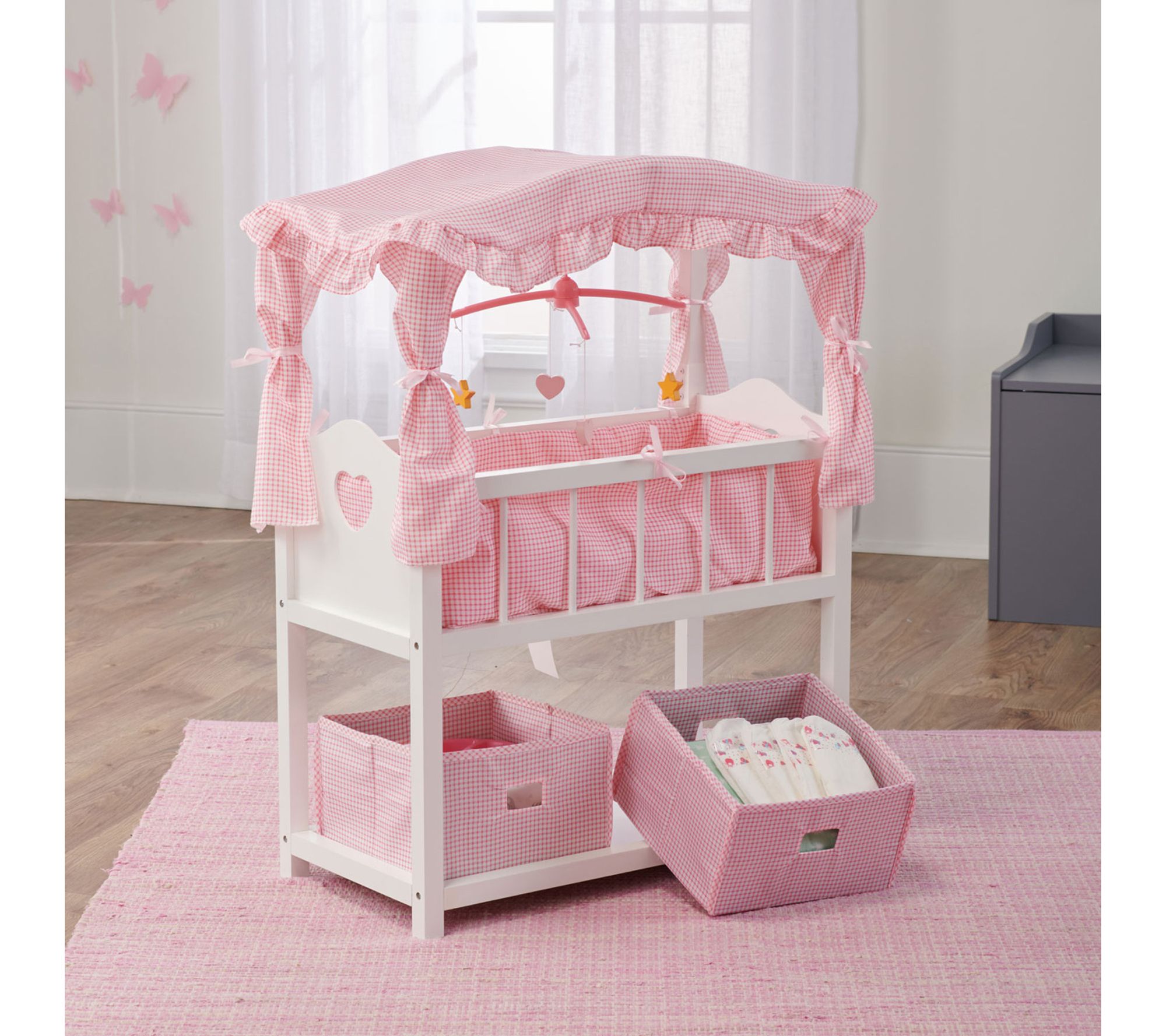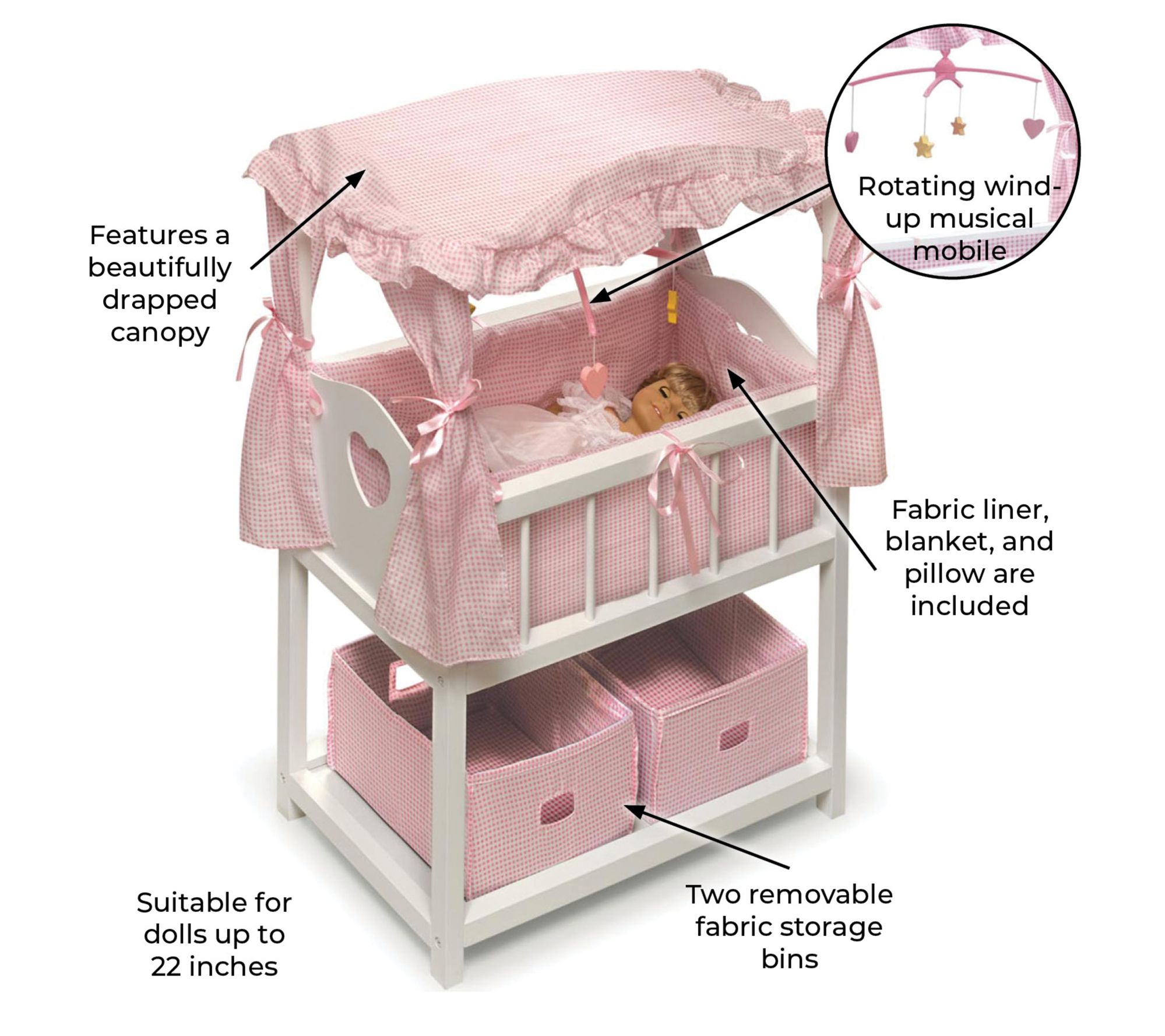 • Includes canopy doll crib, two baskets, bumper/liner, blanket, pillow, musical mobile
