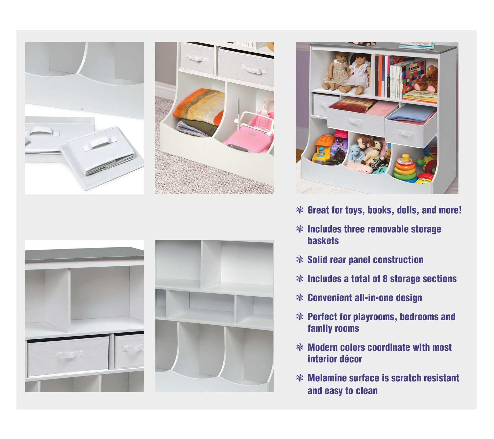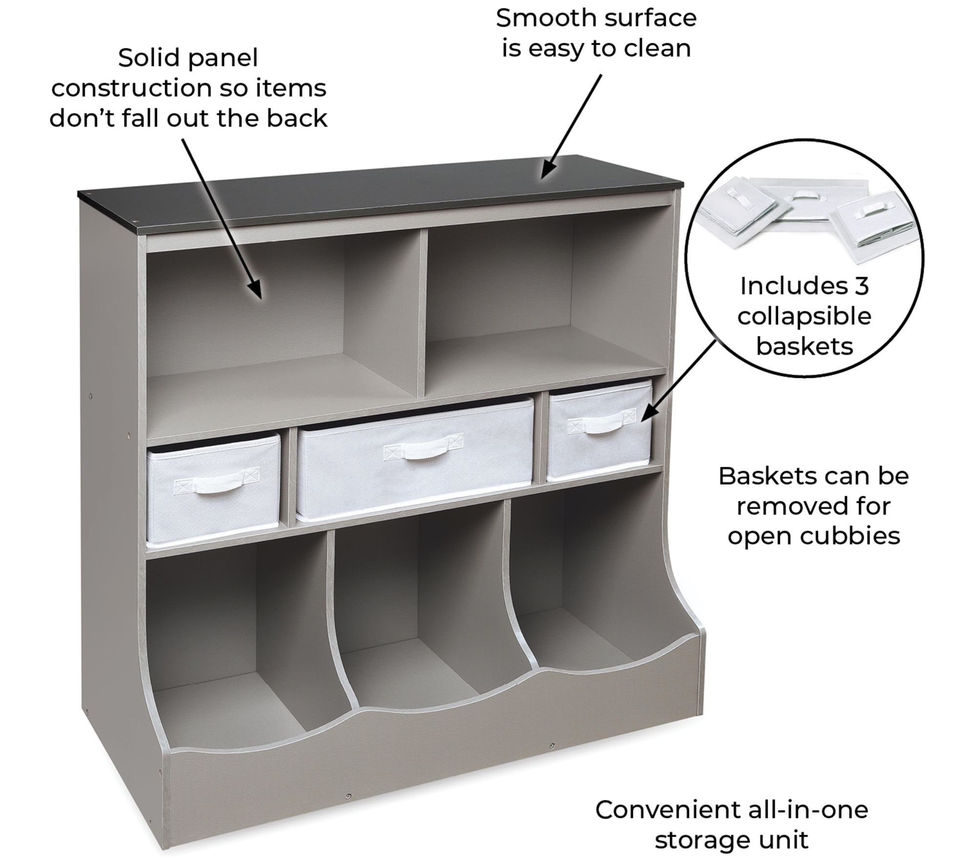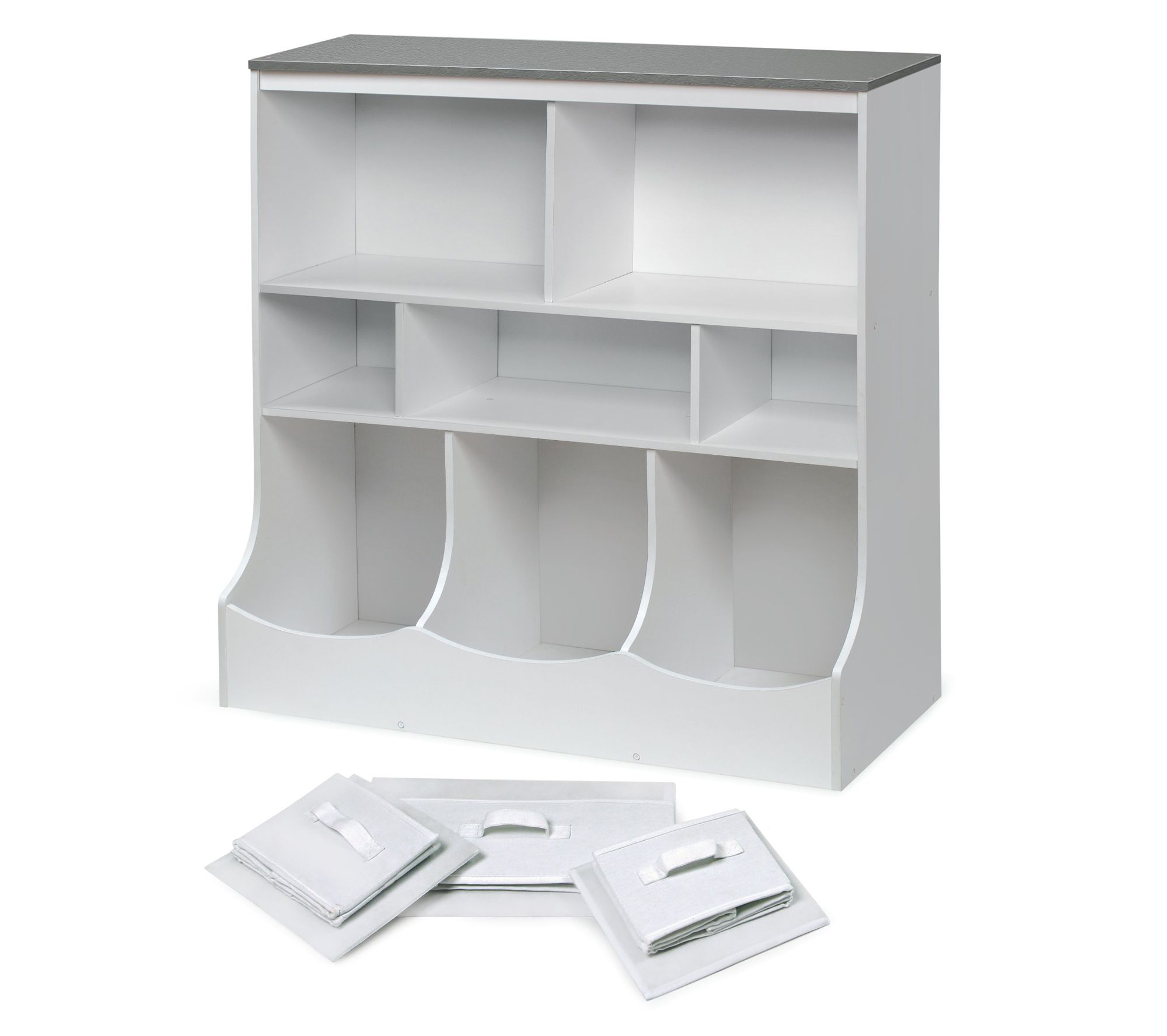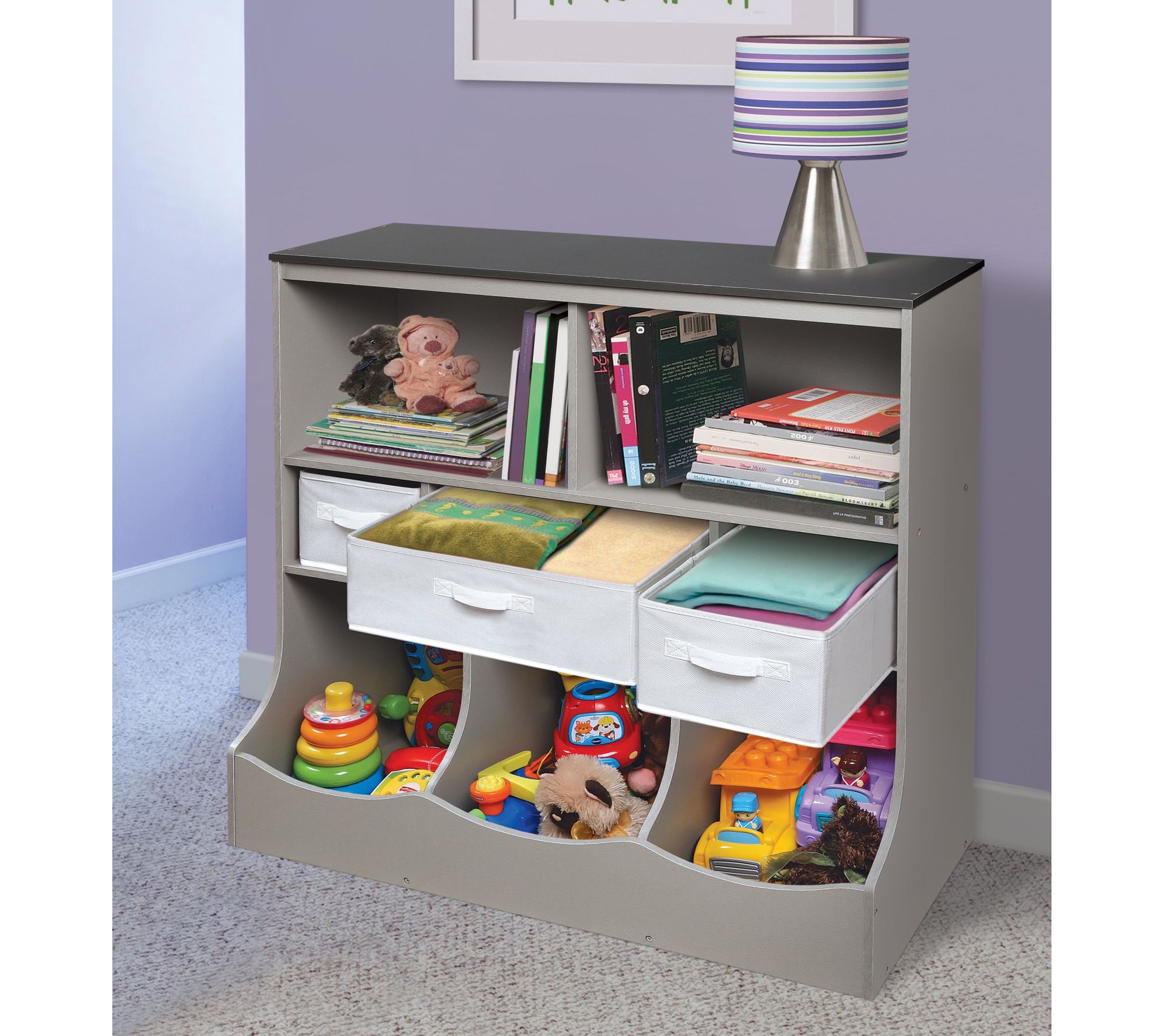 Tidying up after playtime is easier and more fun with this versatile storage unit. Perfect for nurseries, playrooms, and family rooms, it features two open shelves, three cubby bins, and three baskets to help keep toys, books, and crafts organized. The baskets are removable and can be folded flat for extra space. Top surfaces offer additional room for display or essentials. From Badger Basket.