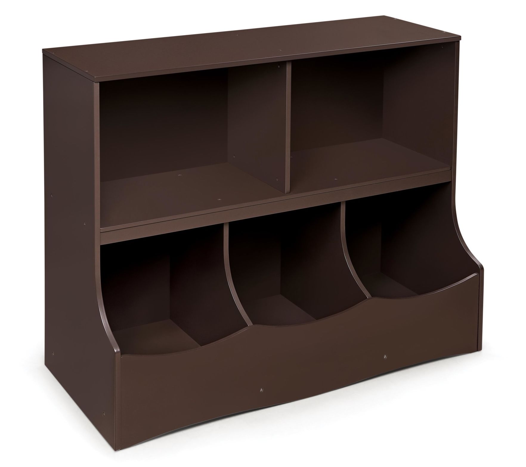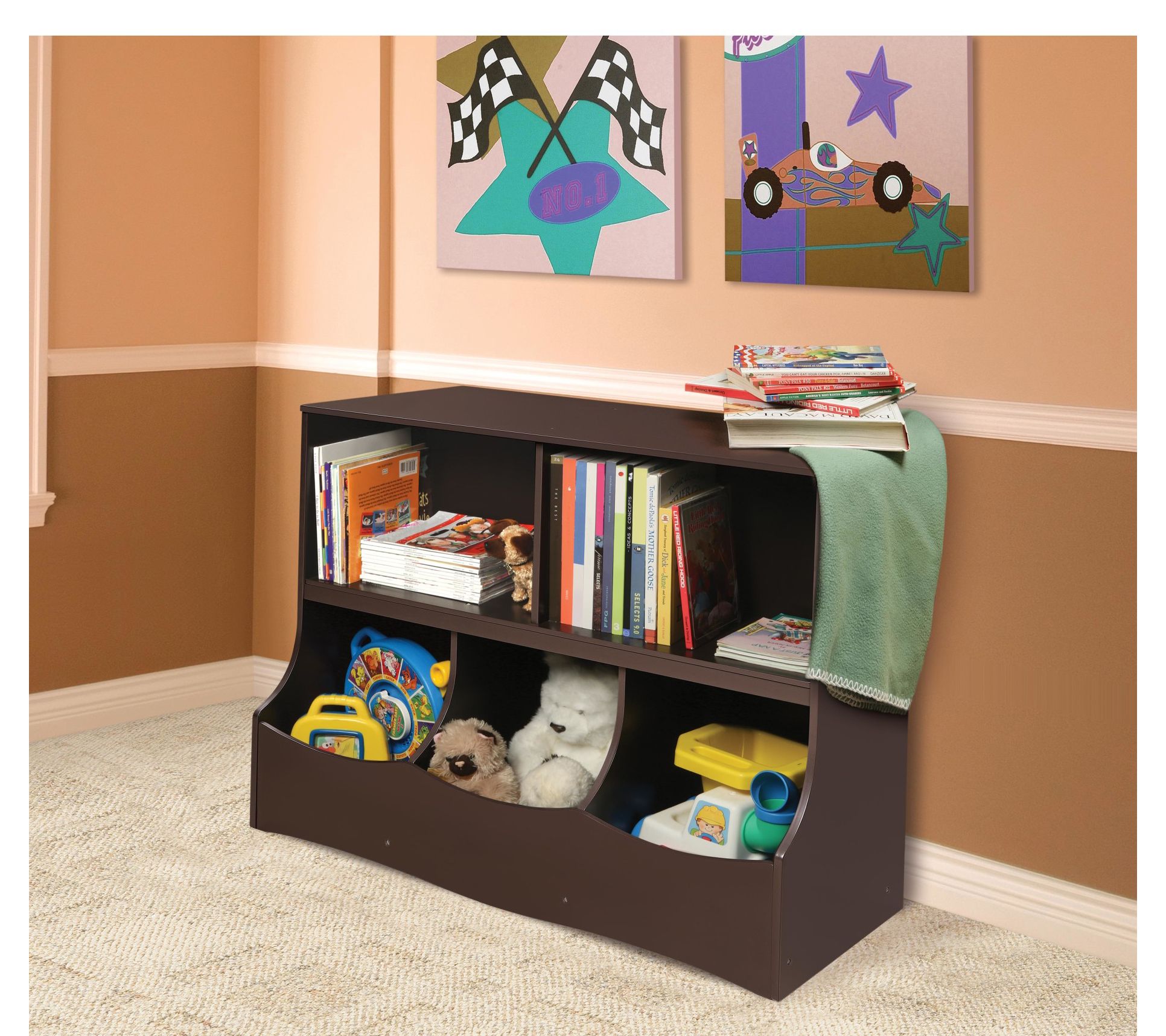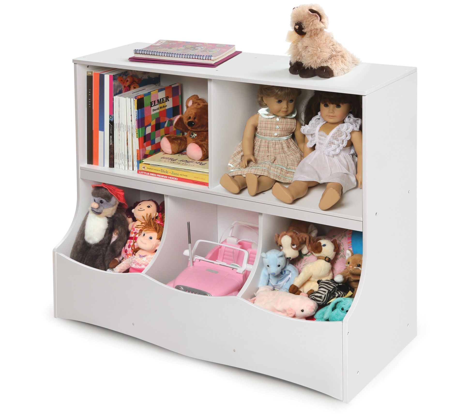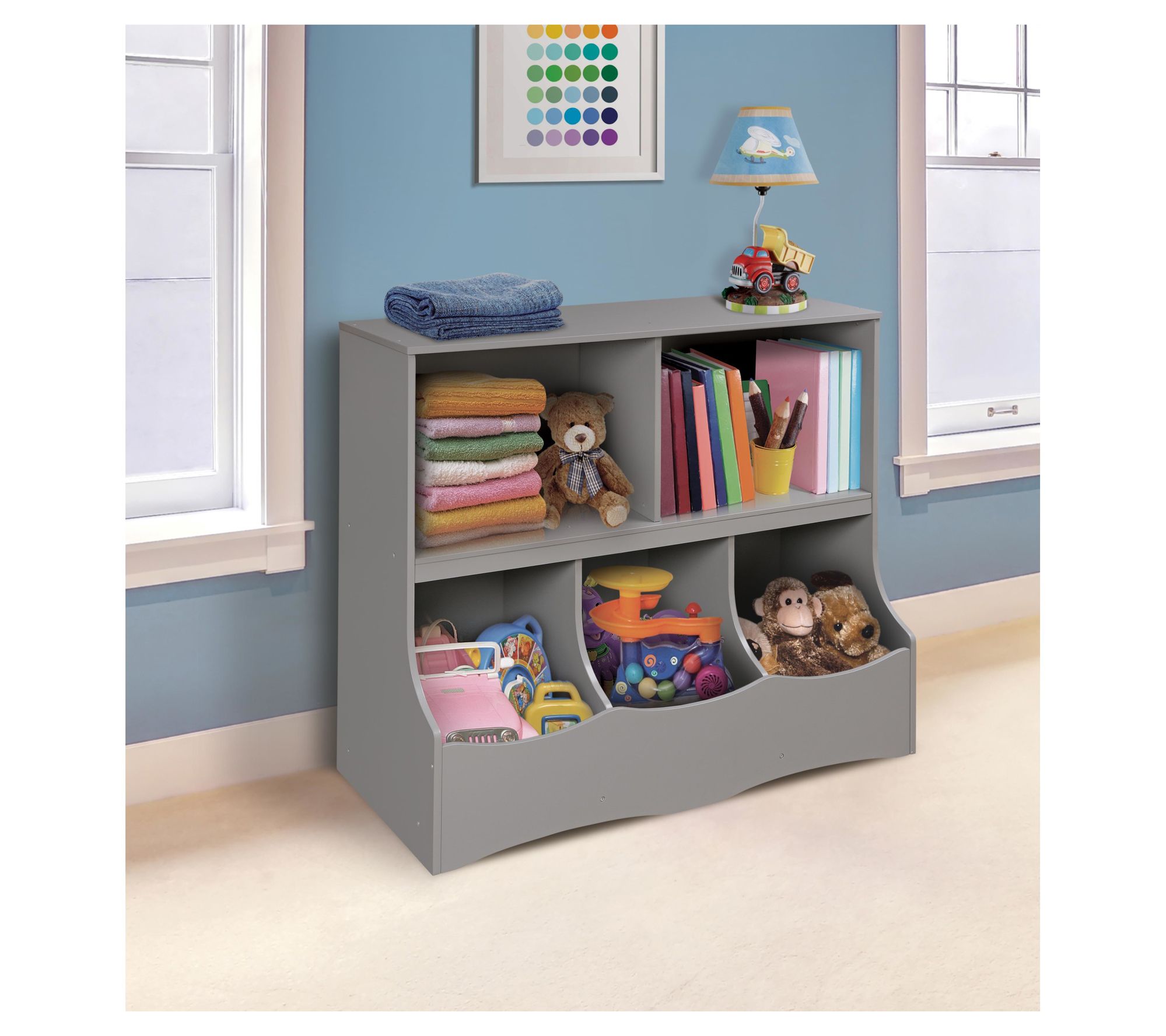 Tidy up your child's room with this multi-bin storage cubby from Badger Basket. This sturdy unit is perfect for keeping toys, books, and craft supplies neatly organized. With two open shelves and three cubby bins, it’s the ideal size for nurseries, playrooms, and family rooms. The flat top offers extra space for displaying favorites. From Badger Basket.