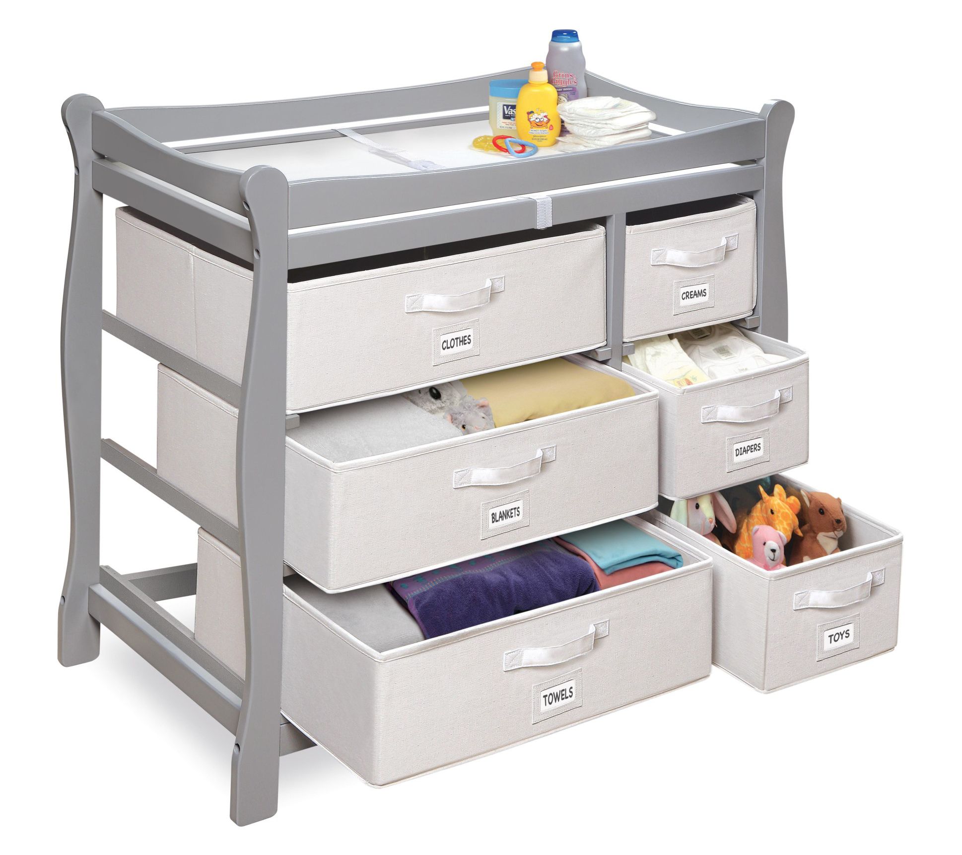 • Includes baby changing table, foam changing pad, safety belt, three large folding baskets, and three small folding baskets