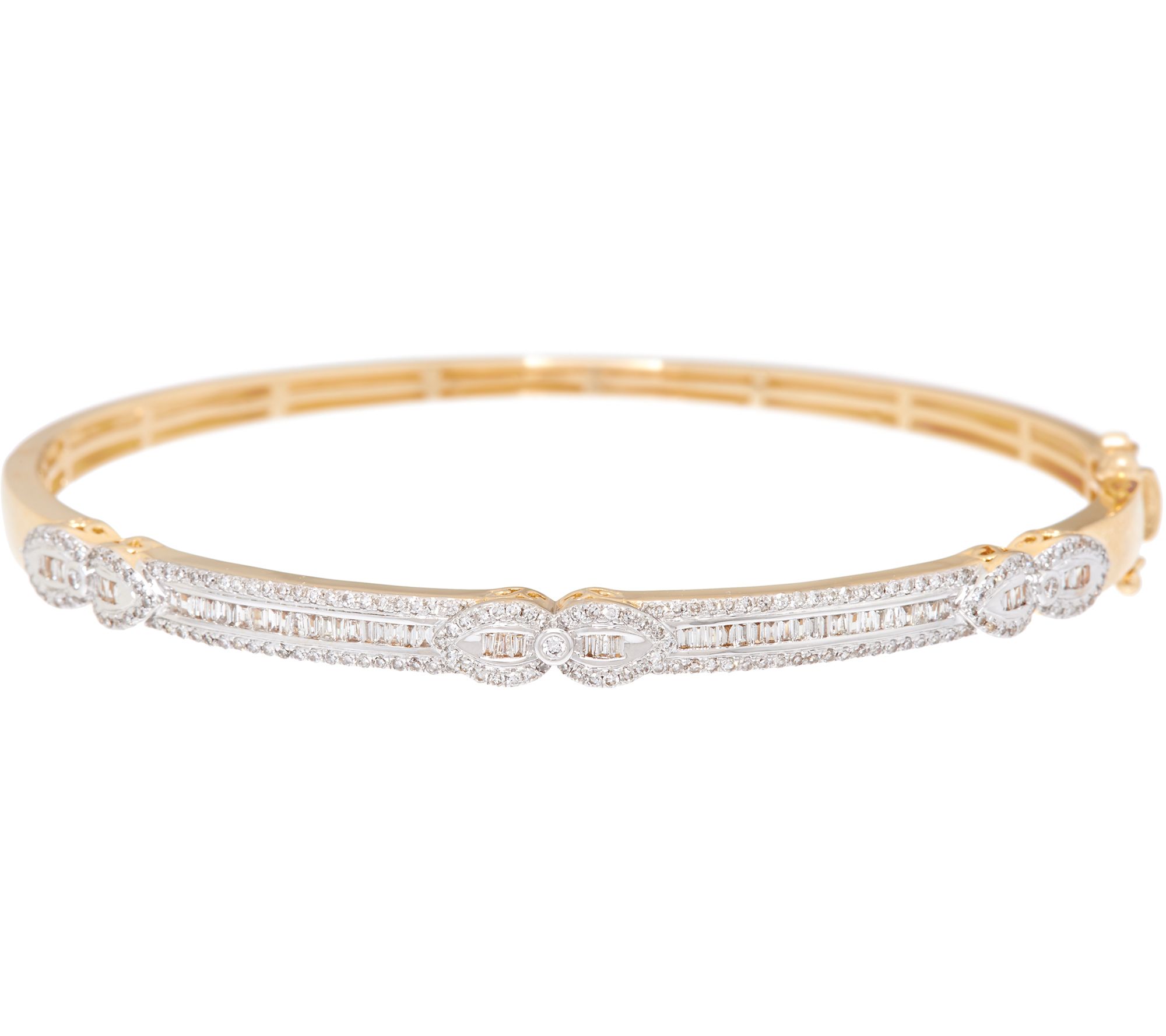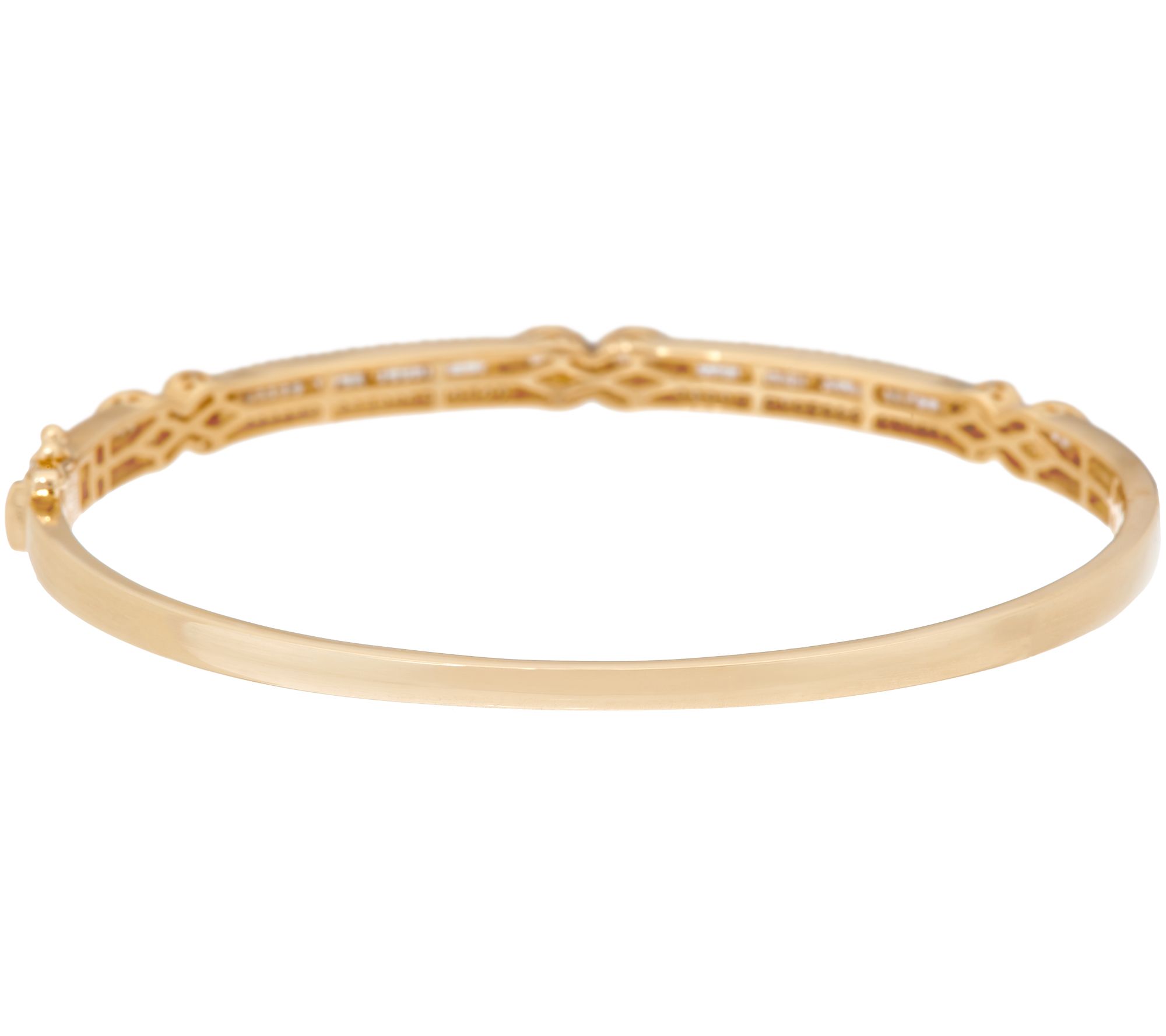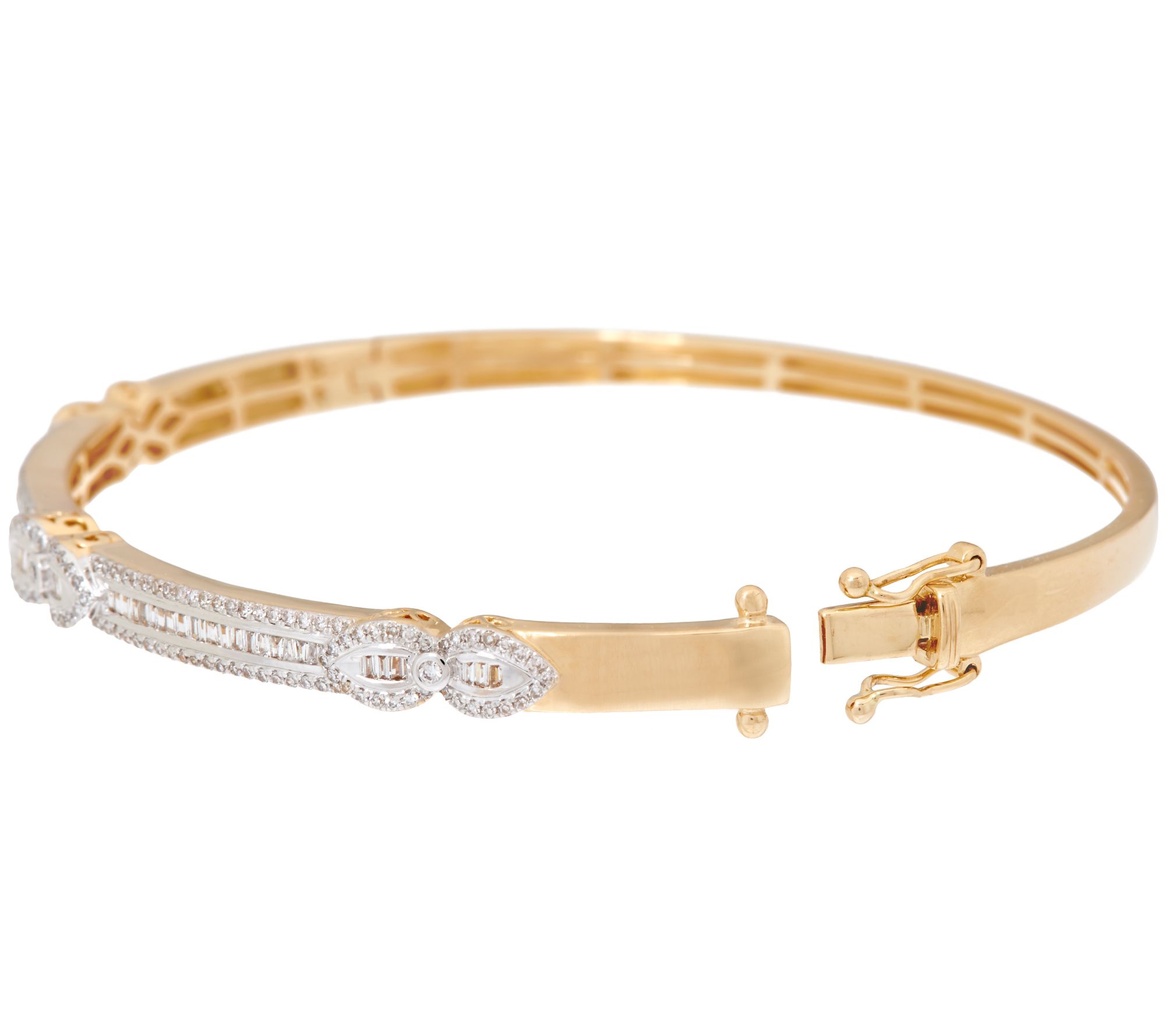 Let there be light. Crafted from 14K gold, this beautiful bangle from Affinity is aglow with dazzling diamonds. Three decorative diamond stations are accented by a row of channel-set, baguette diamonds surrounded by bead-set, round diamonds. From Affinity(R) Diamond Jewelry.