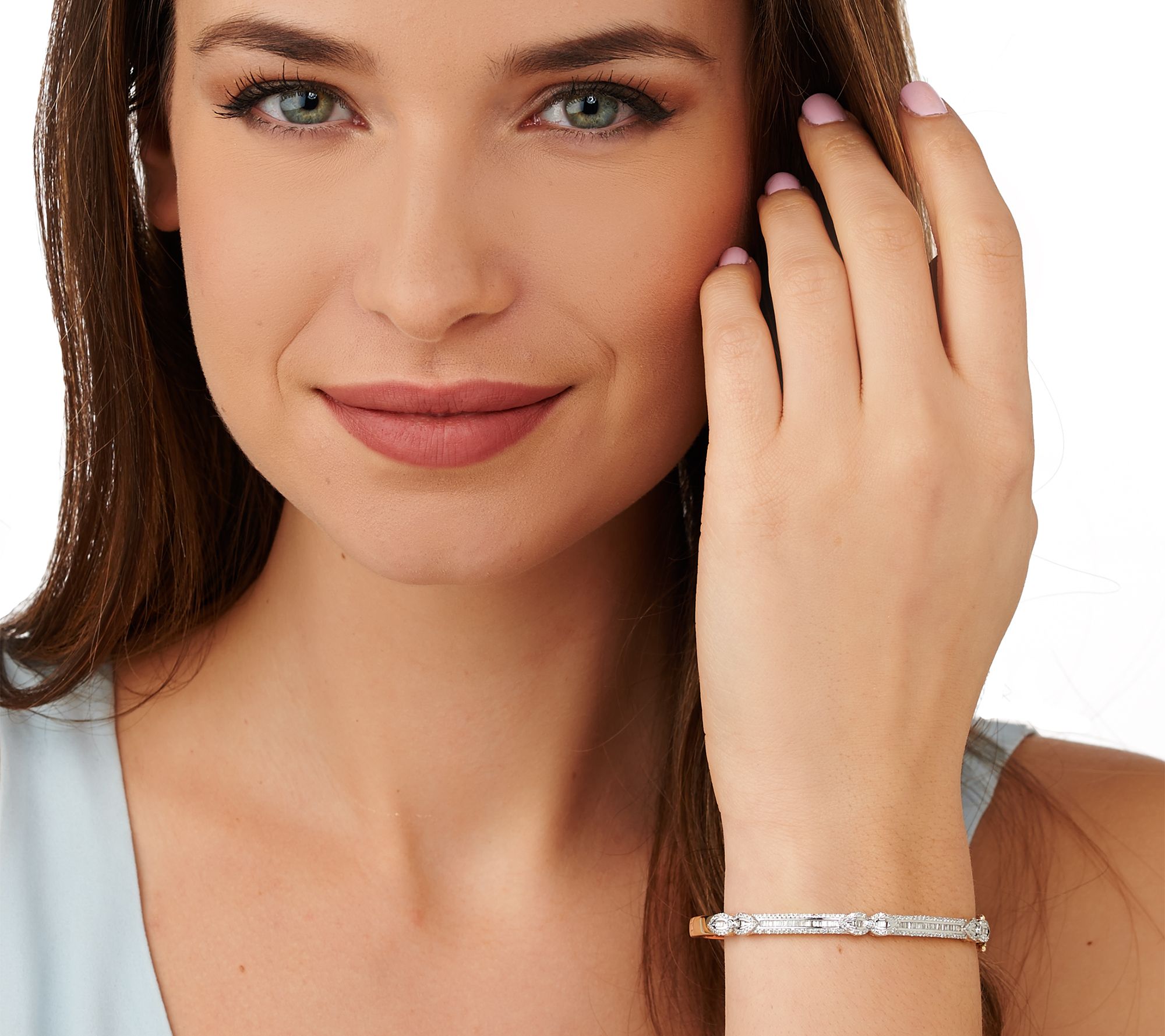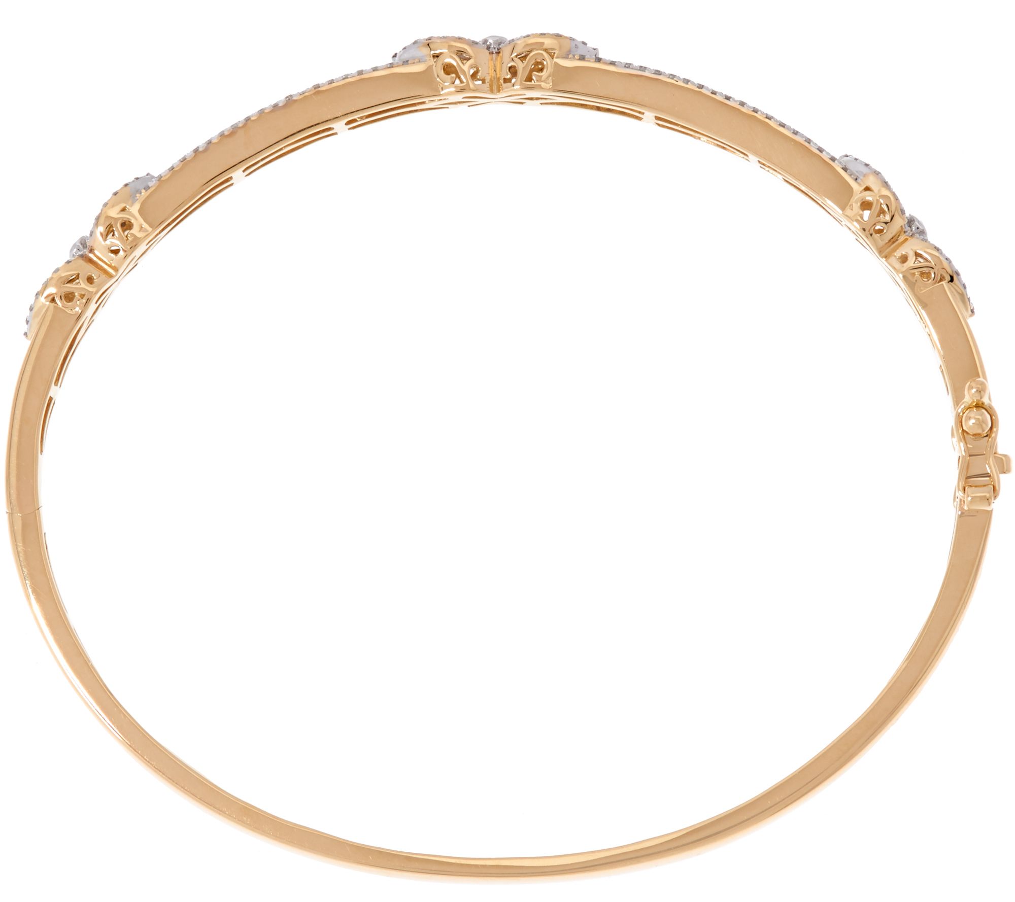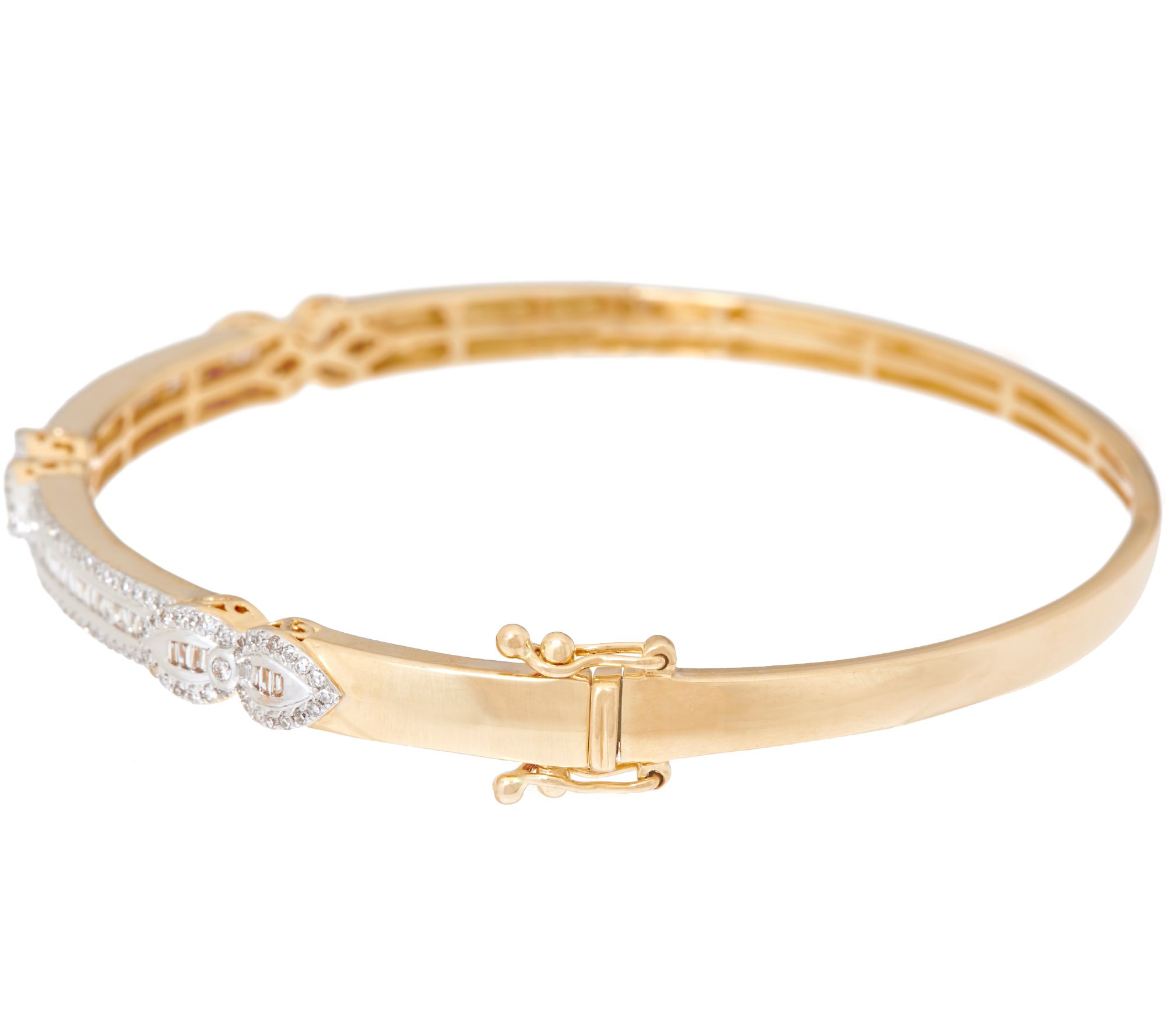 Let there be light. Crafted from 14K gold, this beautiful bangle from Affinity is aglow with dazzling diamonds. Three decorative diamond stations are accented by a row of channel-set, baguette diamonds surrounded by bead-set, round diamonds. From Affinity(R) Diamond Jewelry.