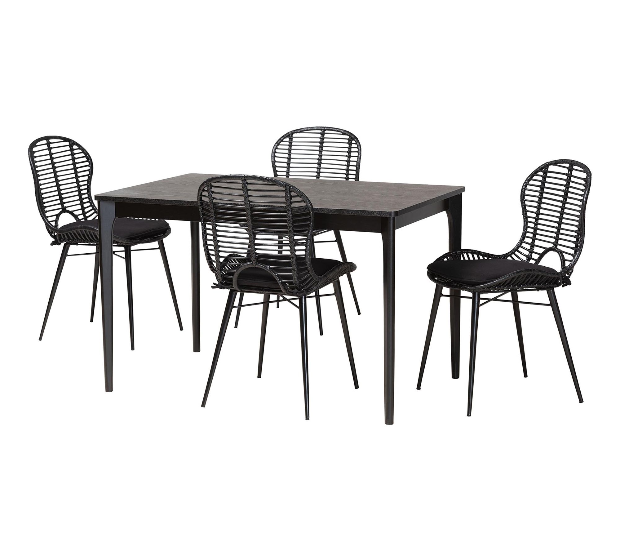 Dine with a sense of effortless serenity with the finely crafted Brenna dining set. This Bohemian-inspired set includes four chairs and one table, offering a modern design. Each chair features a metal base topped with a rattan seat and a plush fabric cushion for sumptuous relaxation. Ideal for any dining occasion, the rectangular tabletop with rounded corners provides ample space and a touch of exotic poise. From bali & pari.