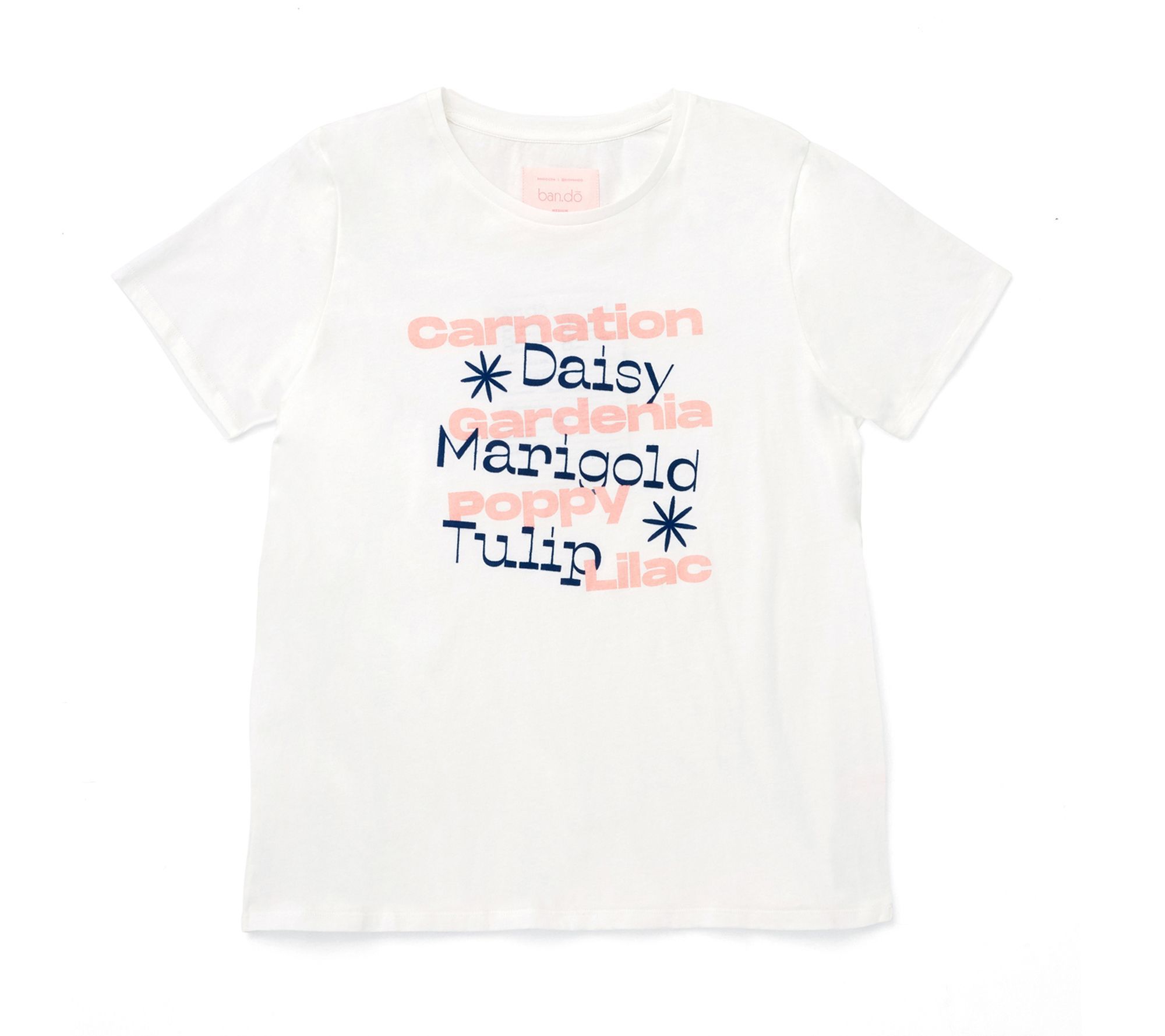 Flaunting your love of flowers has never felt this good! This ultra-comfy classic tee features flocked details and a list of everyone's favorite blooms. From ban.do.