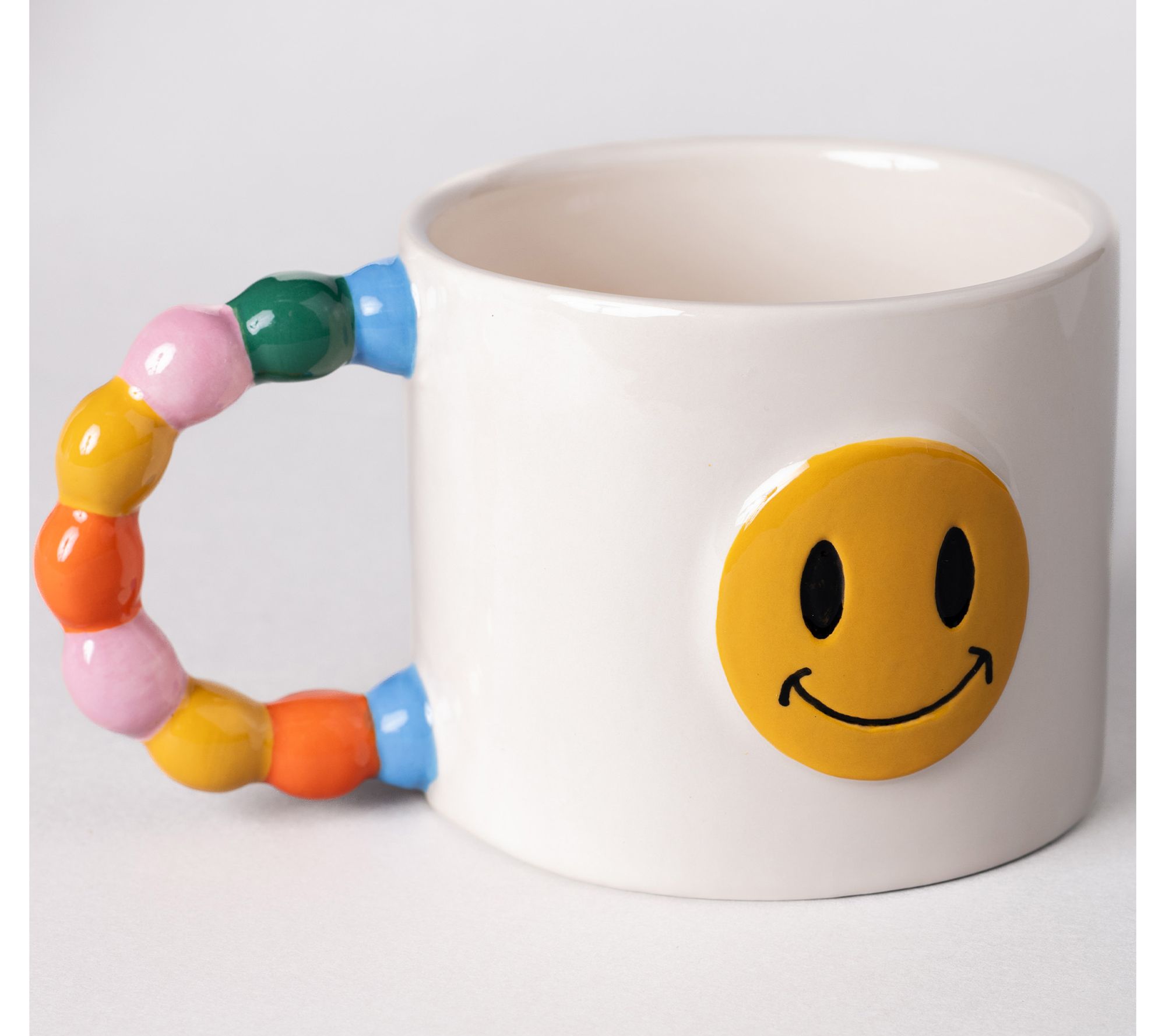 Morning routines feel brighter when sipping your coffee or tea from this ceramic Smiley Face mug, featuring playful three-dimensional details and vibrant colors. The cheerful rainbow handle brings a pop of fun to every sip, making it an easy favorite for starting your day or sharing a laugh with friends. From ban.do.