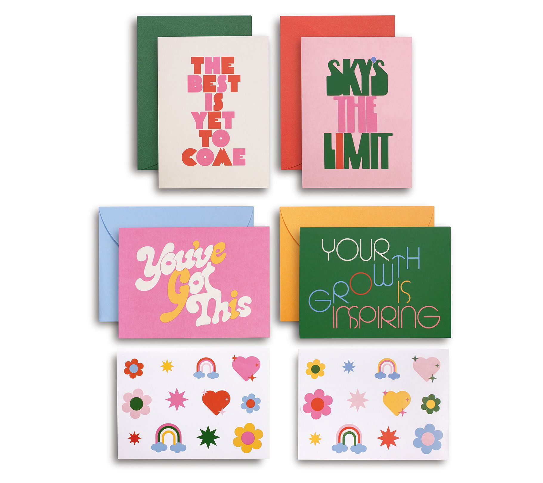 Brighten someone's day with a card! This set features 16 cards with four designs, coordinating envelopes, and two sheets of stickers. Cards have blank interiors. Designs include "You've Got This", "The Best Is Yet To Come", "Sky's The Limit", and "Your Growth is Inspiring".;1 storage box with dividers, 16 cards, 16 envelopes, 2 sticker sheets
