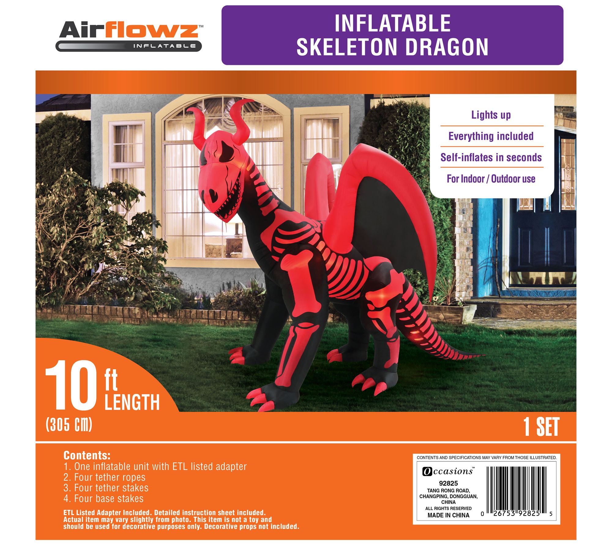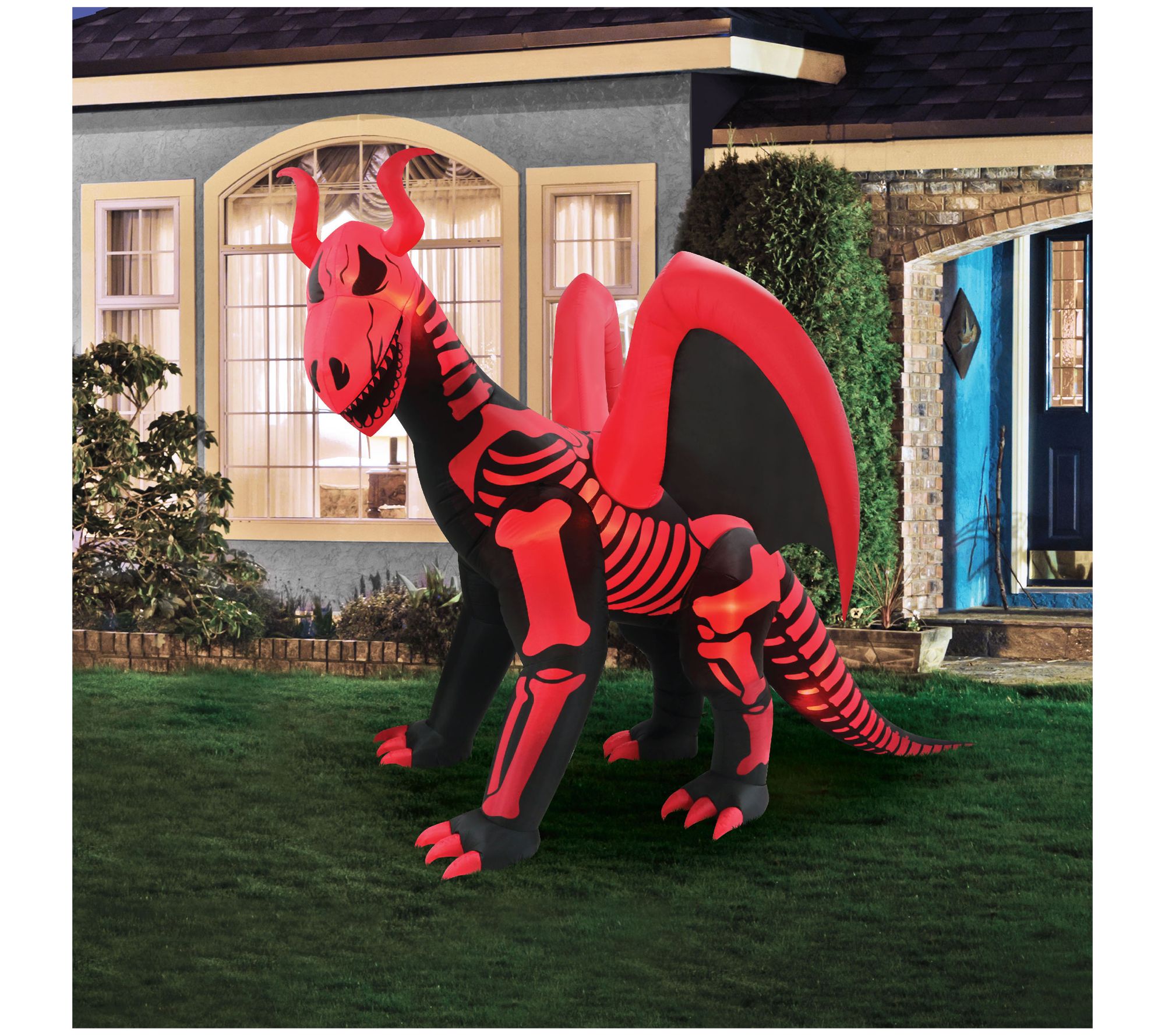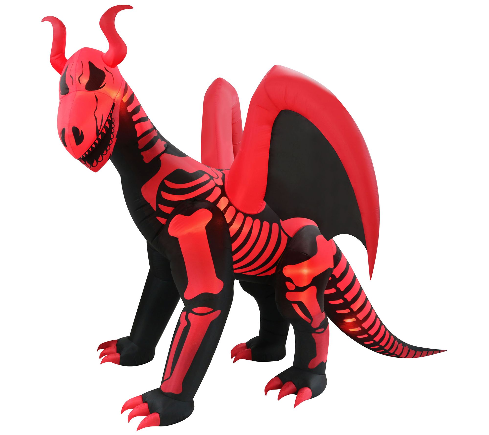 Add medieval flair and excitement to your yard with this 10' inflatable skeleton dragon, featuring bold wings and curved horns, this bright red and black guardian has LED lights that illuminate the dark of night. From Banzai.