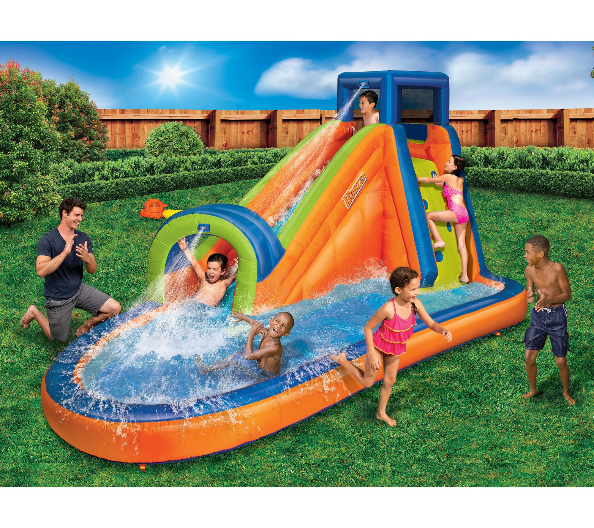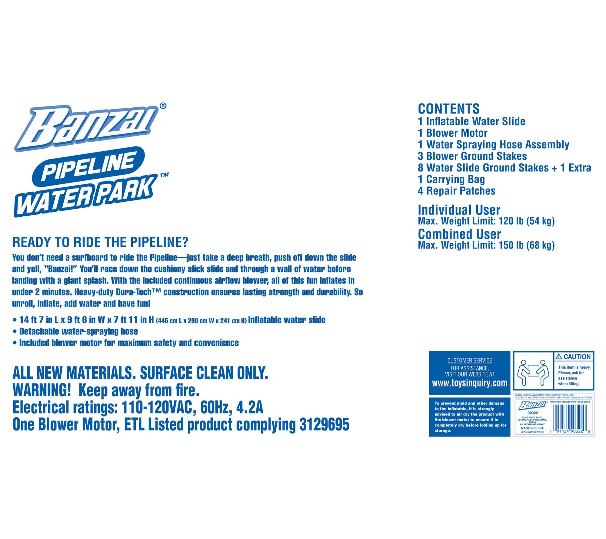 You don't need a surfboard to ride the Pipeline, just hook up the hose, climb the wall, race down the slide through a wall of water, and have a blast landing with a giant splash. From Banzai.