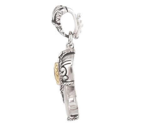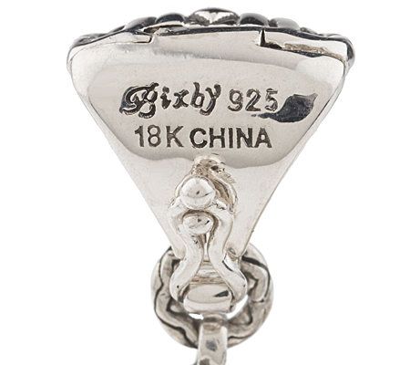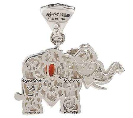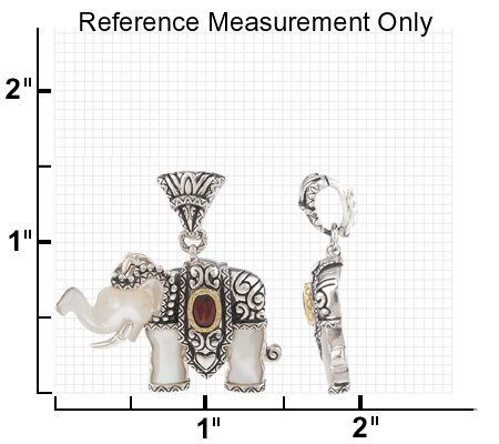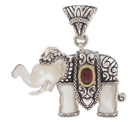Animal attraction. This beautifully ornate elephant enhancer is detailed with lustrous mother-of-pearl on the legs and head, and a zigzag and beaded design of oxidized sterling silver on the rest of the body. An oval garnet glimmers in the center, finished with a border of 18K yellow gold. From Barbara Bixby.