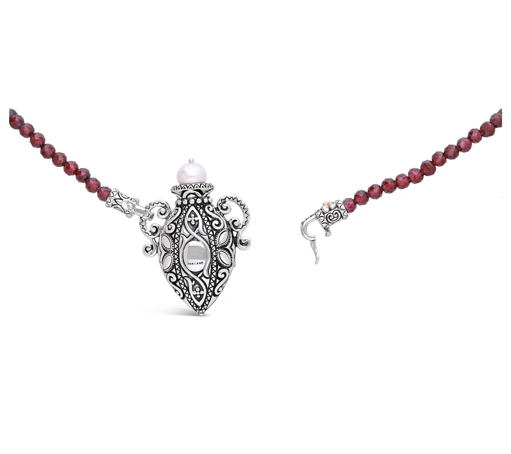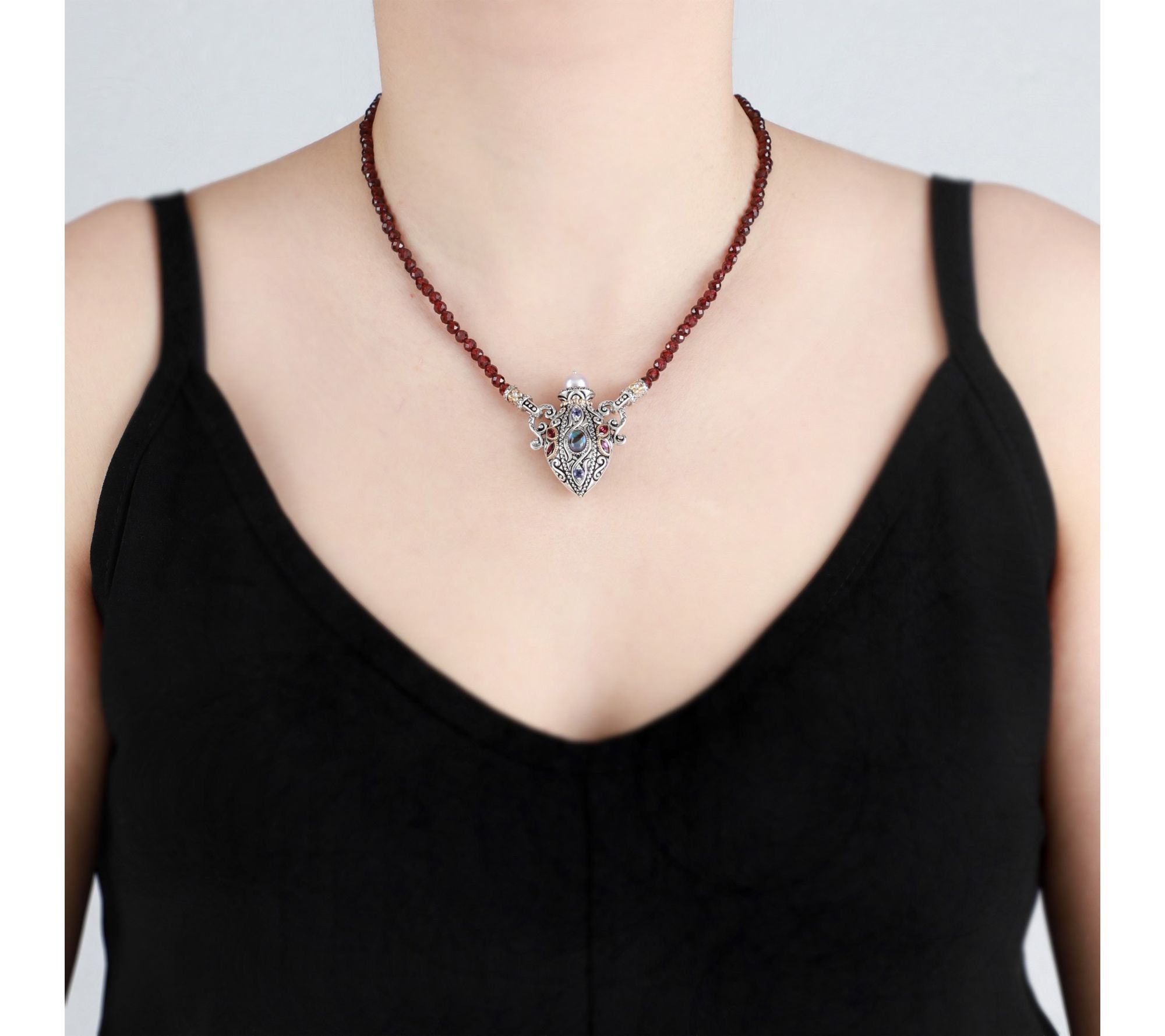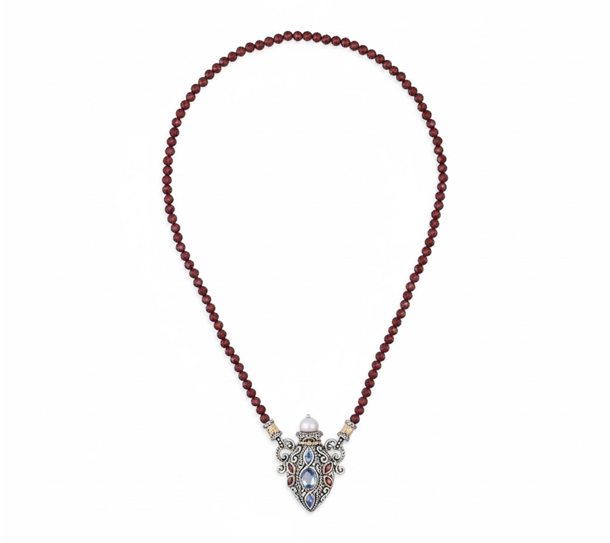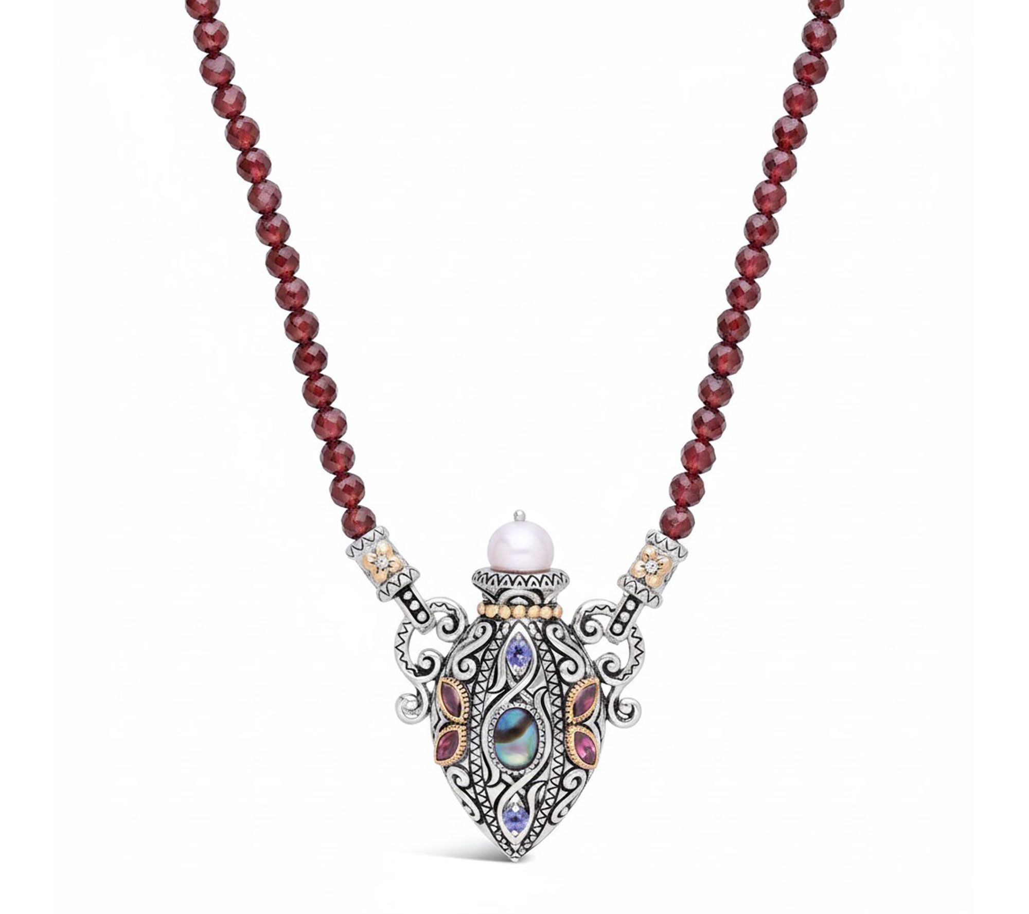 Add a touch of artistry to every occasion with this gemstone bottle necklace, where garnet beads and an 18K gold-accented pendant blend in a story of rich color and intricate detail. The violet cultured freshwater pearl and abalone center shimmer alongside rhodolite and iolite accents, while the signature Barbara Bixby flower offers a sophisticated flourish. From Barbara Bixby.