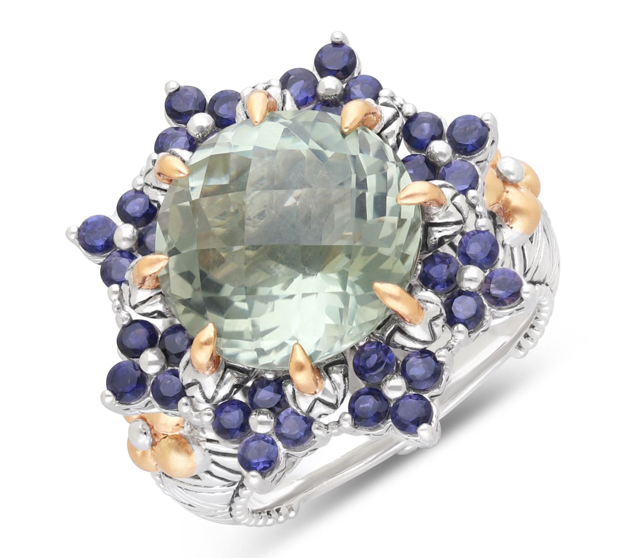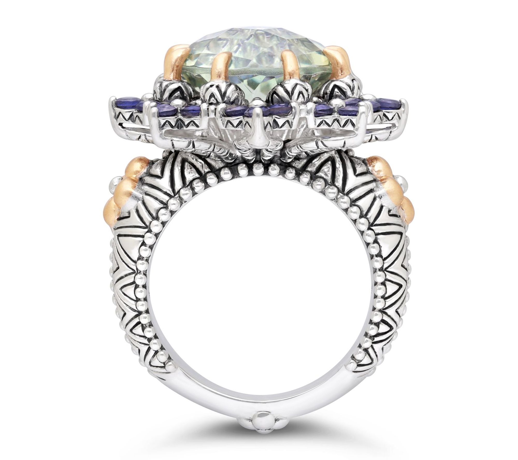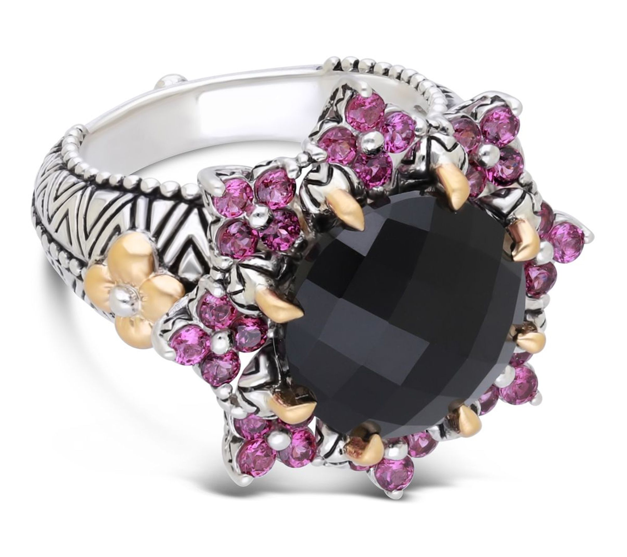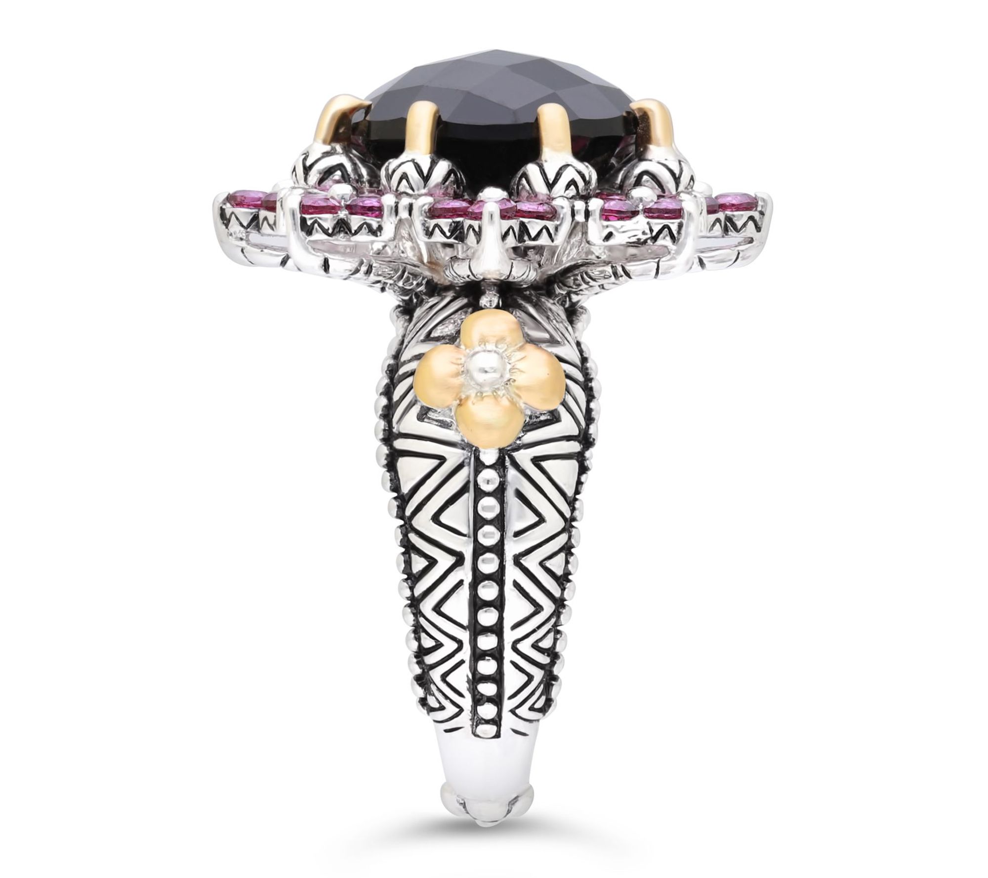 A bold pop of gemstone color and intricate floral motifs come together to bring striking beauty to special occasions or everyday moments. This gemstone ring pairs the radiant shimmer of a large round center stone with gleaming 18K yellow gold and designer details, making it a stunning accessory for any look. From Barbara Bixby.
