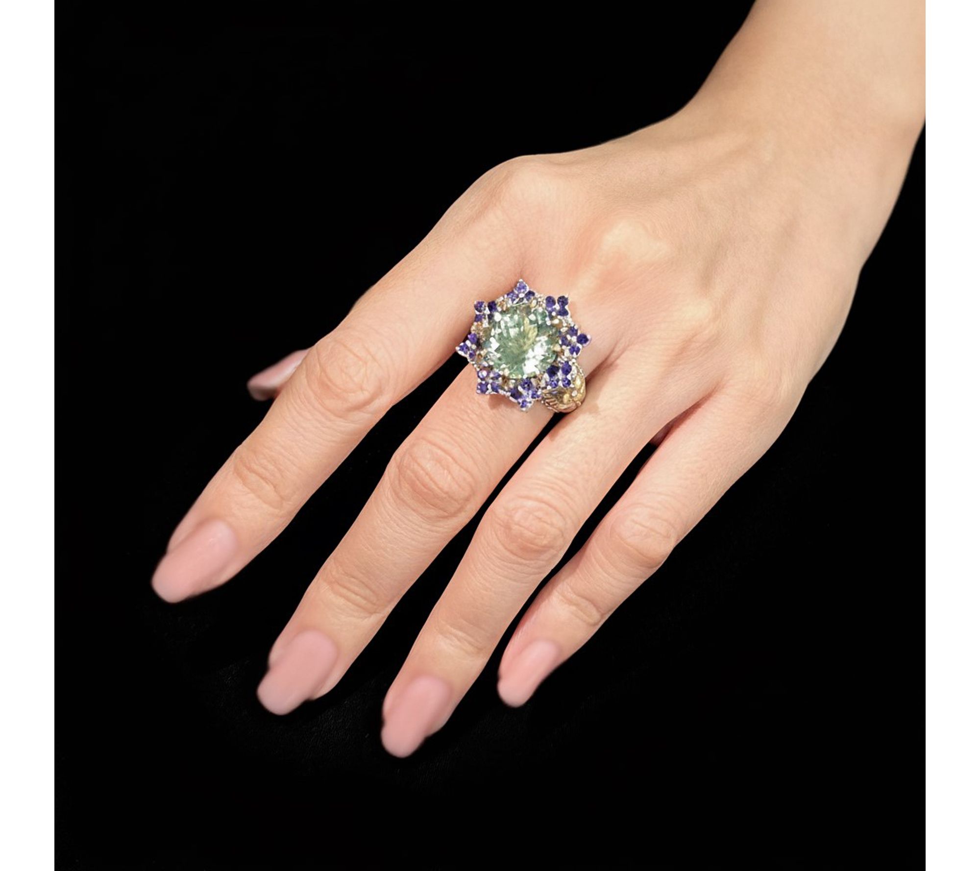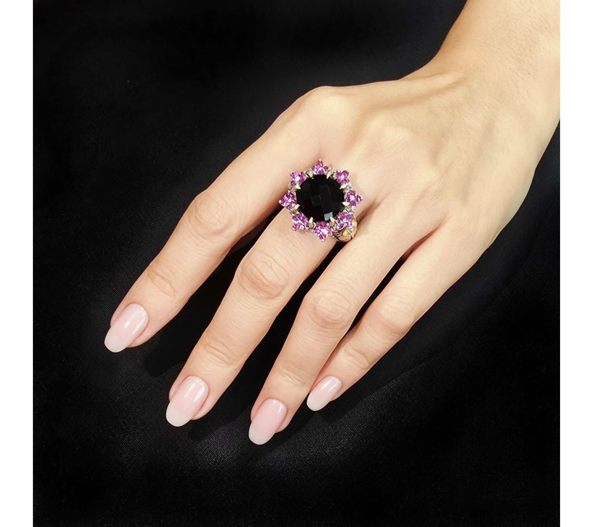 Total gemstone weights are approximate: Rhodolite 1.20 carat; Green Mint Quartz 7.50 carats; Iolite 0.95 carat; gemstone weight is not given for onyx