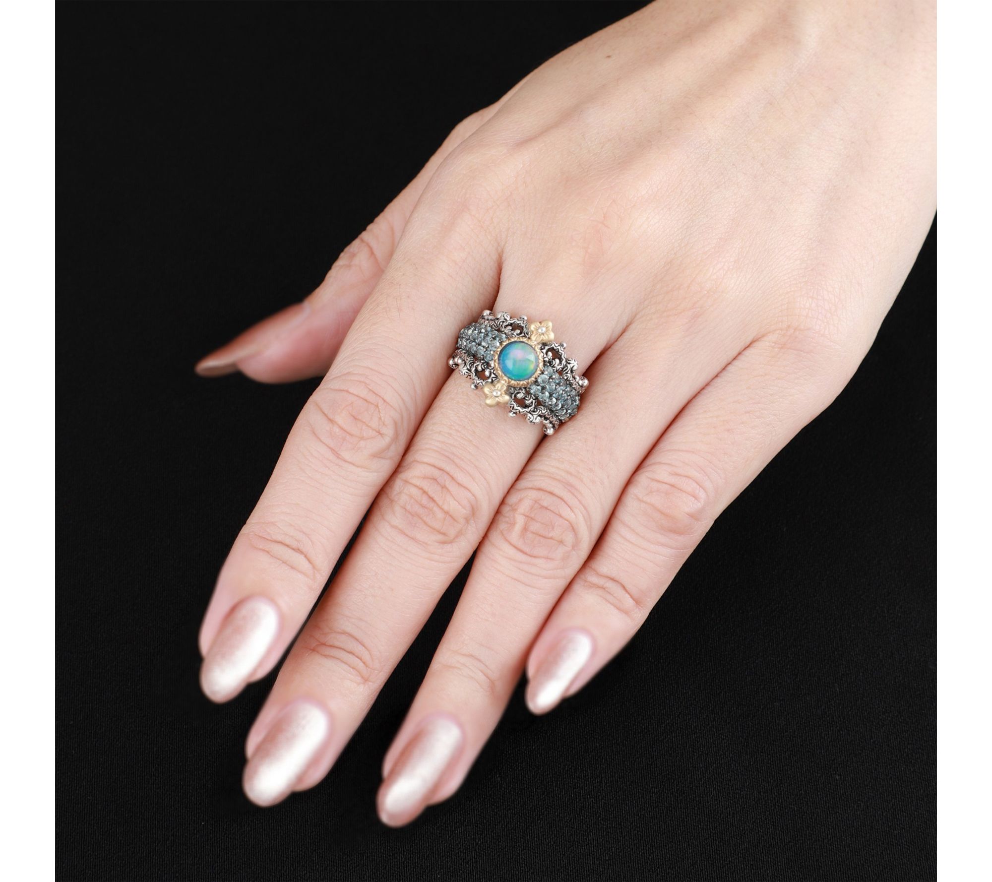 Slip on this opal and topaz ring to add a fresh focus to your everyday look or make any special occasion sparkle. Vibrant pops of color framed by sterling silver and 18K gold details bring a touch of artful elegance to every gesture. From Barbara Bixby.