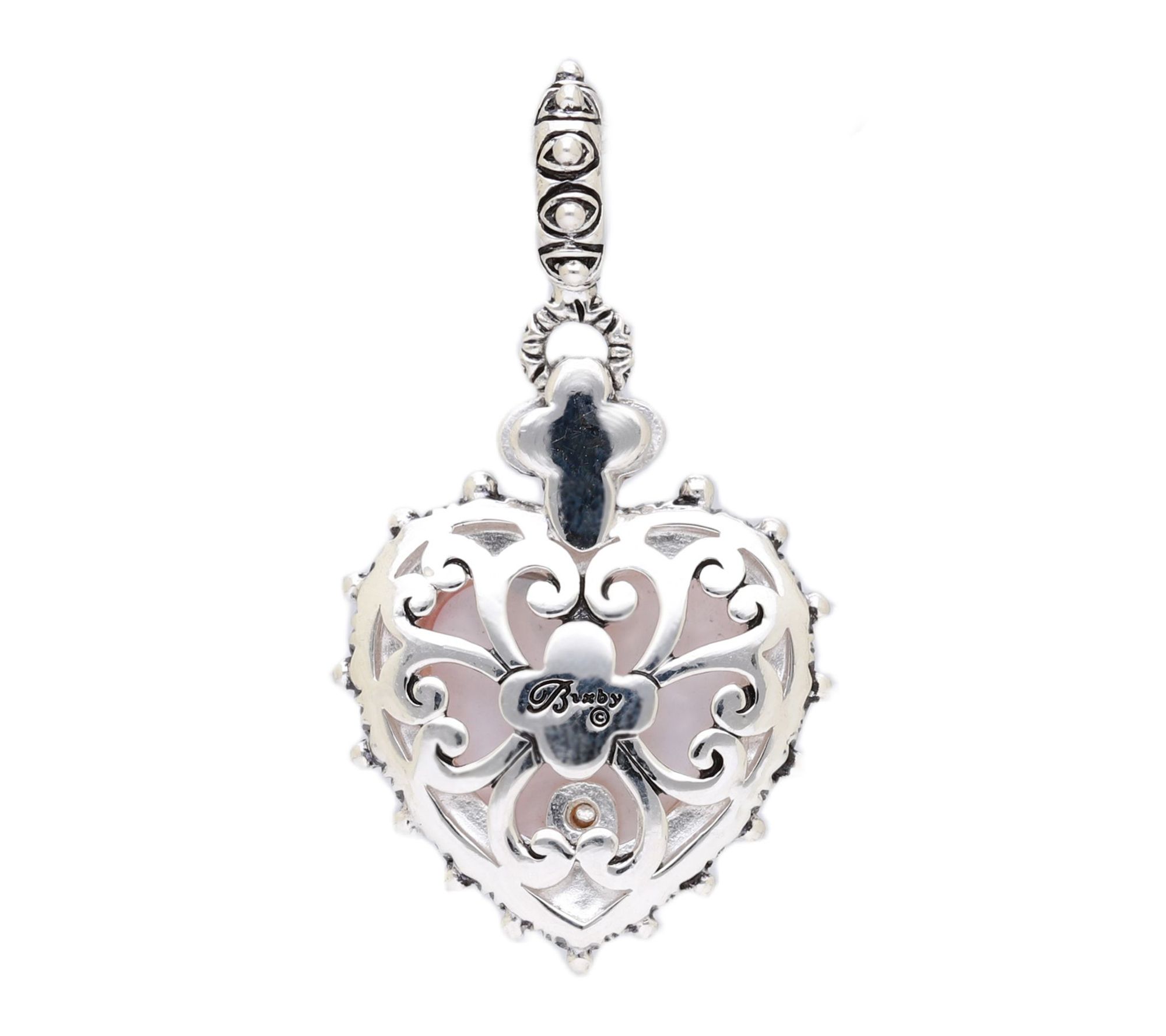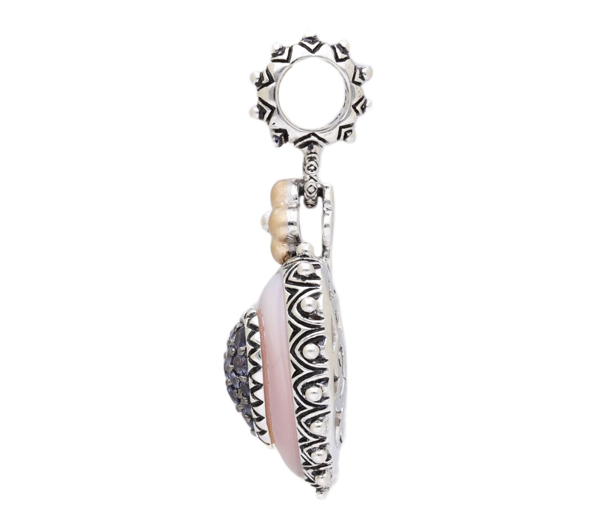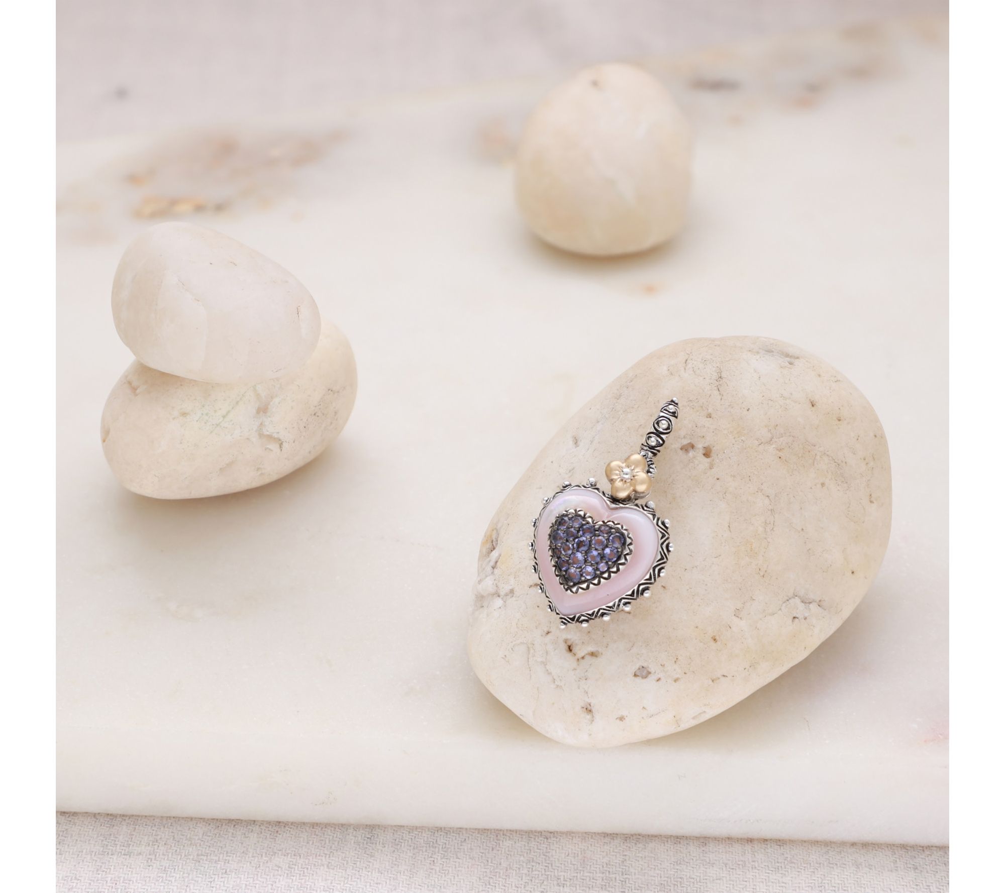 An eye-catching display of color and artistry, this heart charm captures warm moments with its pink mother of pearl accented by iolite pave at the center. Delicate beading and rich texture surround the design, finished with Barbara Bixby's signature 18K yellow gold flower detail for a graceful touch. Add this pendant to a favorite chain or charm bracelet for a vibrant pop of personality and timeless elegance. From Barbara Bixby.