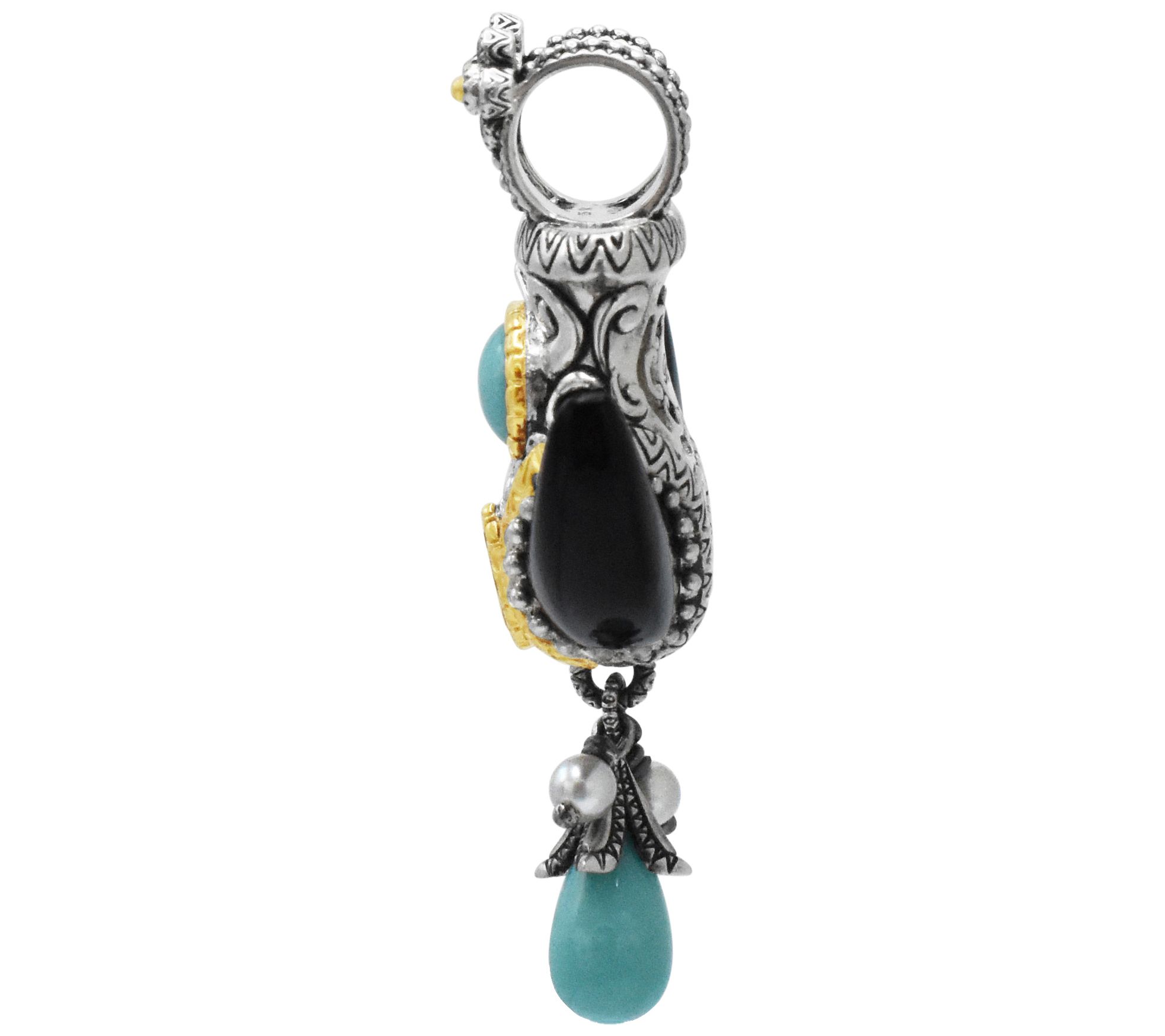 Horn motif with black onyx, rhodolite, green turquoise, and cultured freshwater pearl accents