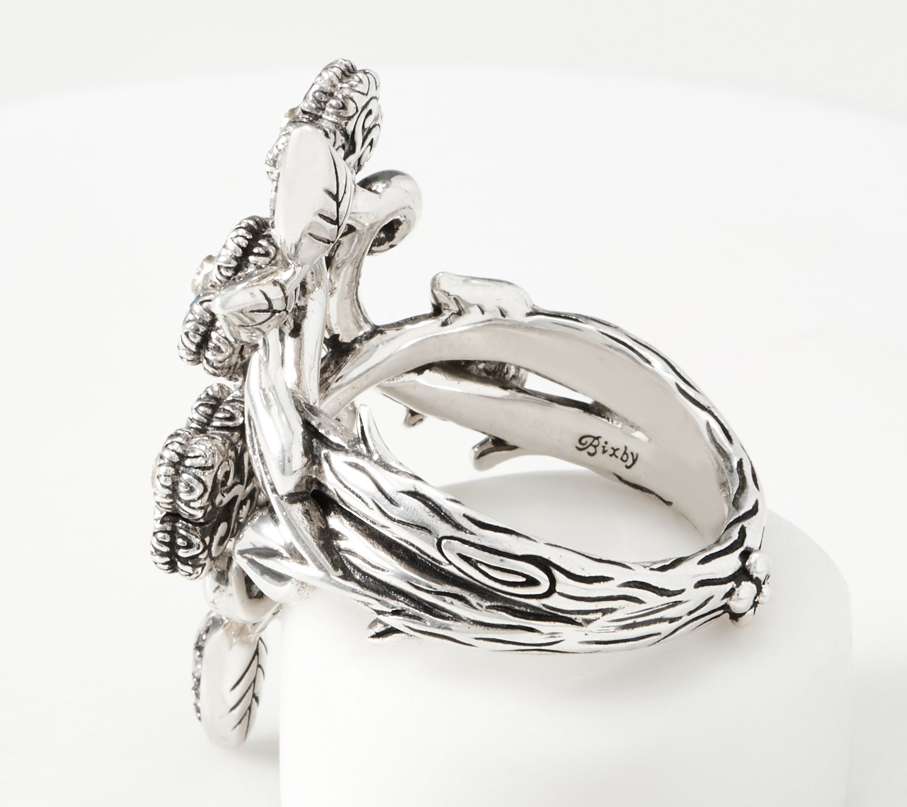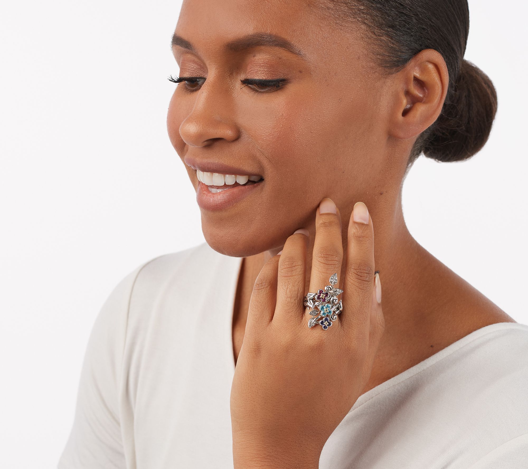 Wrap your finger in beaming beauty with this gorgeous gemstone ring. Adorned with a line of signature flowers and sparkling gemstones, this piece will brighten any day. From Barbara Bixby.