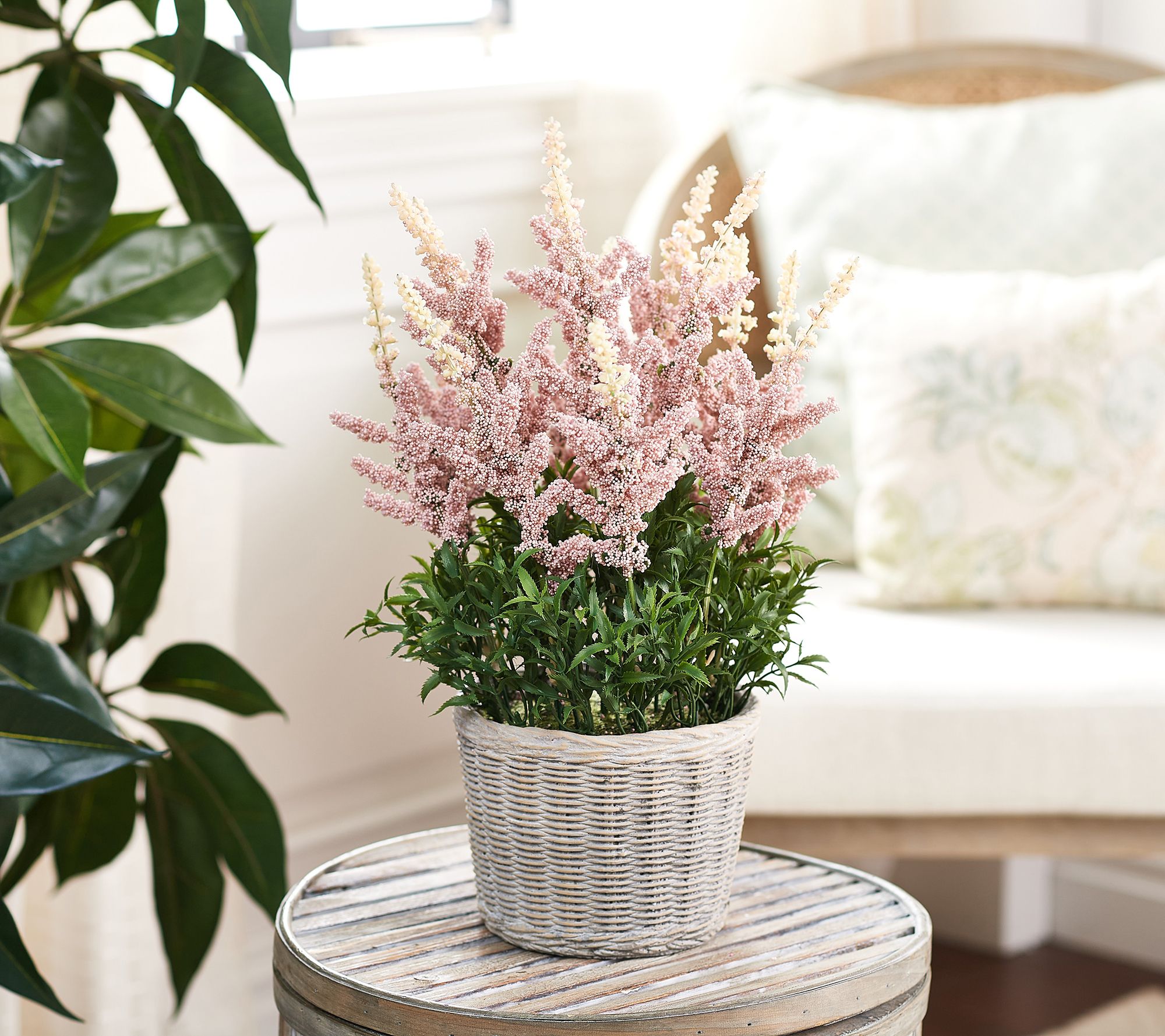 Sprouting straight towards the sky, this lifelike astilbe plant adds life (and a lift) to a lonely tabletop, shelf, or porch with realistic-looking color (and it never needs watering). From Barbara King.