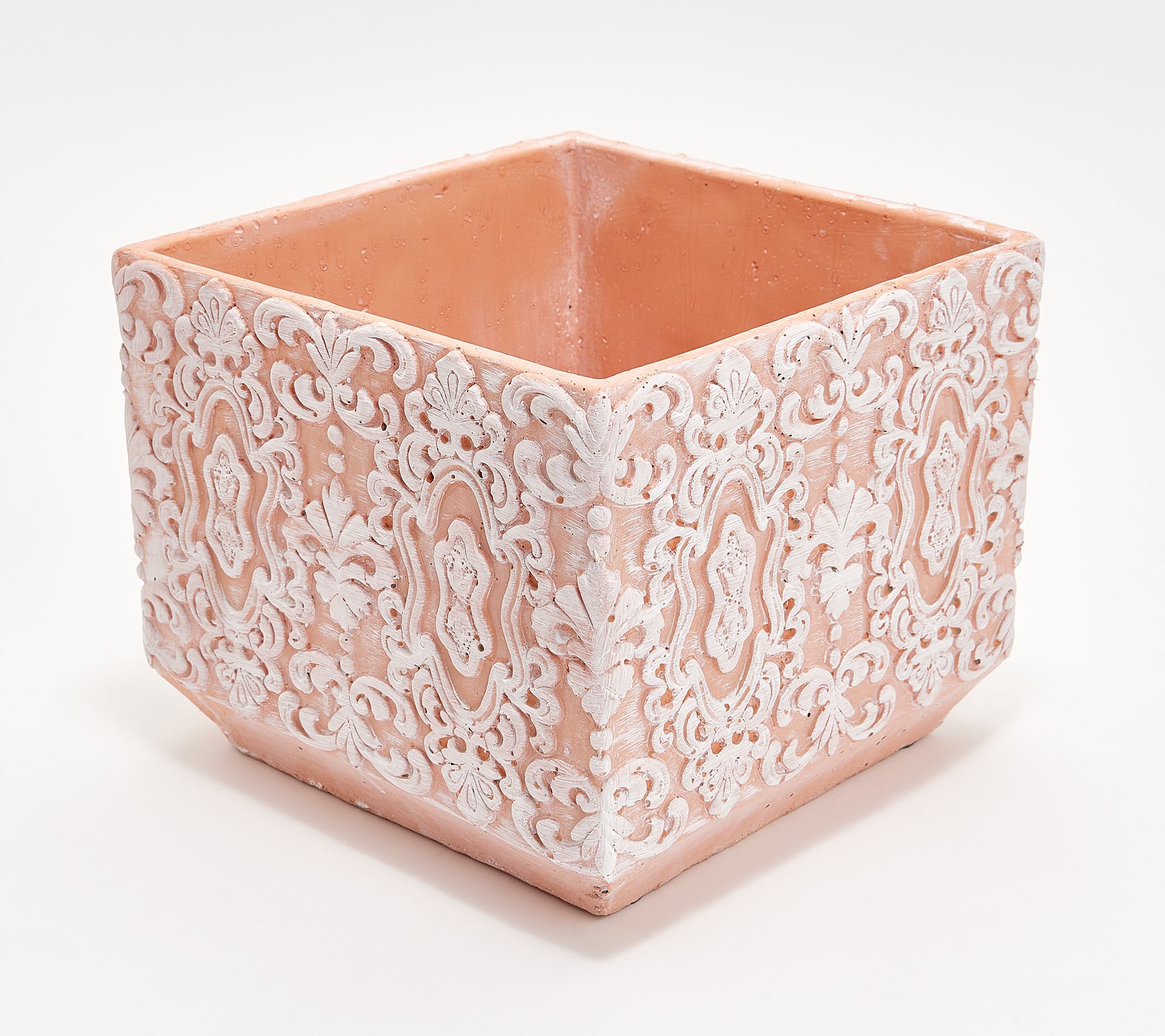 Give your plants a beautiful home with this cement square planter. A painted white raised scroll design adds something extra special. From Barbara King.
