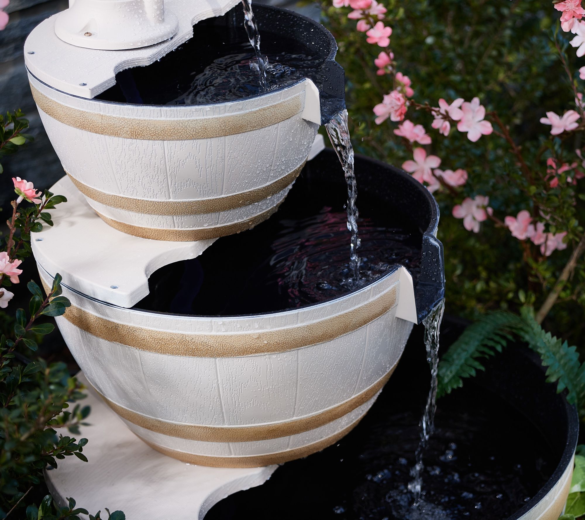 Turn your personal space into a relaxing oasis with this barrel fountain. Enjoy the soothing sound of cascading water as it flows from the spigot, down three tiers, and into the large basin below. From Barbara King.