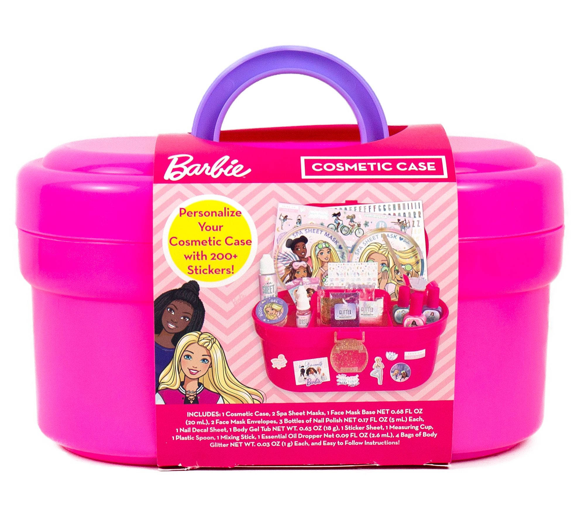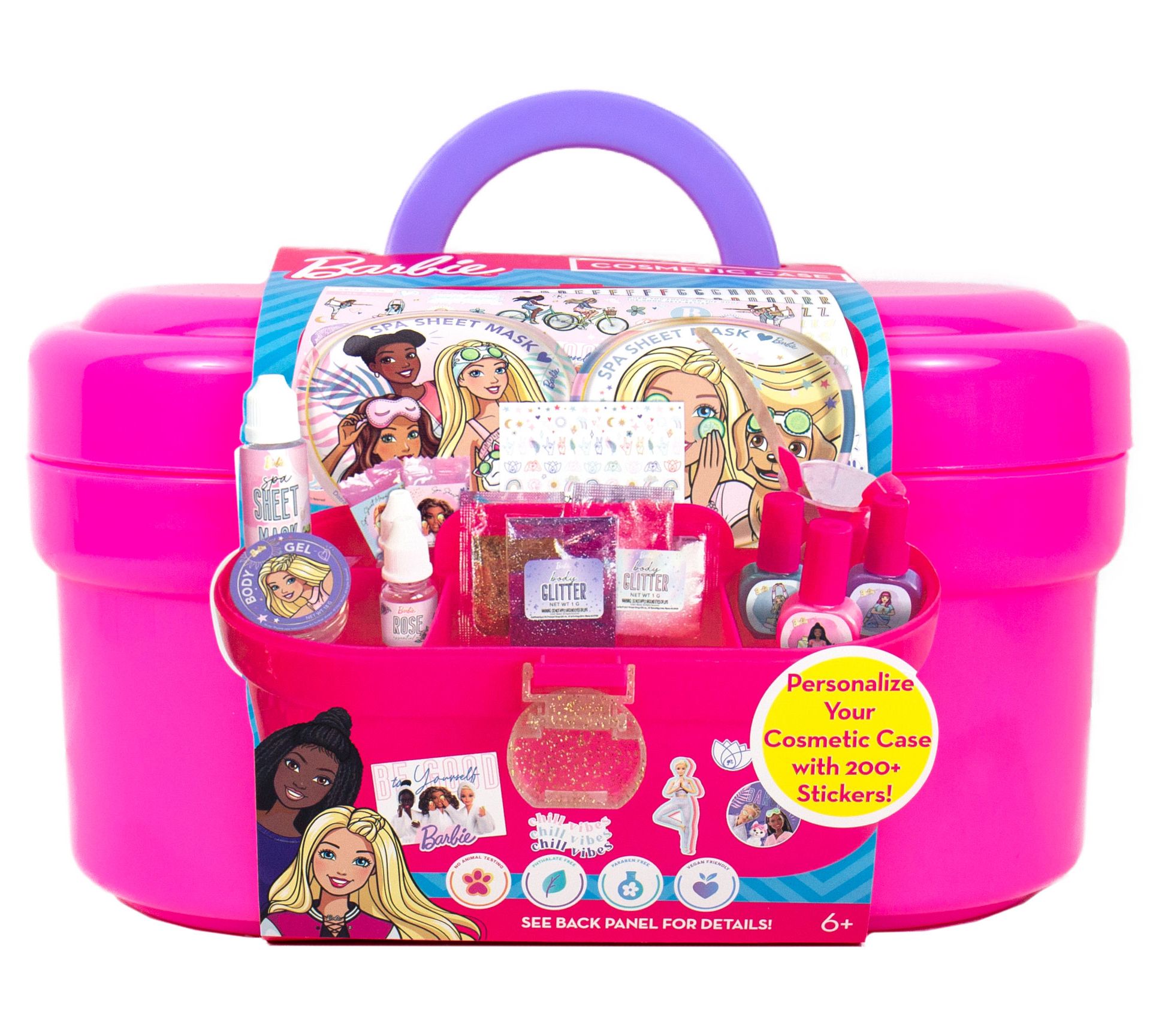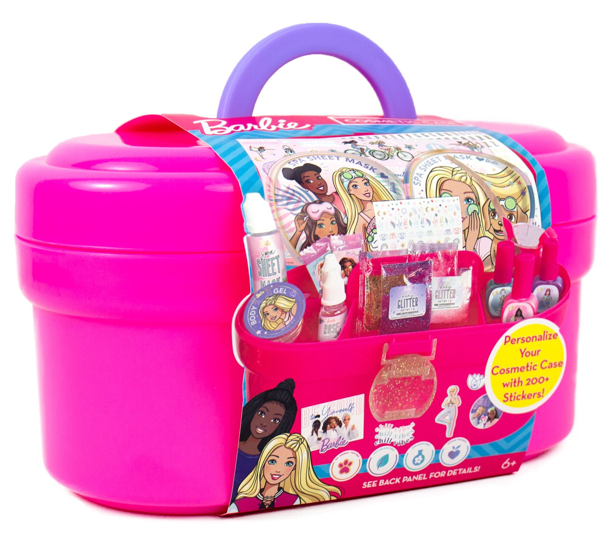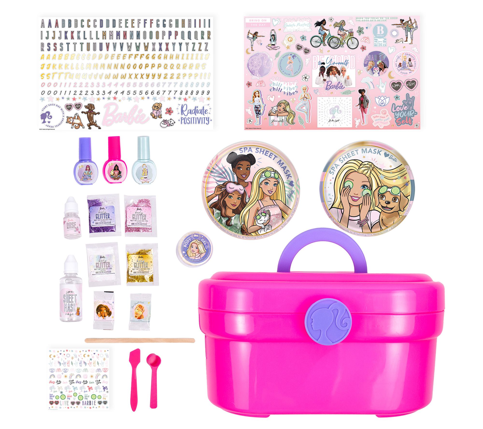 Inspire pretend play with this colorful spa box perfect for slumber parties, featuring face masks, nail polish, body glitter, and more to foster creativity. From Barbie.
