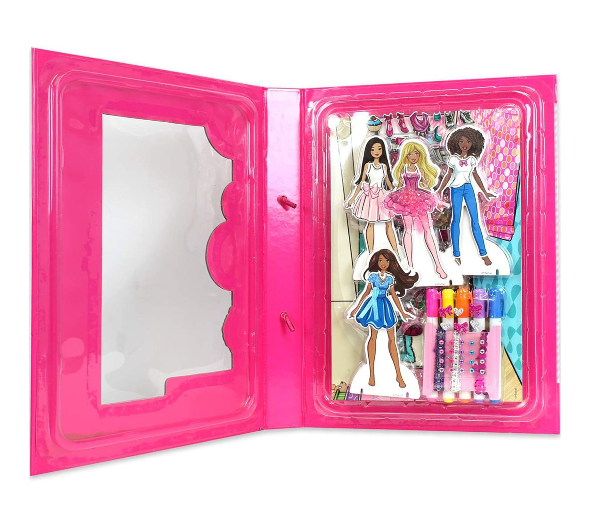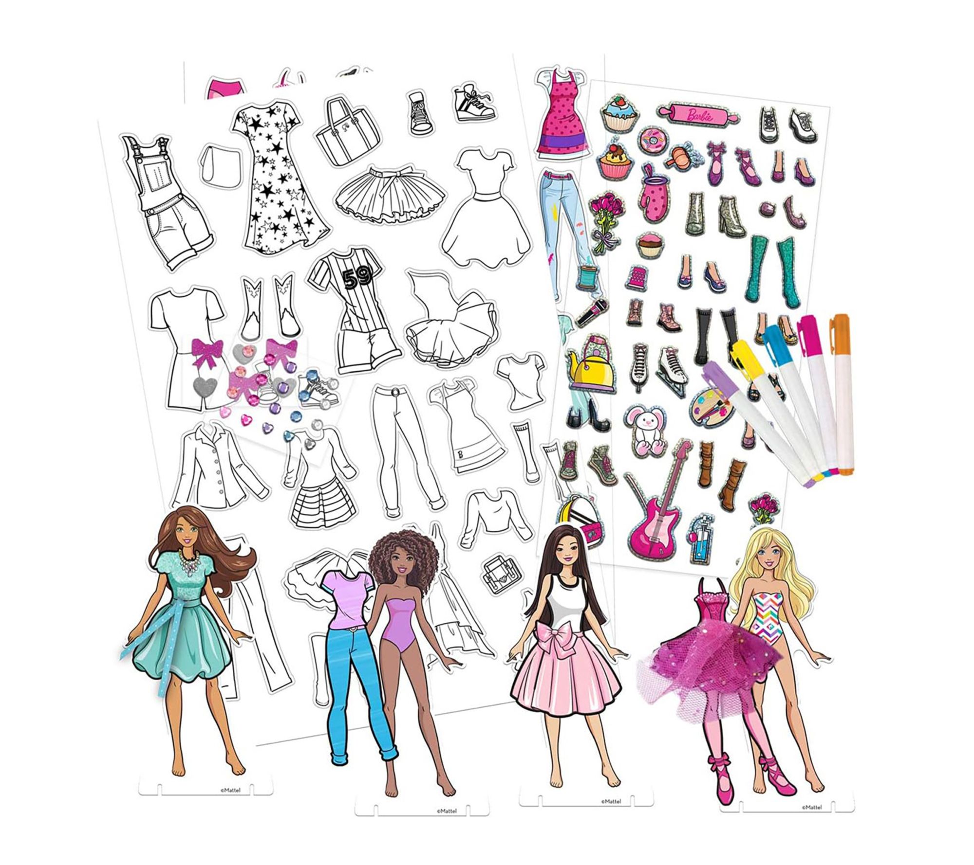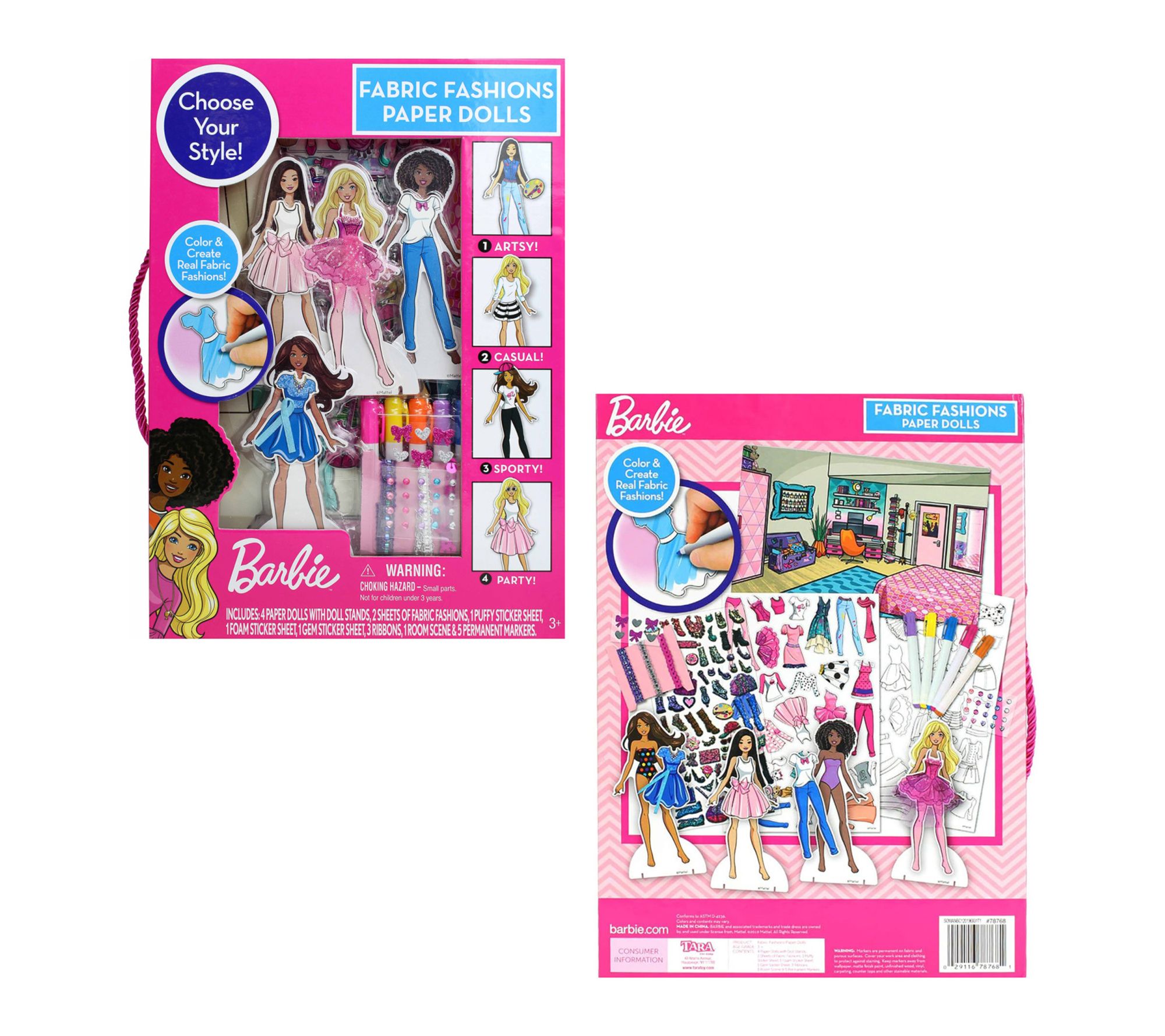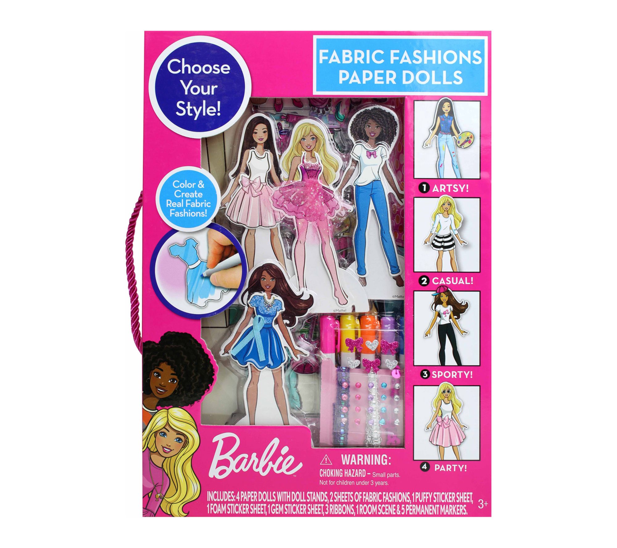 Your aspiring fashion designer can dive into a world of style with this creative arts and crafts playset featuring Barbie paper dolls. Kids mix, match, and color fabric fashions, then embellish looks with stickers, gems, and ribbons -- building endless outfits for hours of imaginative play. Convenient storage makes cleanup easy when inspiration strikes again.