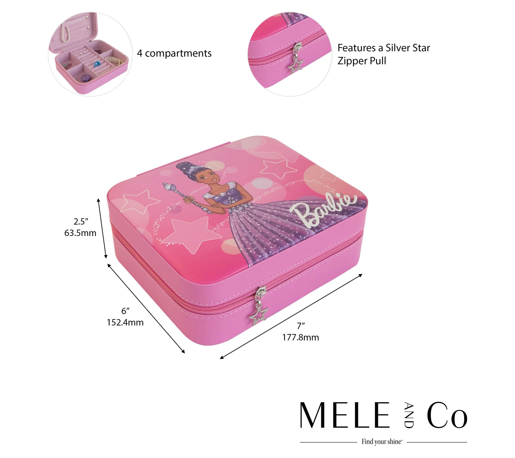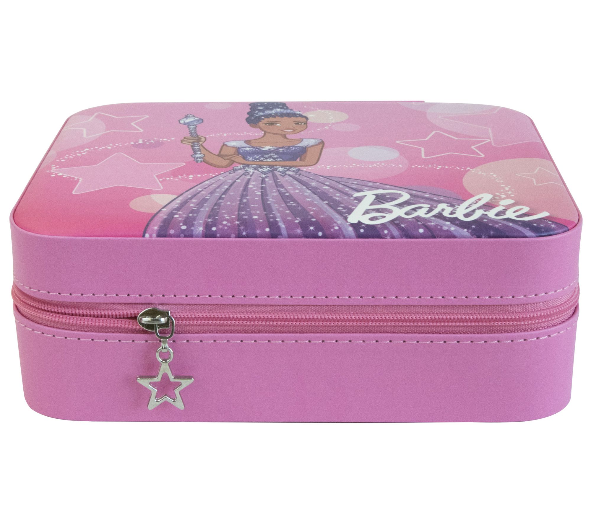 Take your jewelry on the go with the Barbie Star travel jewelry case. This stylish case features a fuchsia exterior with a charming design, making it perfect for young jewelry enthusiasts. Inside, you'll find three jewelry straps, four open area sections, and a central ring roll section, all lined in fuchsia sueded fabric. From Mele and Co.
