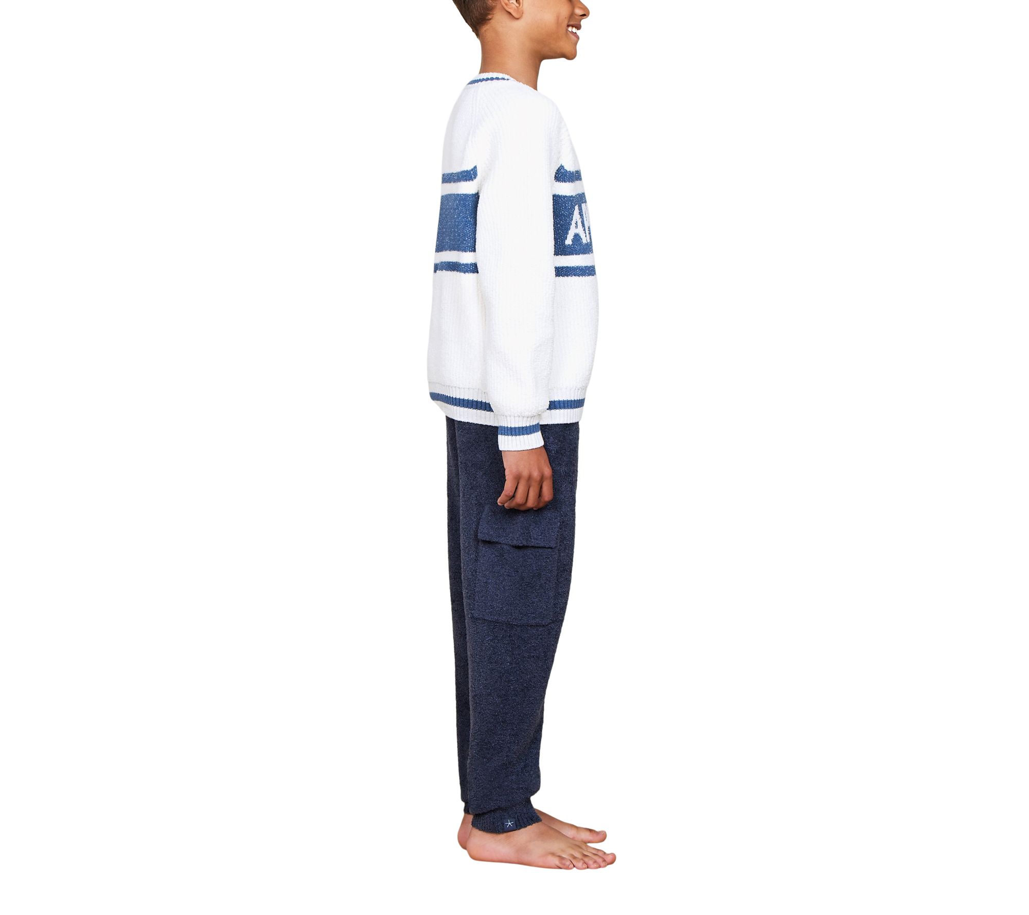 Whether they're hitting the slopes or just aiming for sporty fashion, the CozyChic Cotton Youth Apres Ski Pullover has got them covered. Made for both warmth and style, this pullover features a raglan sleeve design and intarsia Apres Ski detailing on the chest. Sports stripe ribbed neck, cuffs, and waistband complete the look, making it a versatile piece for cold-weather wardrobes. From Barefoot Dreams.