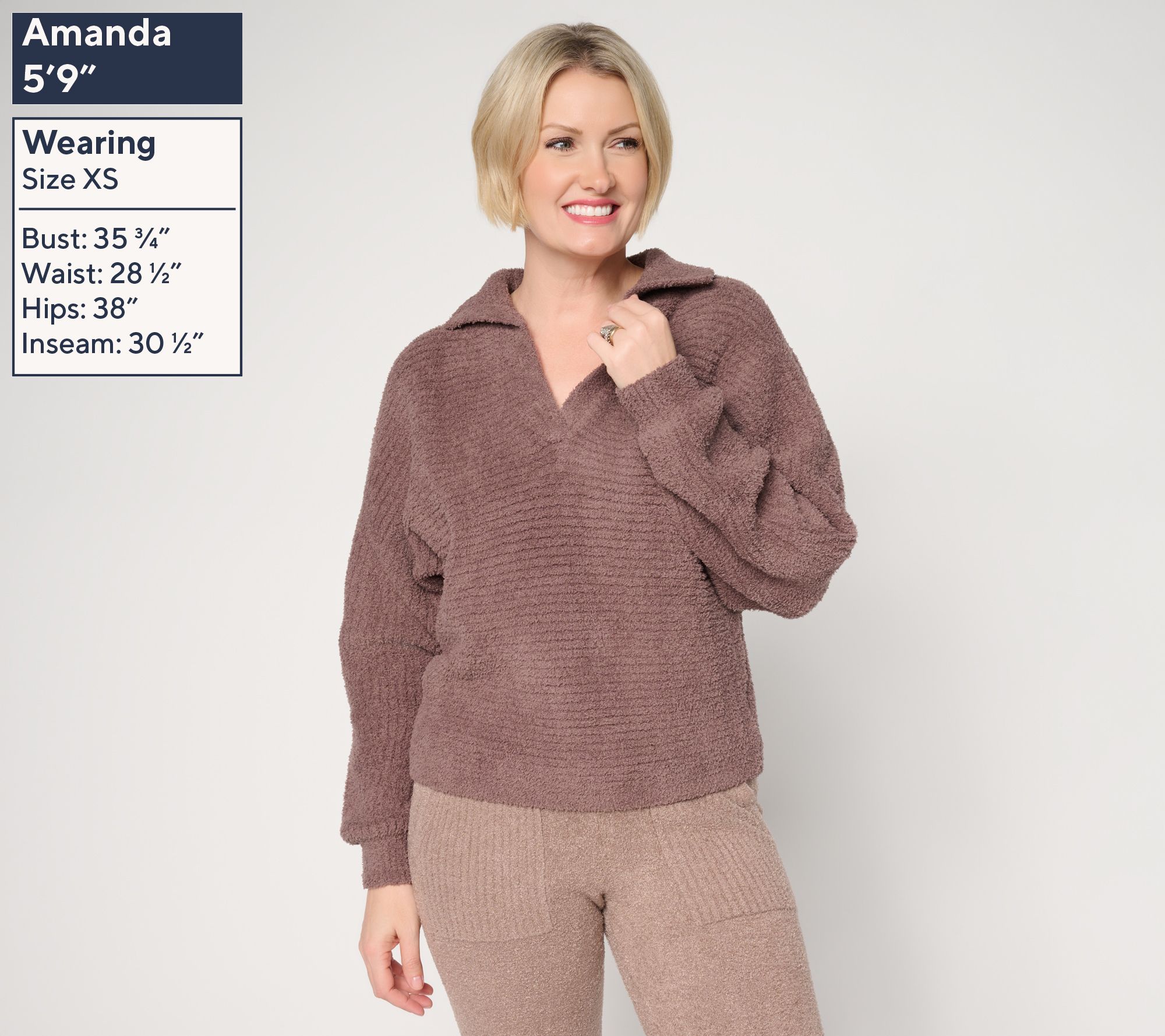Whether it's a relaxed morning at home or brunch with friends, this ribbed knit pullover brings comfort and style with a collared V-neckline and dolman sleeves. The drapey silhouette features horizontal ribbing for texture and vertical rib accents at the hem and sleeve openings, making it easy to pair with denim or leggings. From Barefoot Dreams.