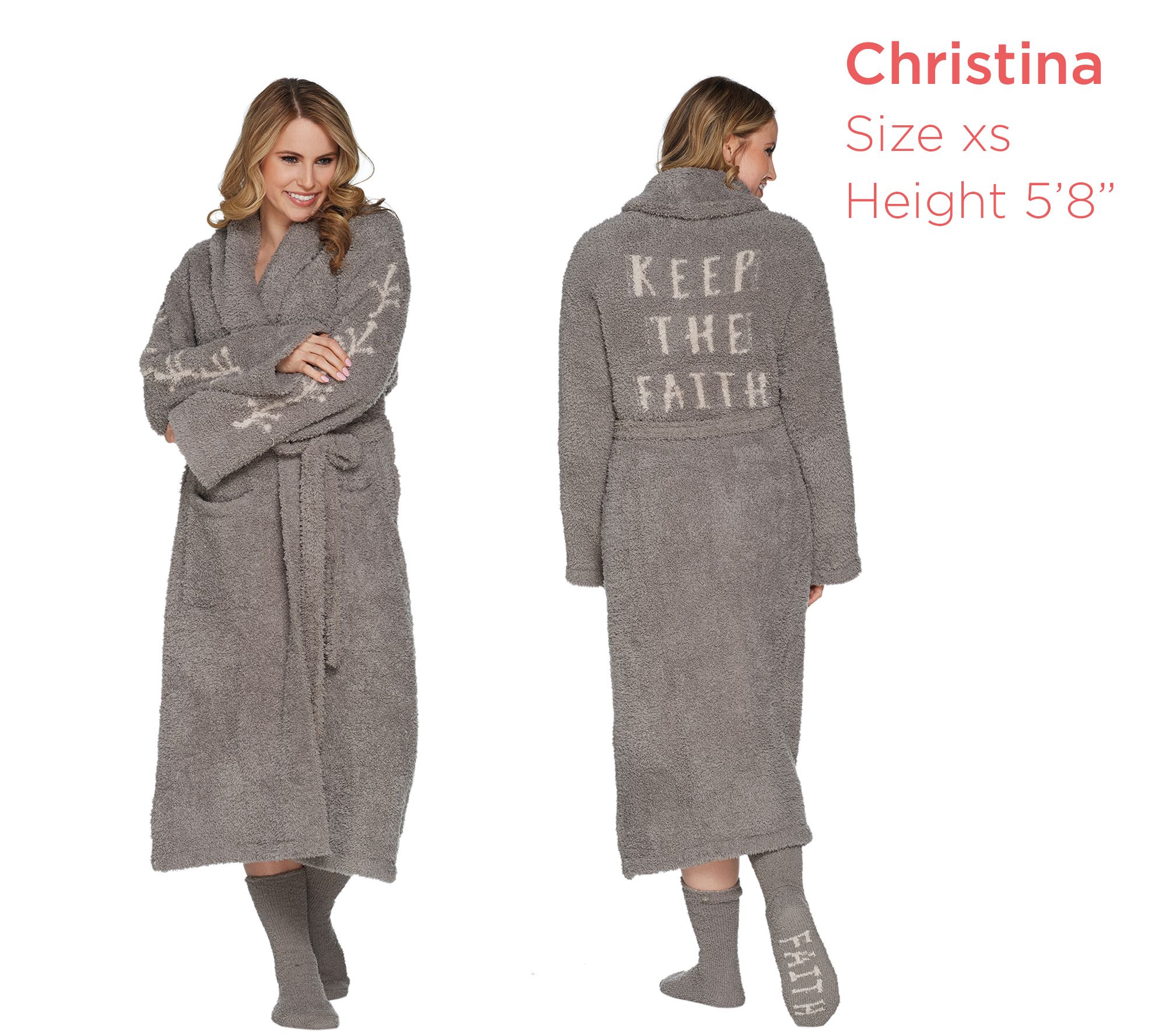 Robe Features: shawl collar, adjustable belt, two front patch pockets, inspirational message on back
