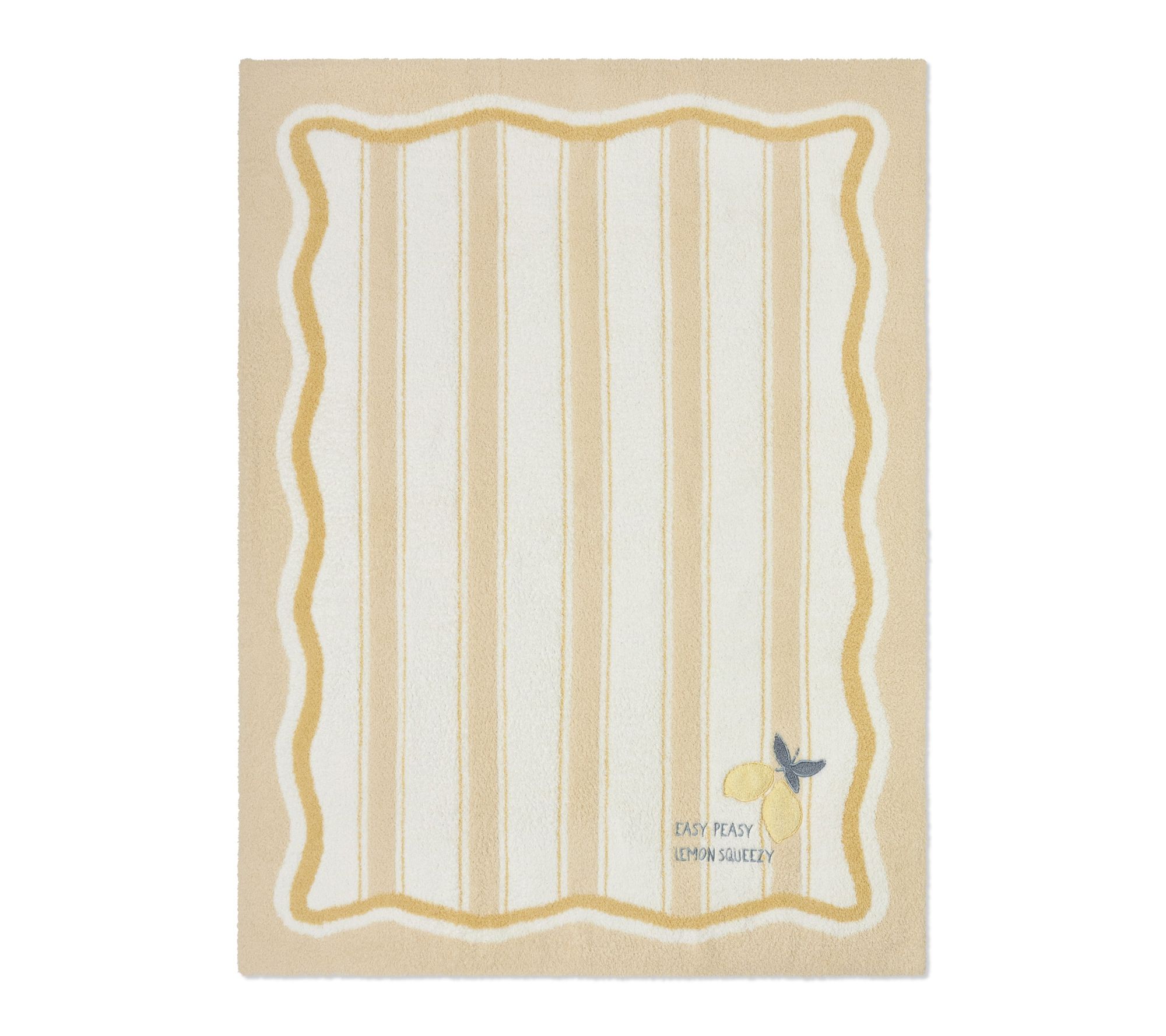 • Features a reverse jacquard knit with a striped center, whimsical wavy border, and "EASY PEASY LEMON SQUEEZY" embroidered quote