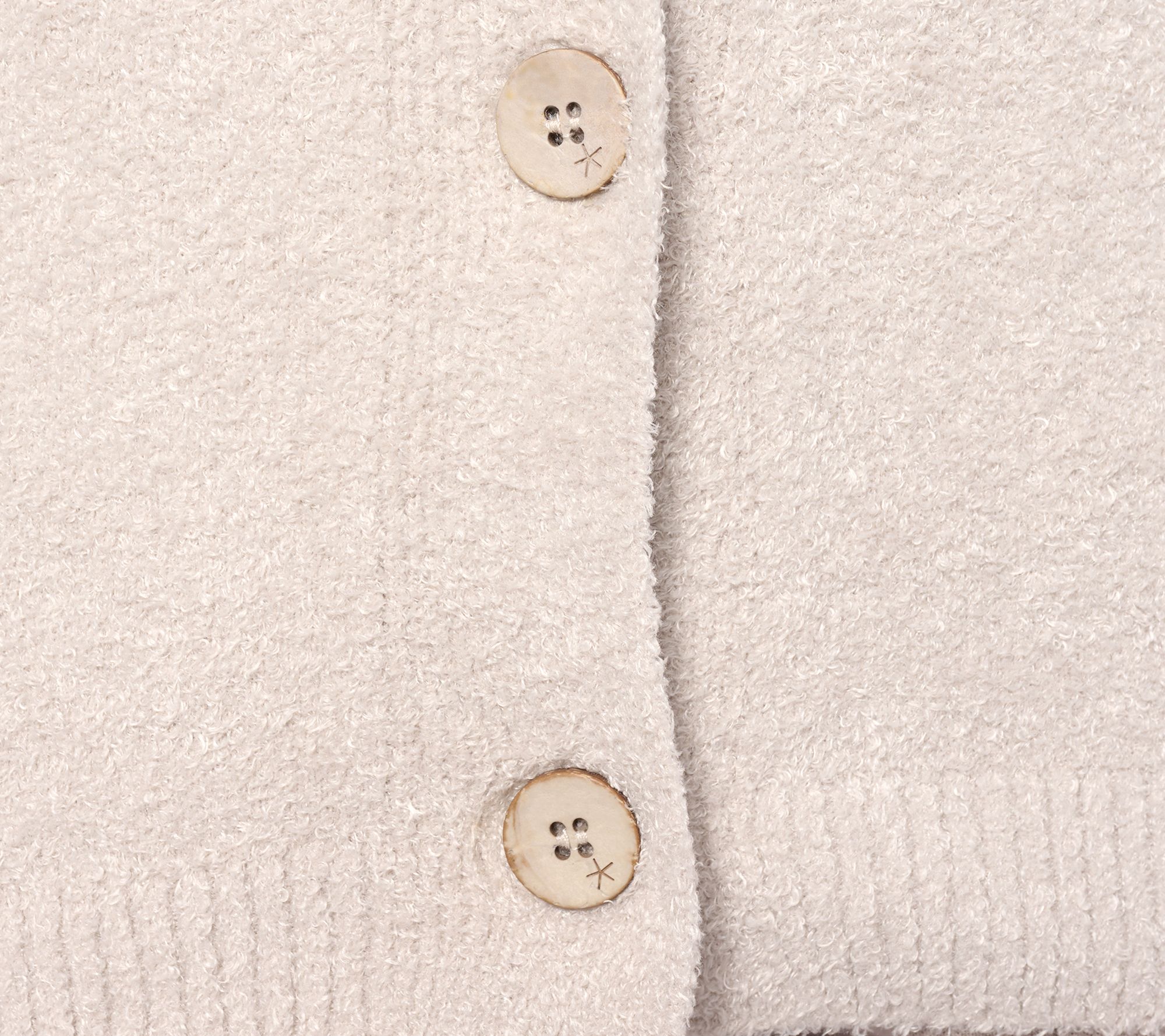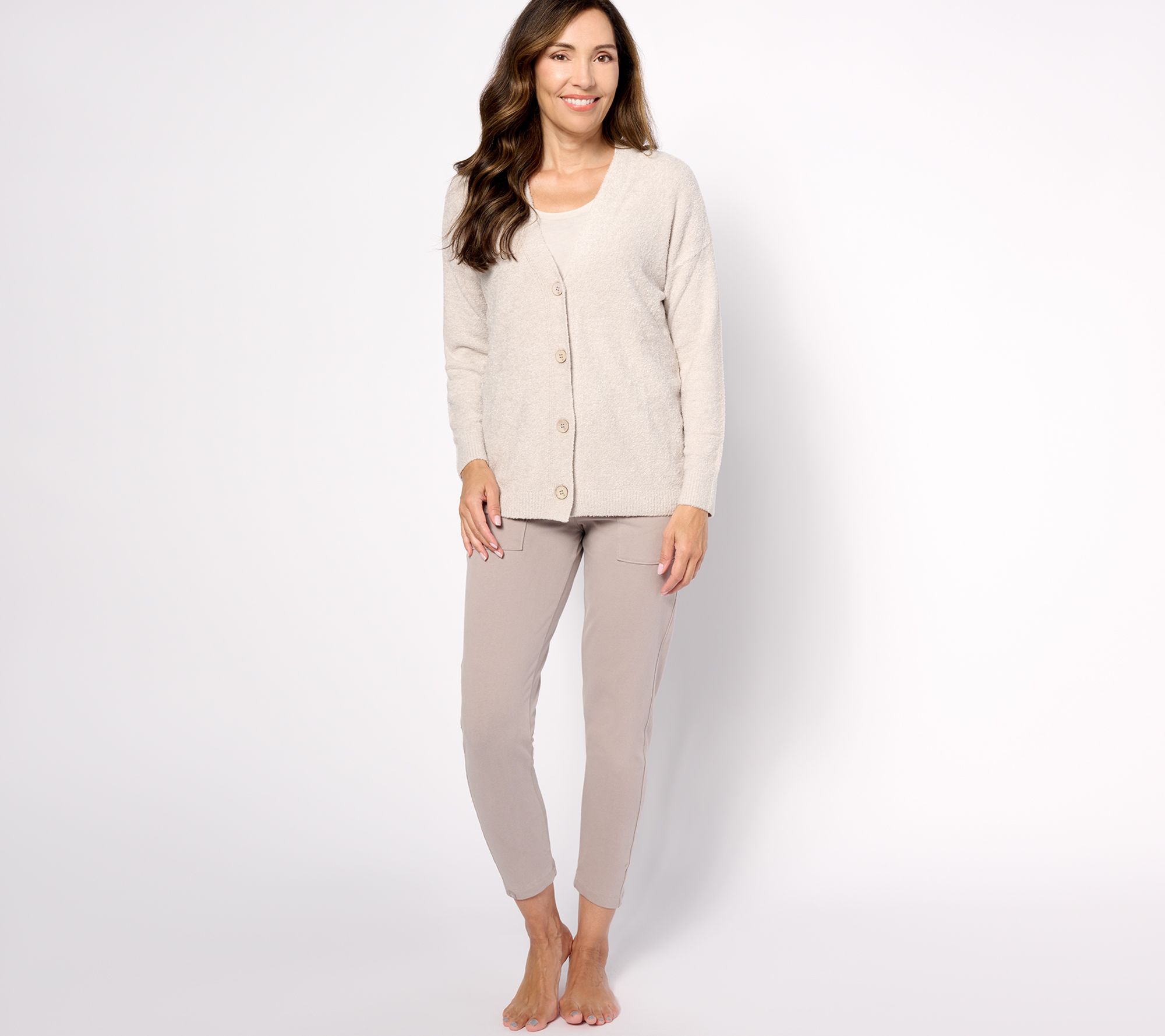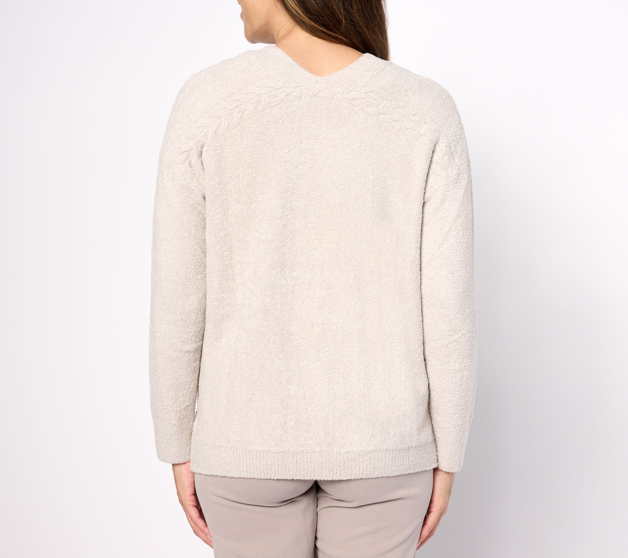 This cozy cardigan comes with a cable-knit detail in the back and a button front that makes for a very feminine and flattering look. The open V-back adds a fashionable finishing touch. From Barefoot Dreams.