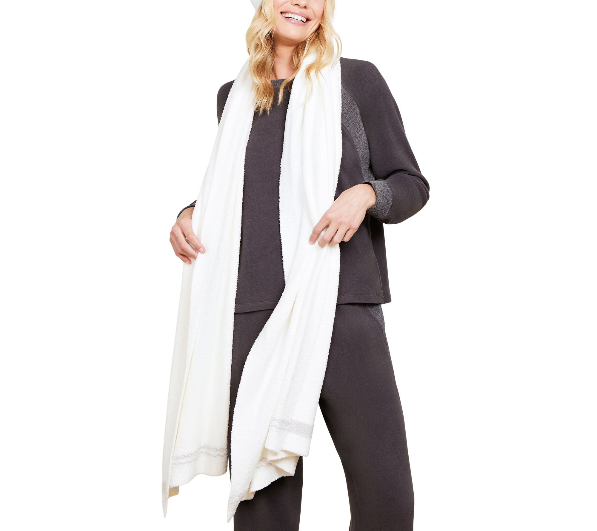 From cozy fall evenings to chilly winter days, the Barefoot Dreams CozyChic Lite Nordic bordered wrap will keep you stylish and warm. Featuring a traditional Nordic pattern and ribbed finish, this wrap complements any outfit with effortless elegance. From Barefoot Dreams.