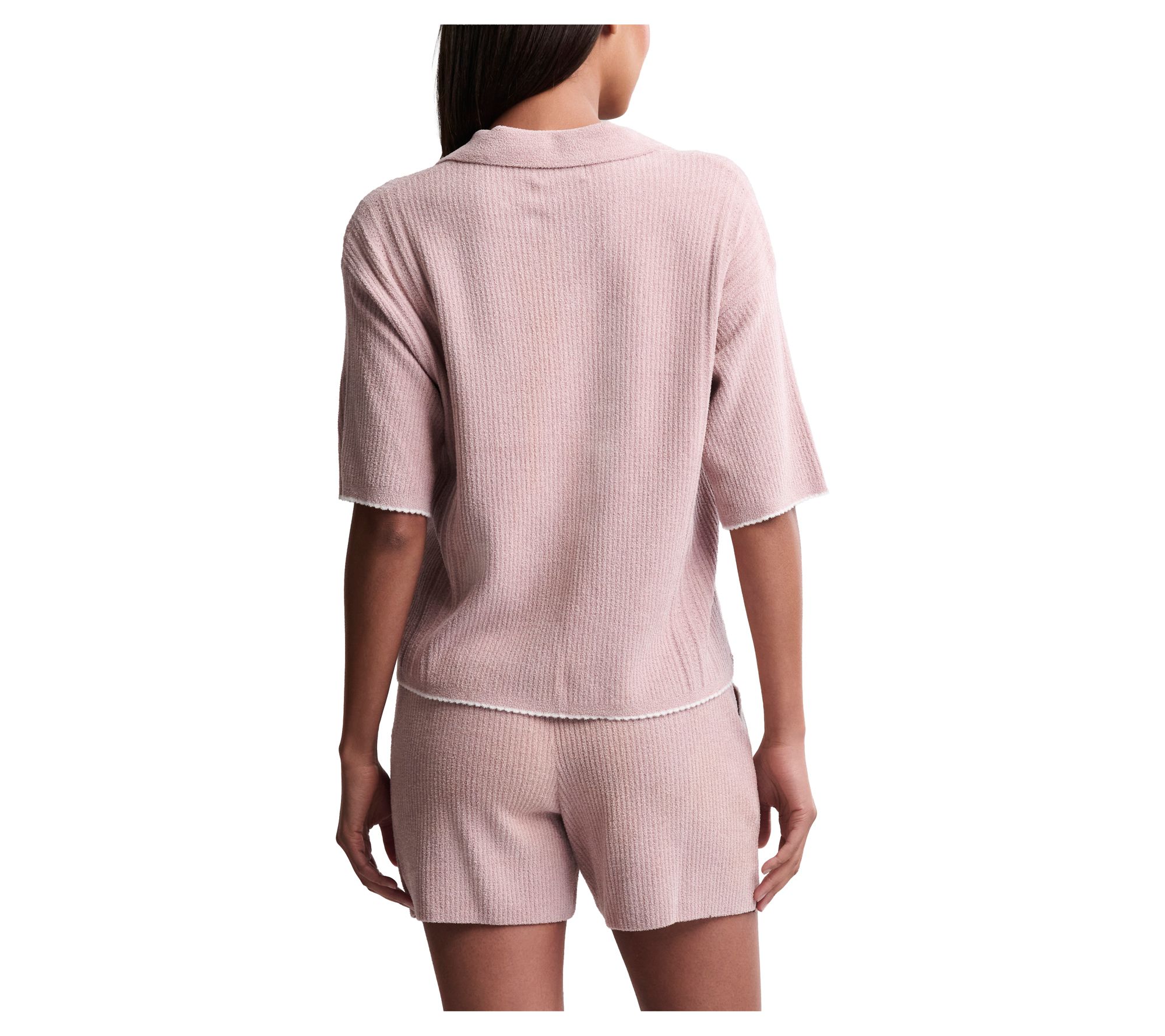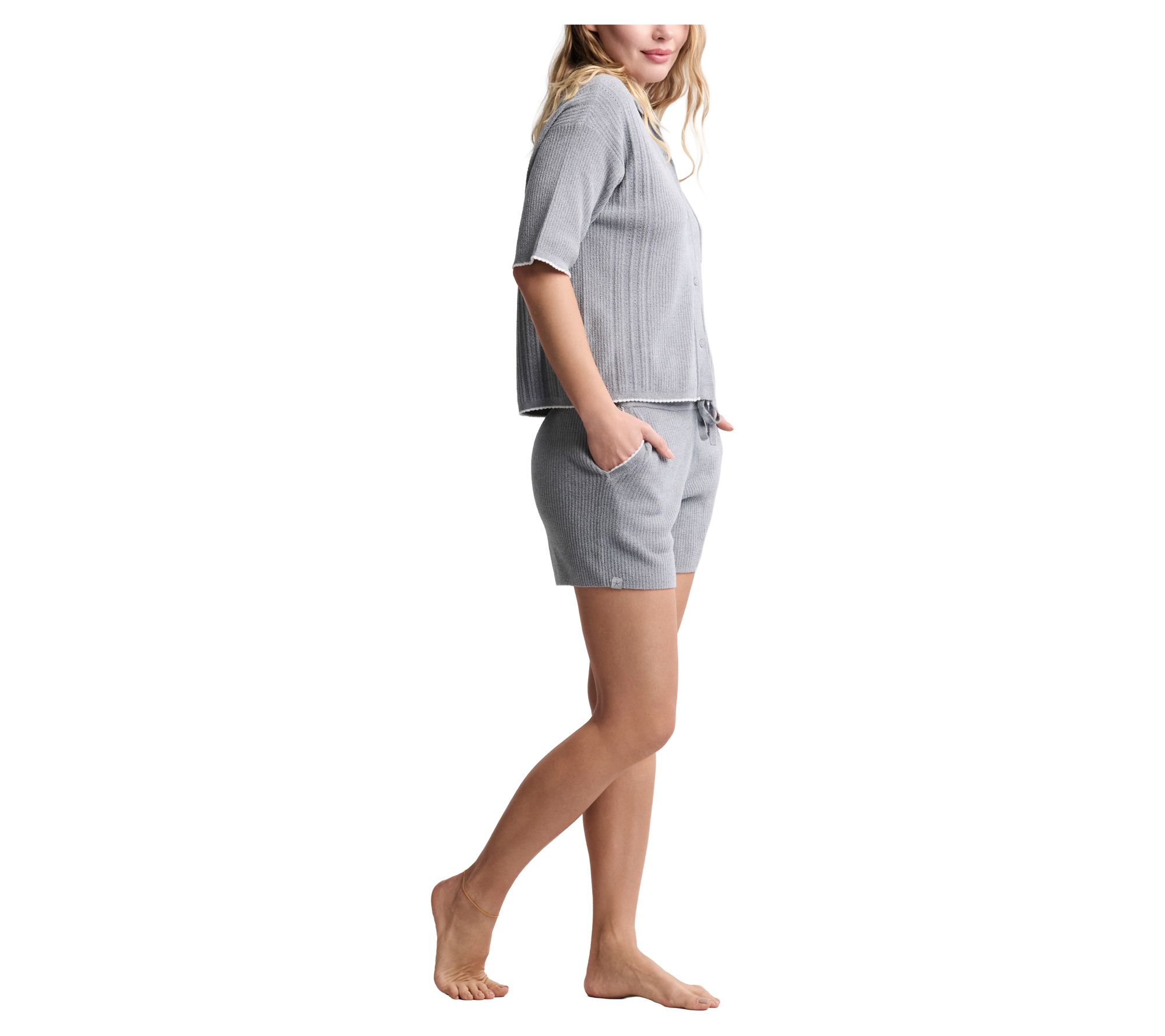 Whether you're lounging on a lazy morning or winding down after a long day, this knit pajama set brings breathable comfort and subtle sophistication to every moment. Delicate contrast scallop trim and airy pointelle stitching add feminine flair to the easygoing short-sleeve top and coordinating high-hip shorts -- effortless for cozy nights and casual lounging alike. From Barefoot Dreams.