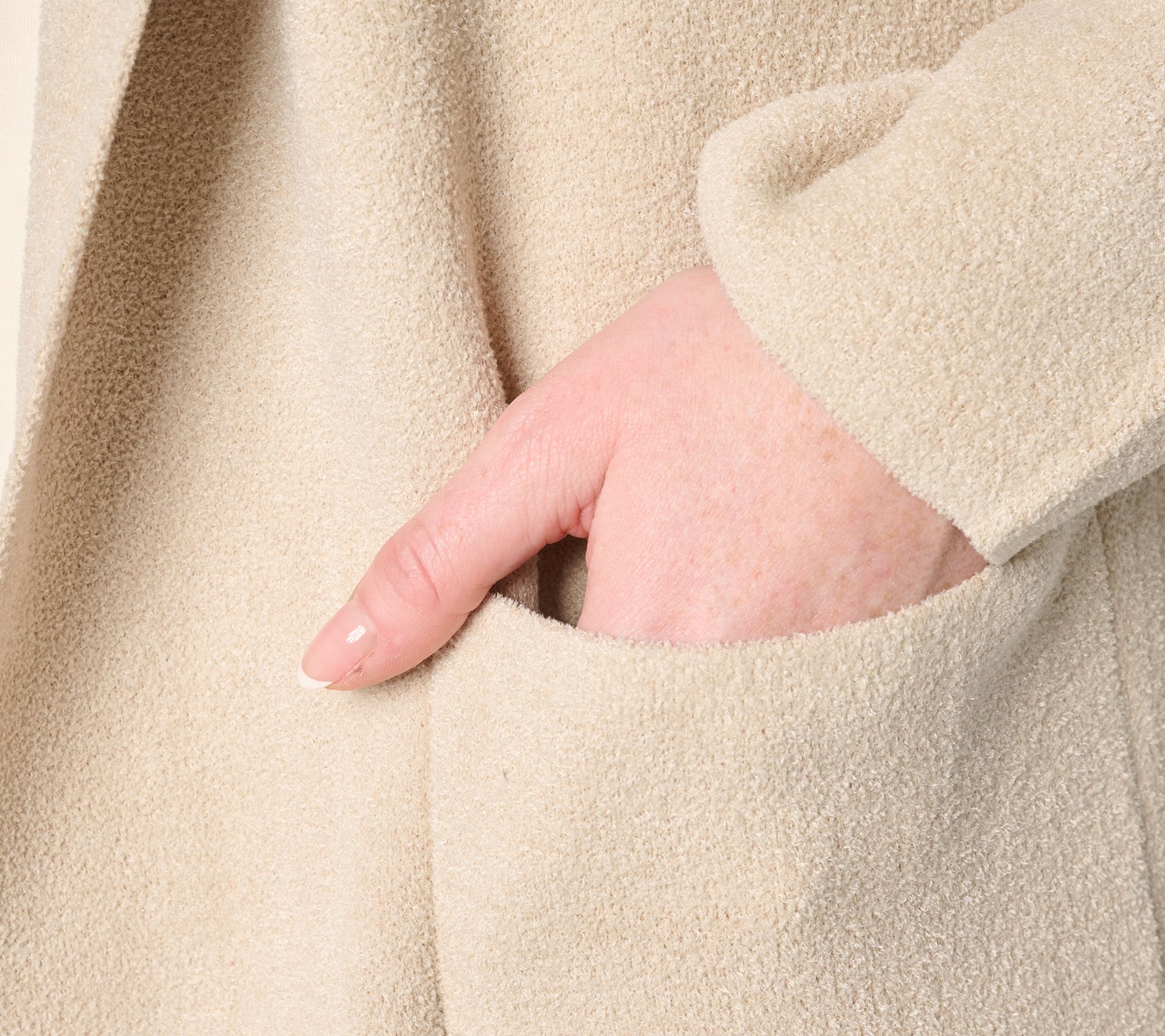 Features: open front, long sleeves, cascading wide shawl collar, patch pockets, side slits