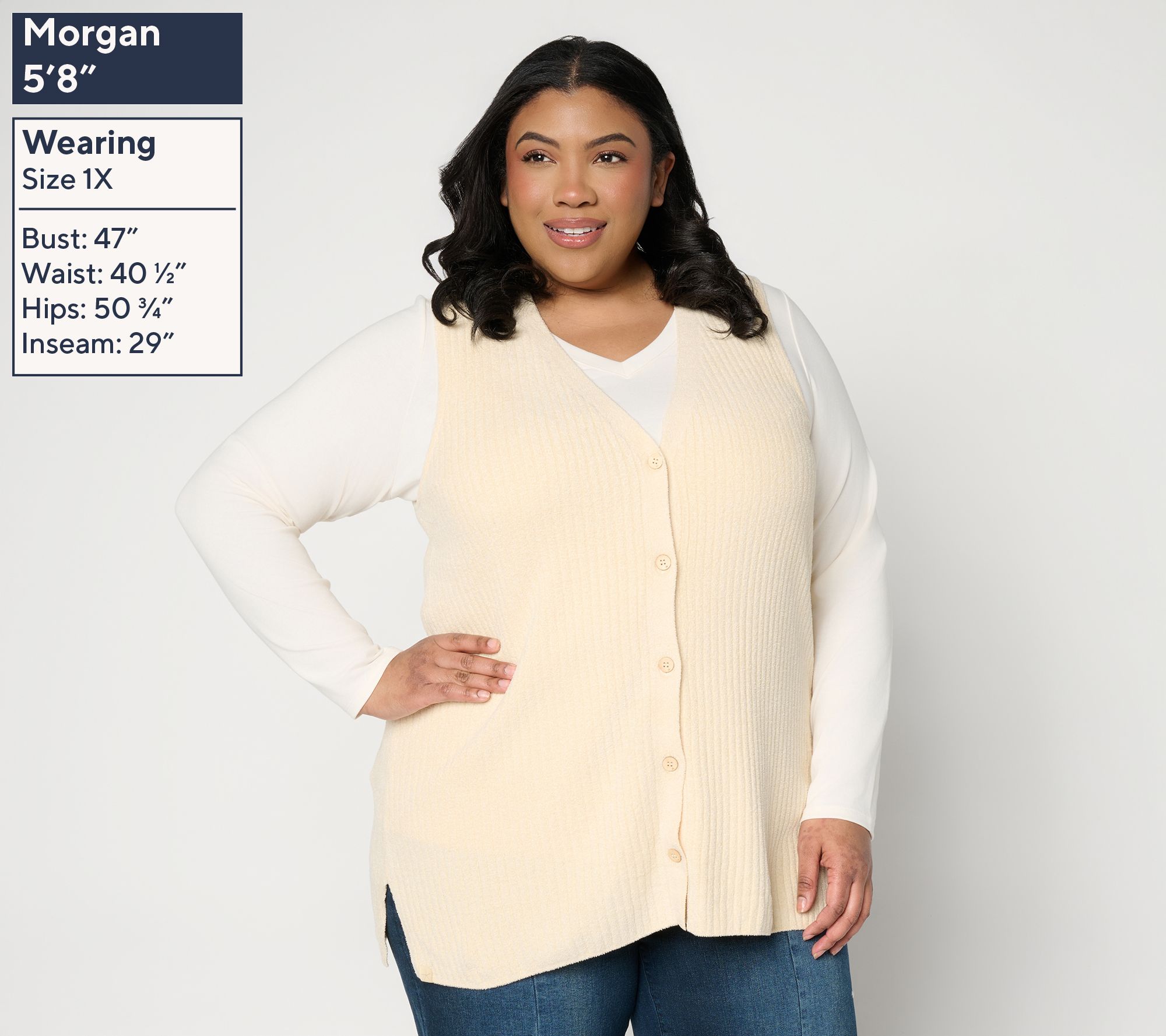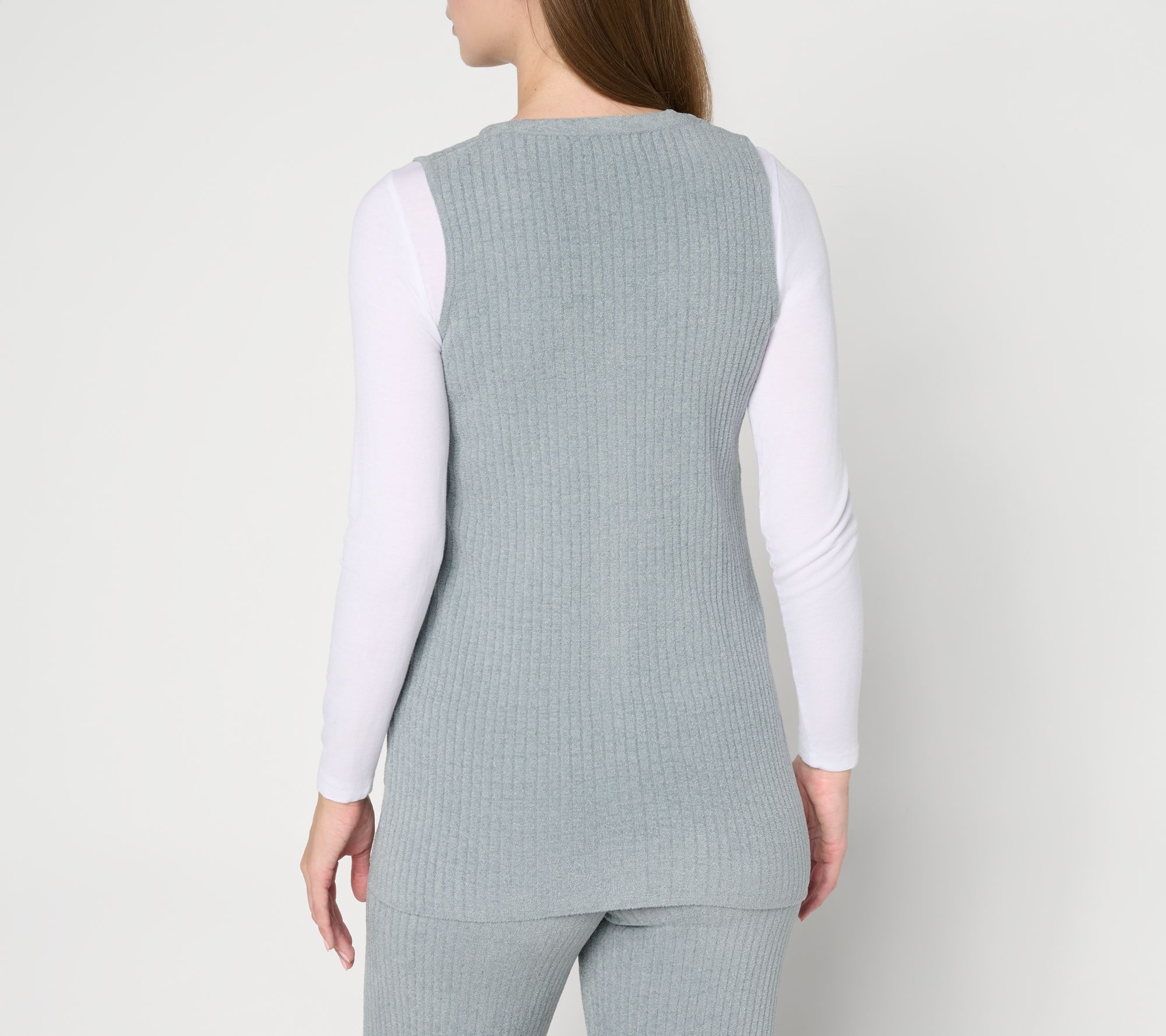 Sunny office days or breezy evenings by the shore feel easy in this sleeveless knit tunic, detailed with button-down front, ribbed texture, and airy side slits. Layer it over a relaxed tee or wear solo with wide-leg pants for an effortlessly chic look with all-day comfort. From Barefoot Dreams.