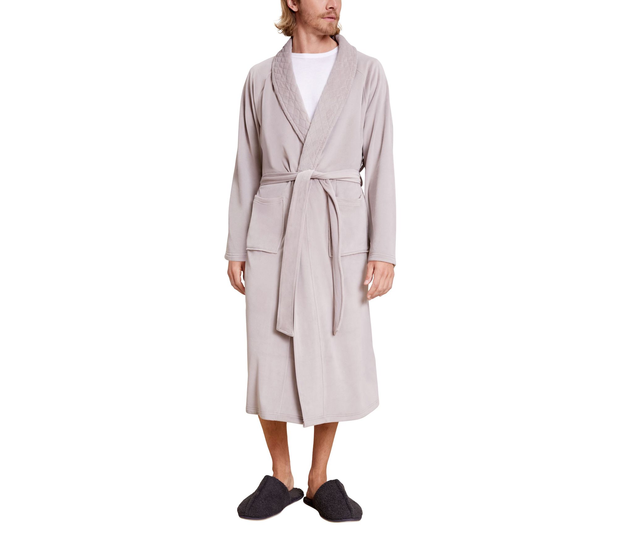 - Features: front patch pockets, adjustable belt tie, quilted lapels, long sleeves