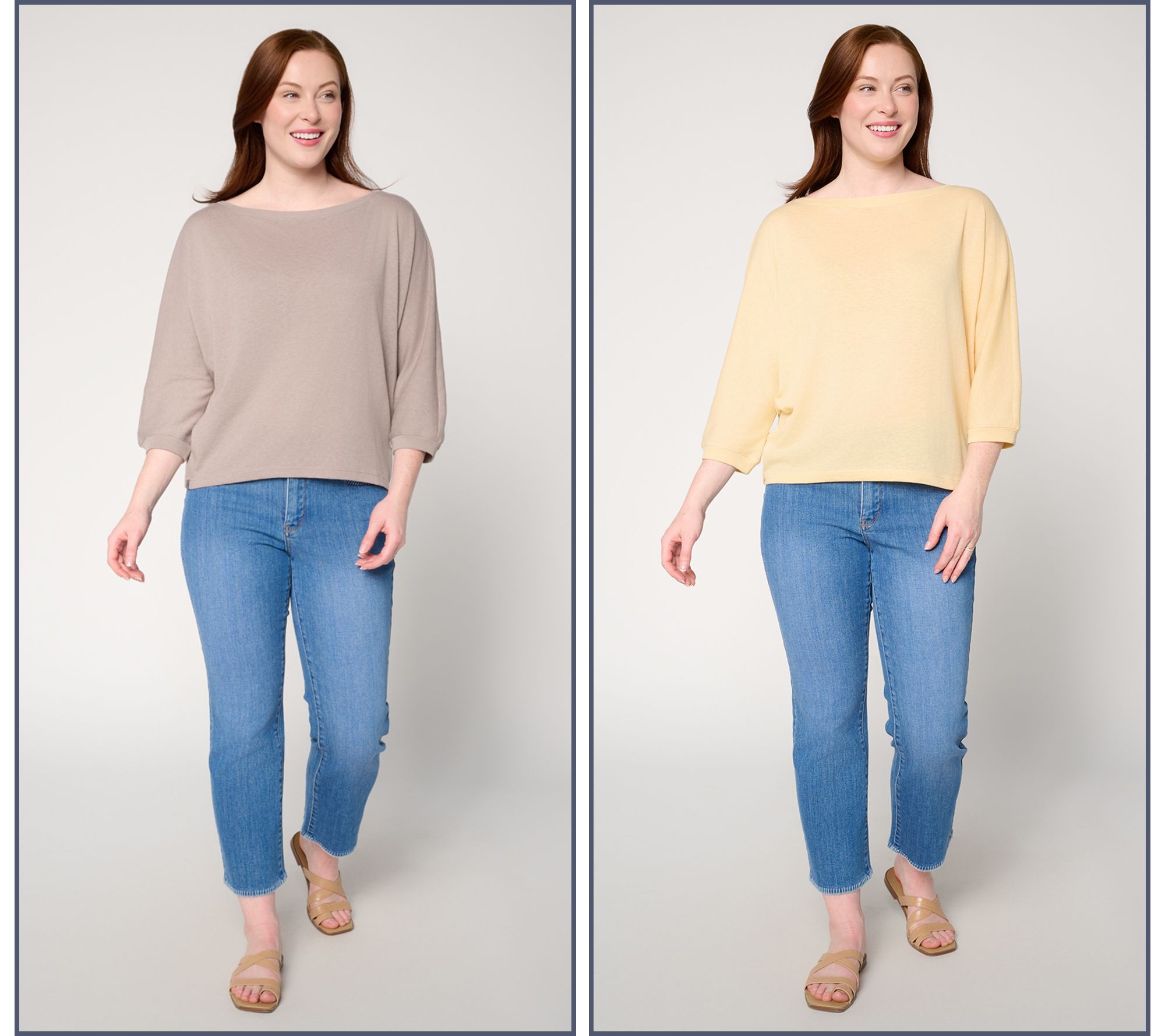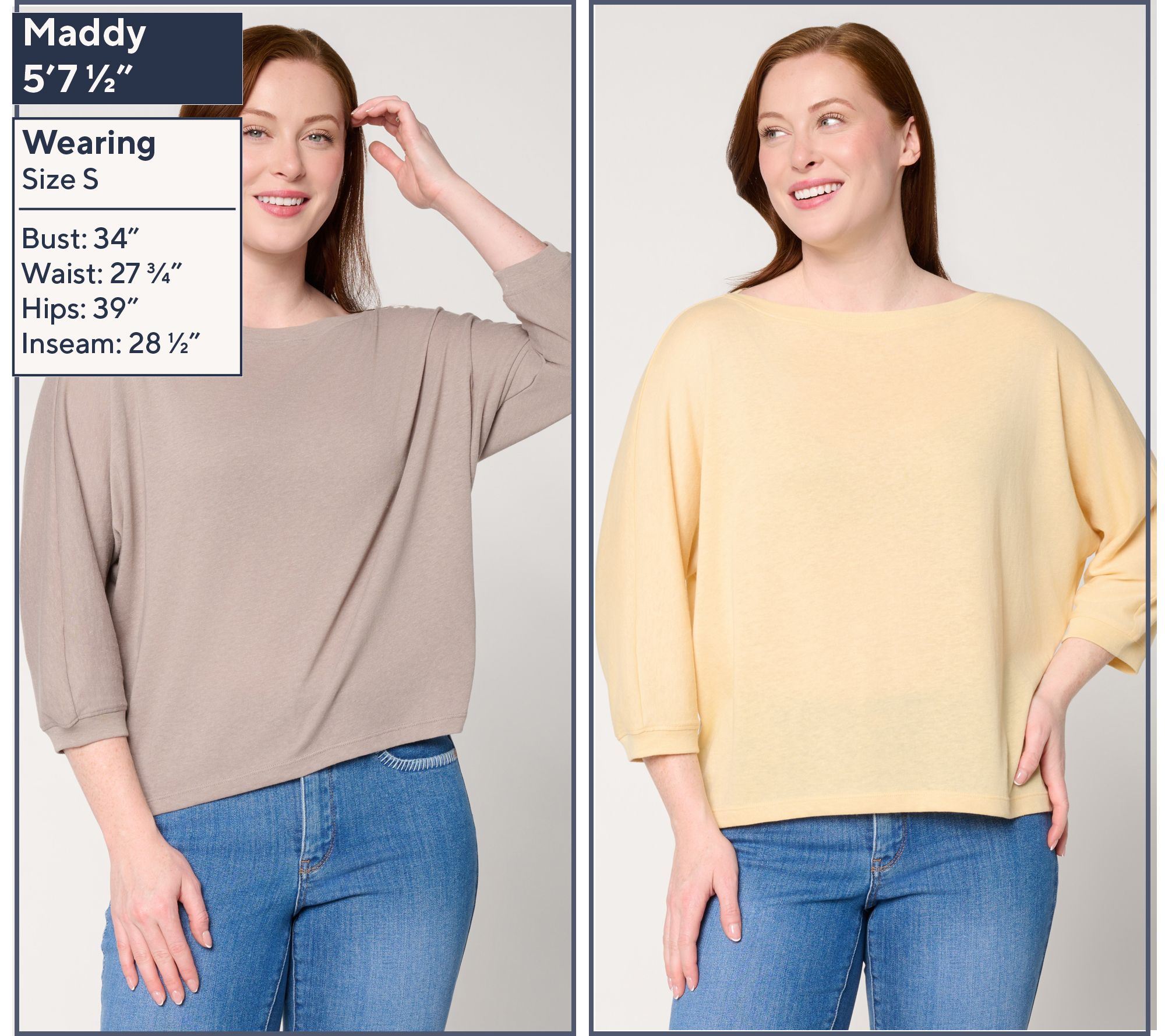 Features: boat neckline, short dolman sleeves, ribbed crew neckline and sleeve cuffs, slight hi-low hem
