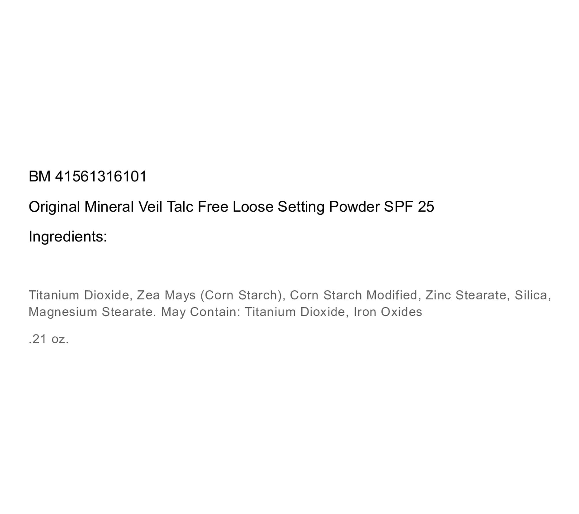 Mineral Veil Talc Free Loose Setting Powder SPF 25 from bareMinerals is a weightless translucent loose setting powder with mineral SPF 25 that sets makeup and extends wear -- all while blurring the look of pores and fine lines for a soft matte finish. It sets makeup and extends wear. It helps temporarily minimizes the look of pores and fine lines and absorbs excess oil. It delivers an airbrushed, soft matte finish. Pairs well with all bareMinerals foundations.
