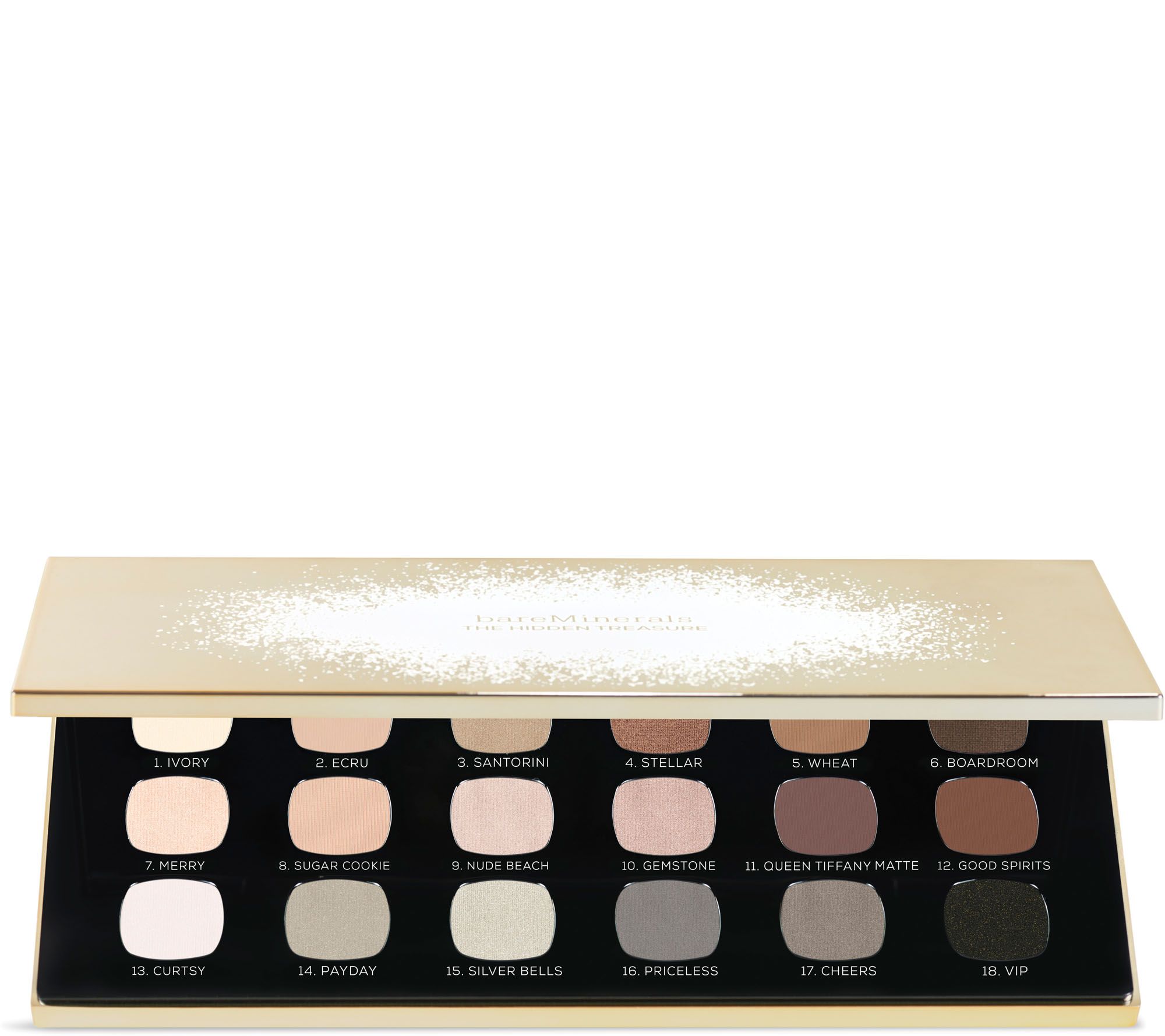 One luxurious palette, 18 coveted eye shadows. This bareMinerals holiday The Hidden Treasure eye shadow palette gives you a mix of matte, satin, and metallic finishes. These sophisticated READY neutral shades, in soft matte to rich metallic finishes, provide seamless blendability and pigment-packed color that lasts.