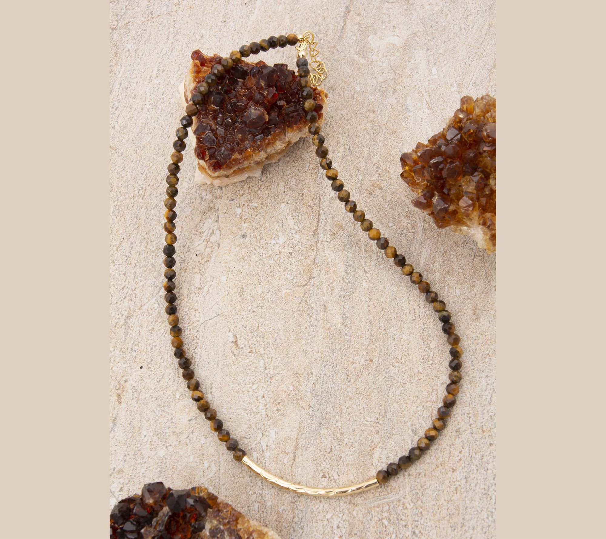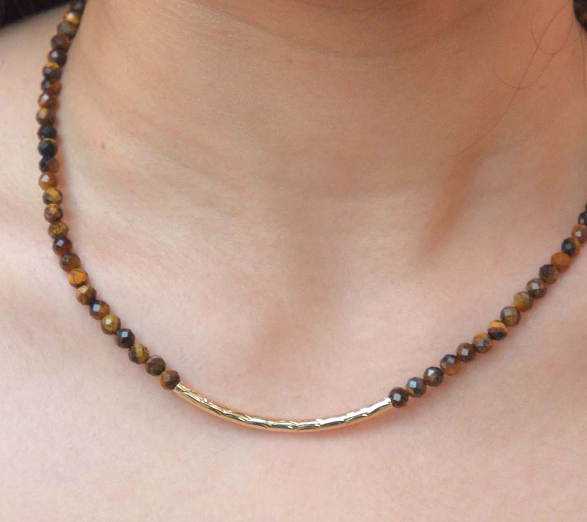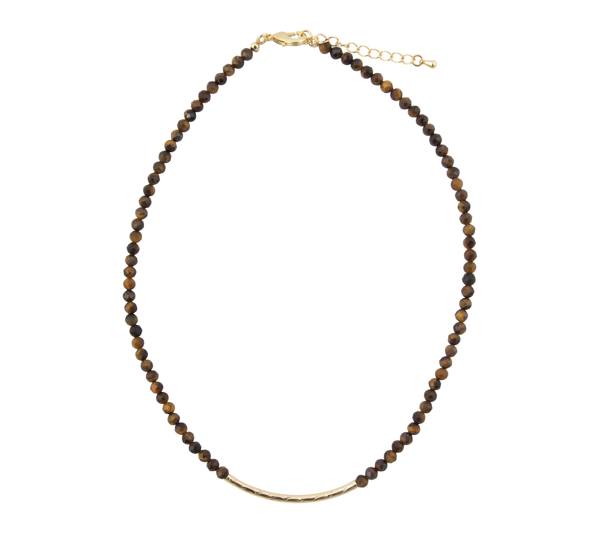 Round tiger's eye beads; golden bar accent; polished finish