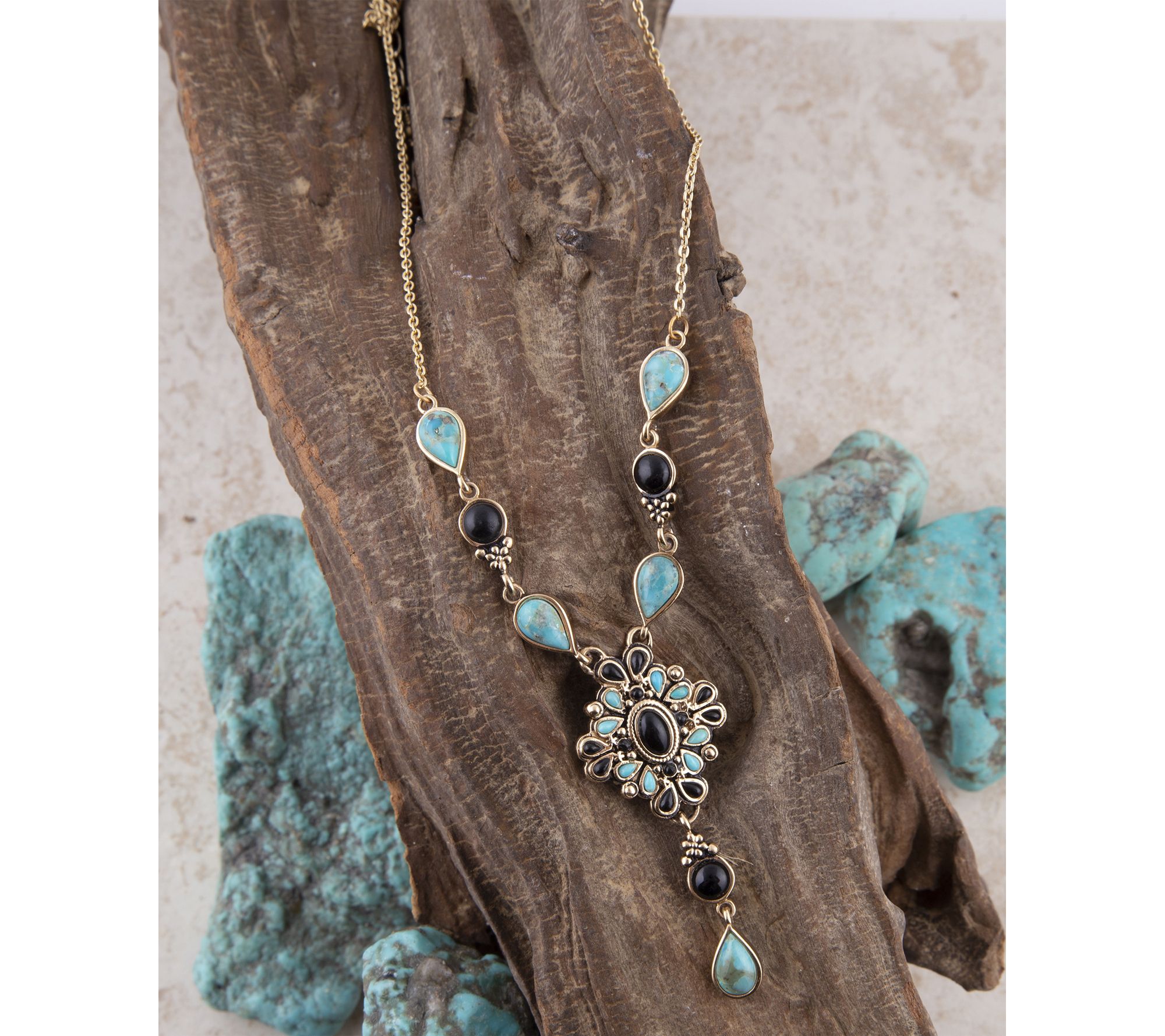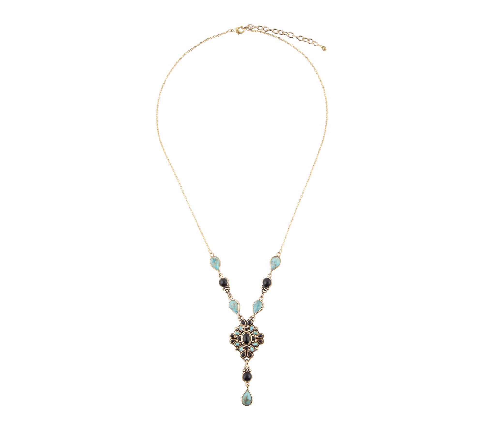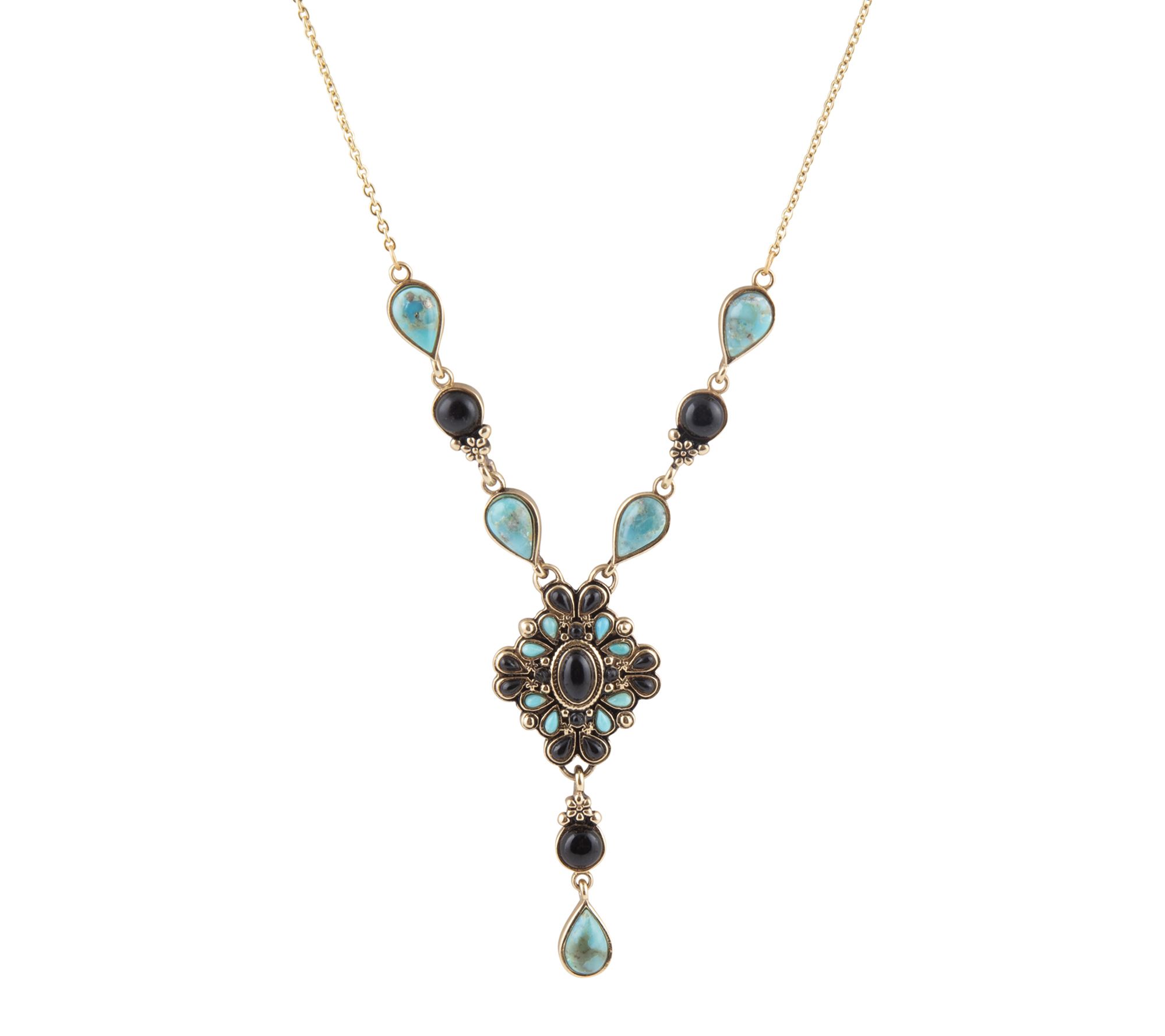 Let the vivid colors of turquoise and onyx bring a touch of artistic flair to everyday outfits or special occasions. This Y-necklace features artisan-crafted bronze, paired with eye-catching pear-cut gemstones bezel-set to create a look that's both expressive and versatile. From Barse.