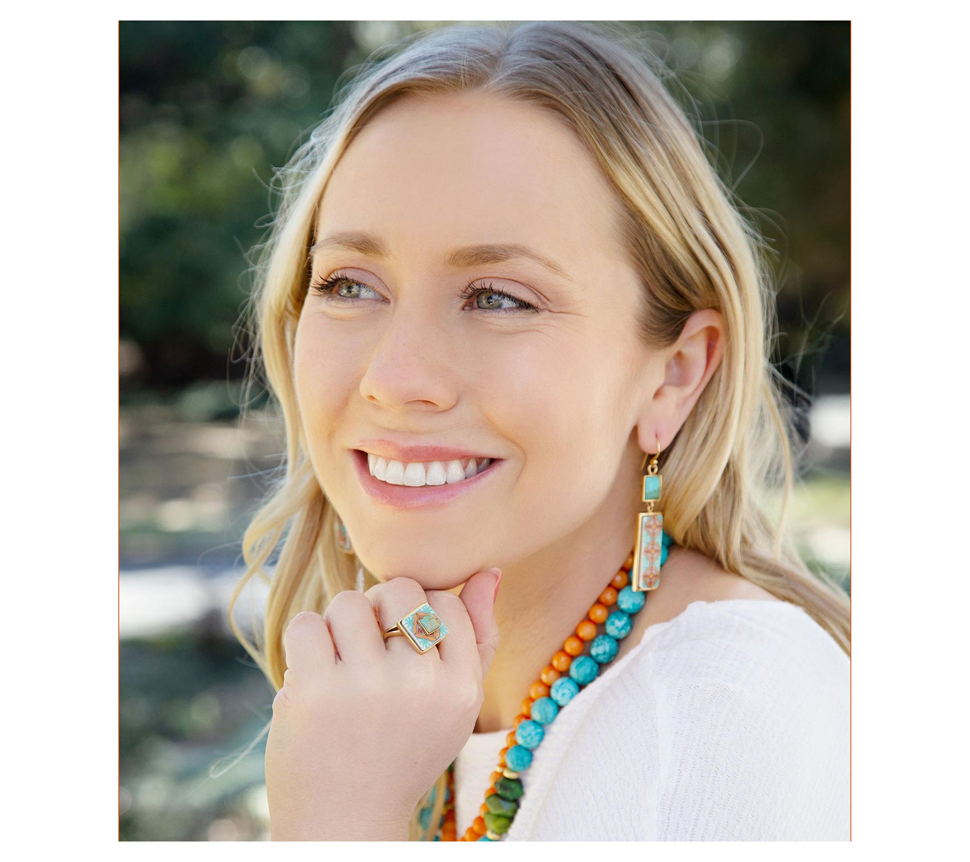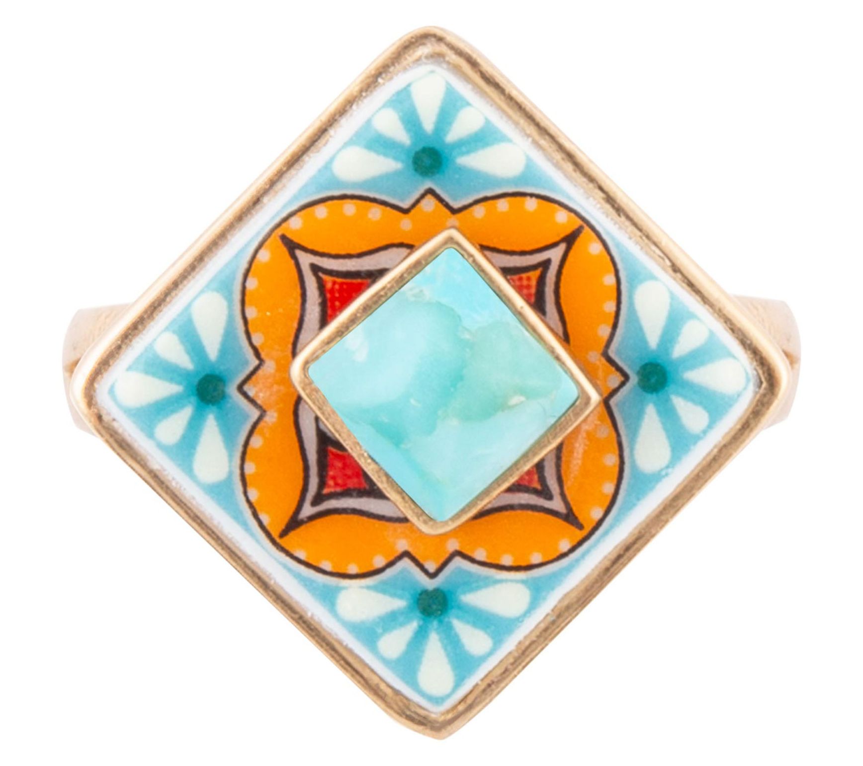 A bold burst of color for any day, this cocktail ring showcases a stunning kite-cut blue composite turquoise set in glossy goldtone bronze, making every glance at your hand a moment of delight. Whether paired with your favorite denim or a flowing dress, its vibrant stone brings artistic flair and individuality to every look.