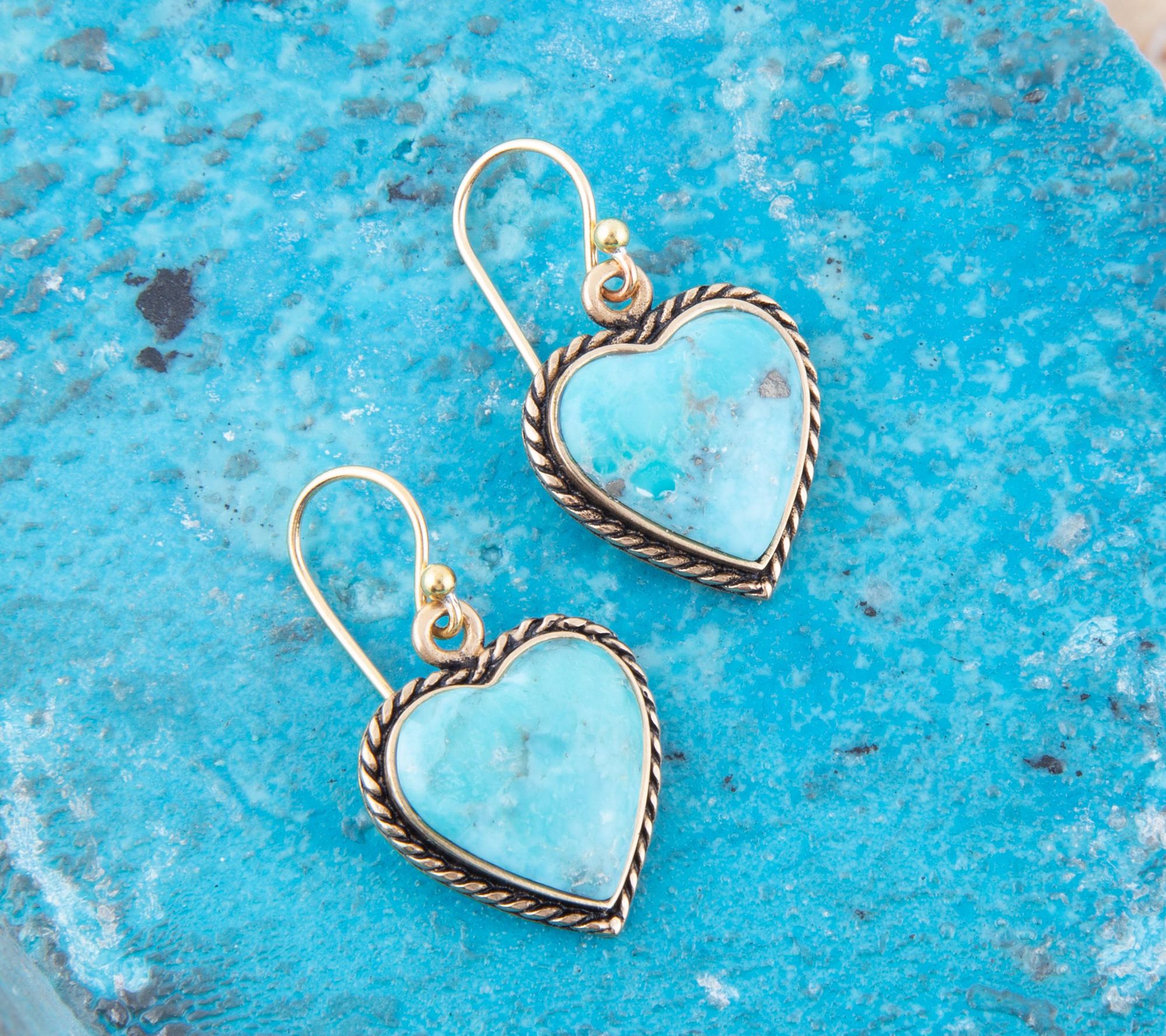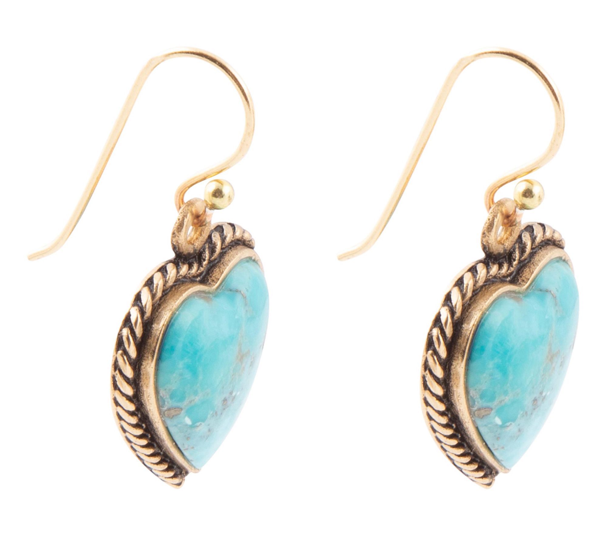 Accessory love! These heart-shaped dangle earrings showcase rich-looking composite turquoise. From Barse Jewelry.