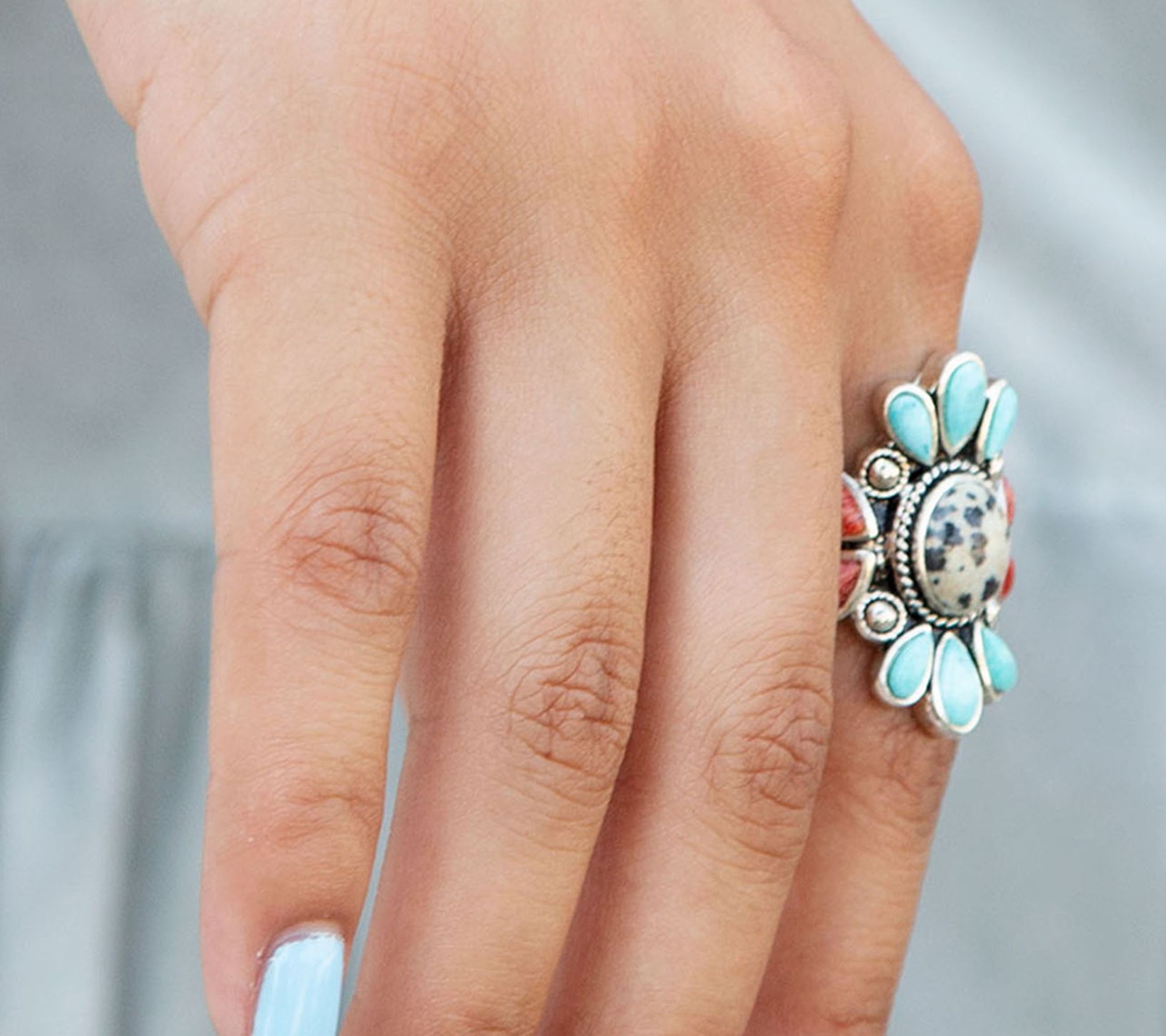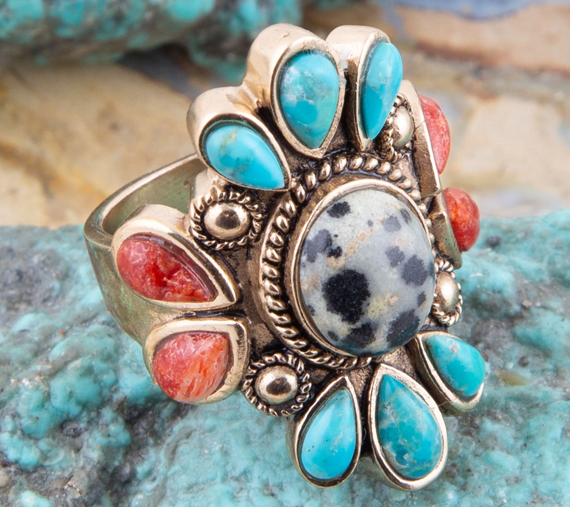 Slip on this artisan crafted cocktail ring and let its playful mix of Dalmatian jasper, rich turquoise, and vibrant coral turn everyday moments into something special. The bold north-south design adds eye-catching texture and color, whether paired with your favorite little black dress or a casual ensemble. From Barse.